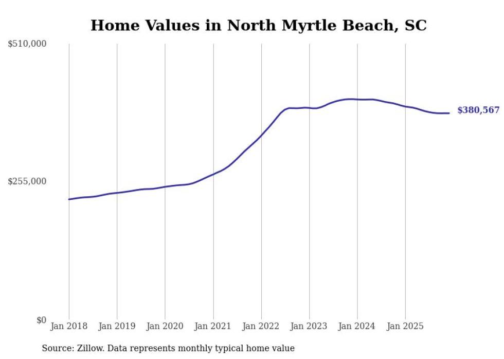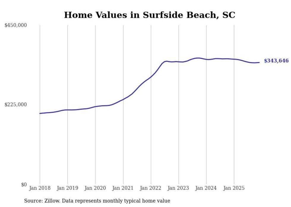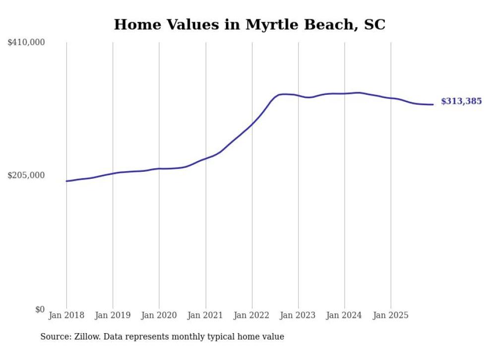 Stacker compiled a list of cities with the most expensive homes in the Myrtle Beach metro area using data from Zillow. Charts show the monthly typical home value since January 2018. Data was available for 31 cities and towns.