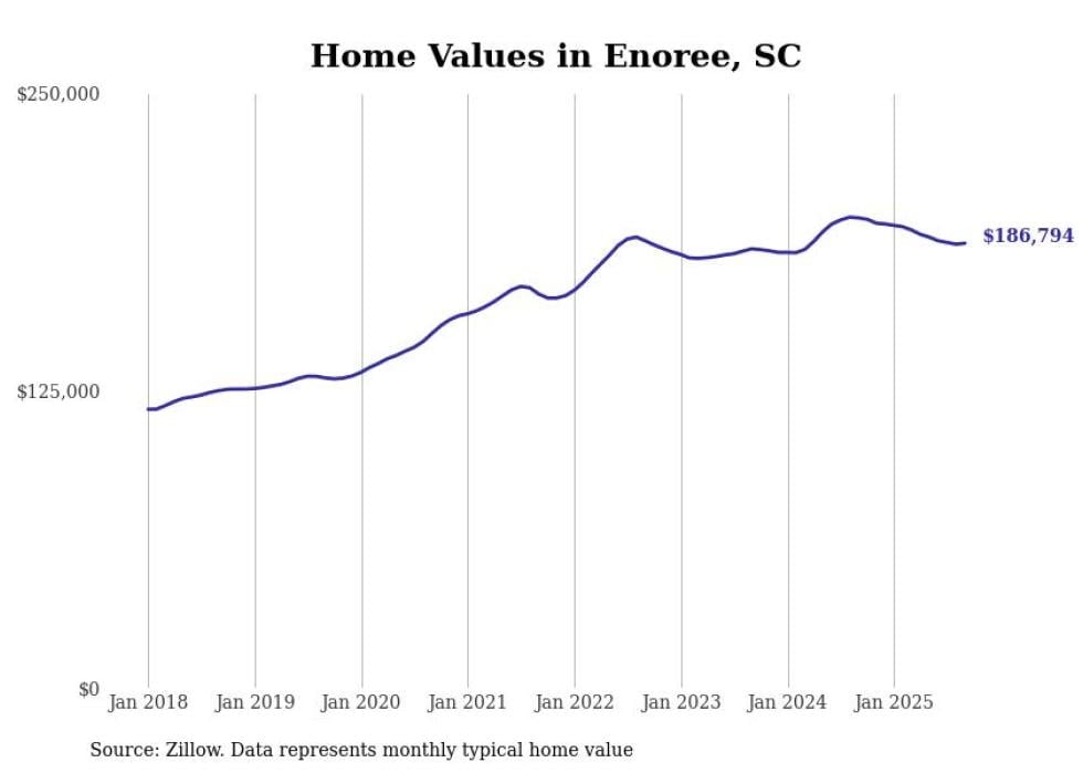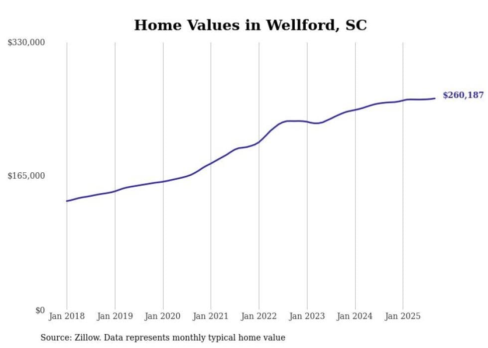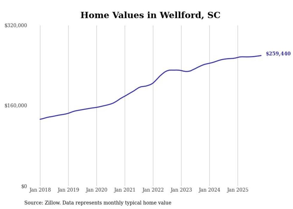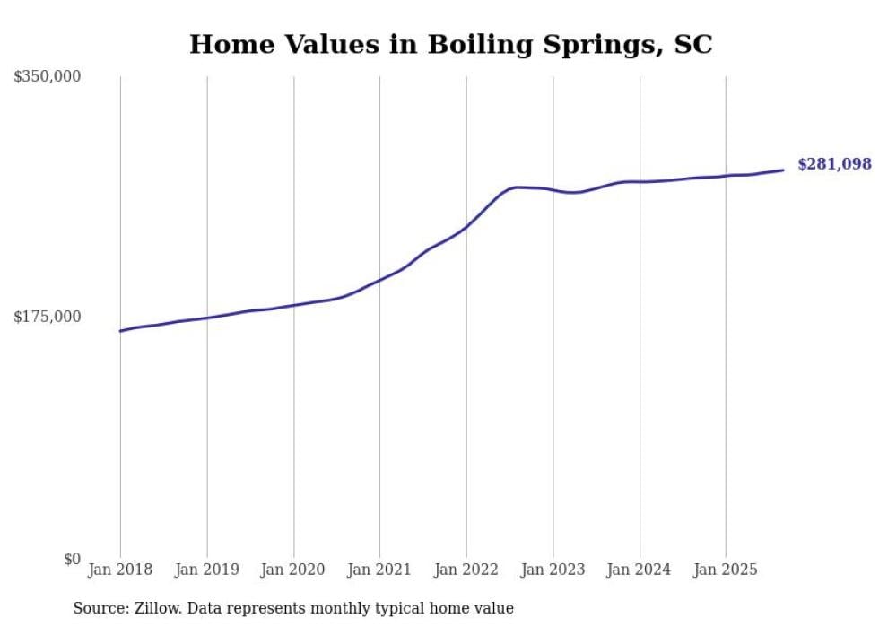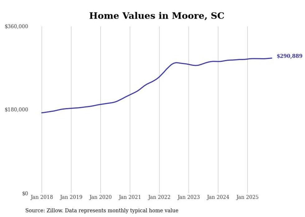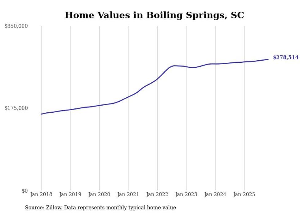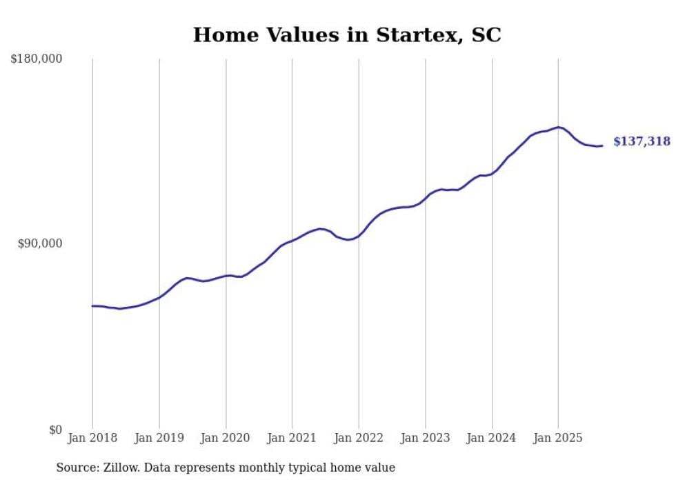 Stacker compiled a list of cities with the most expensive homes in the Spartanburg, SC metro area using data from Zillow. Charts show the monthly typical home value since January 2018.