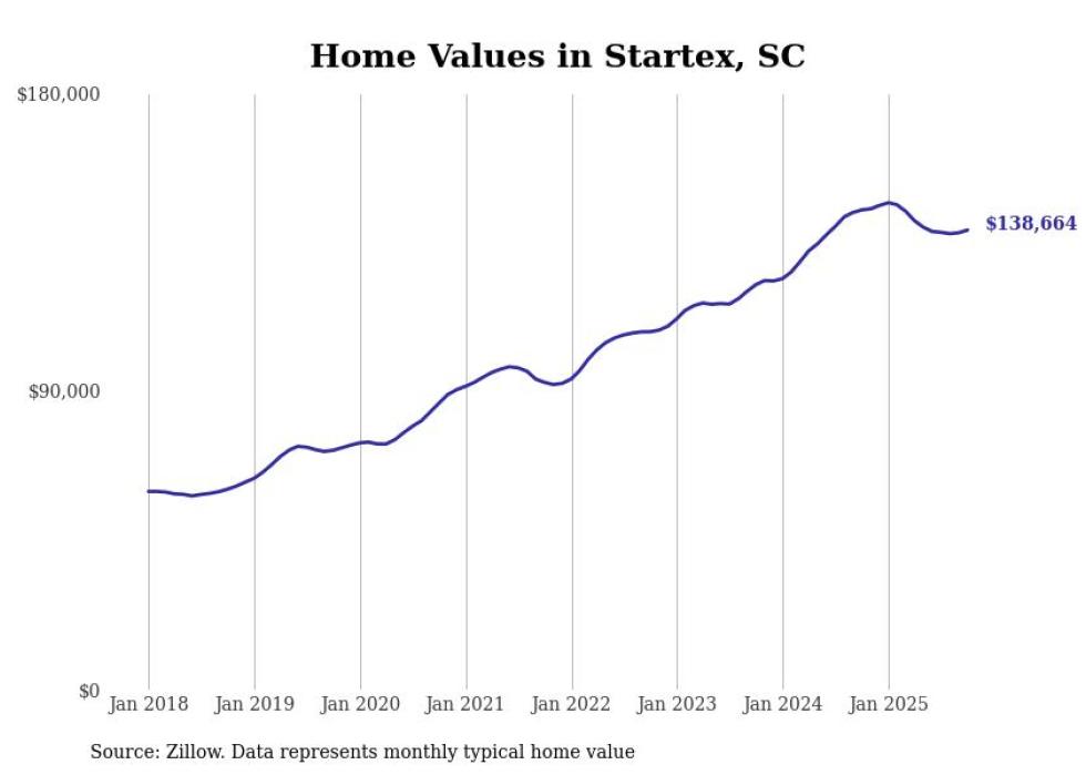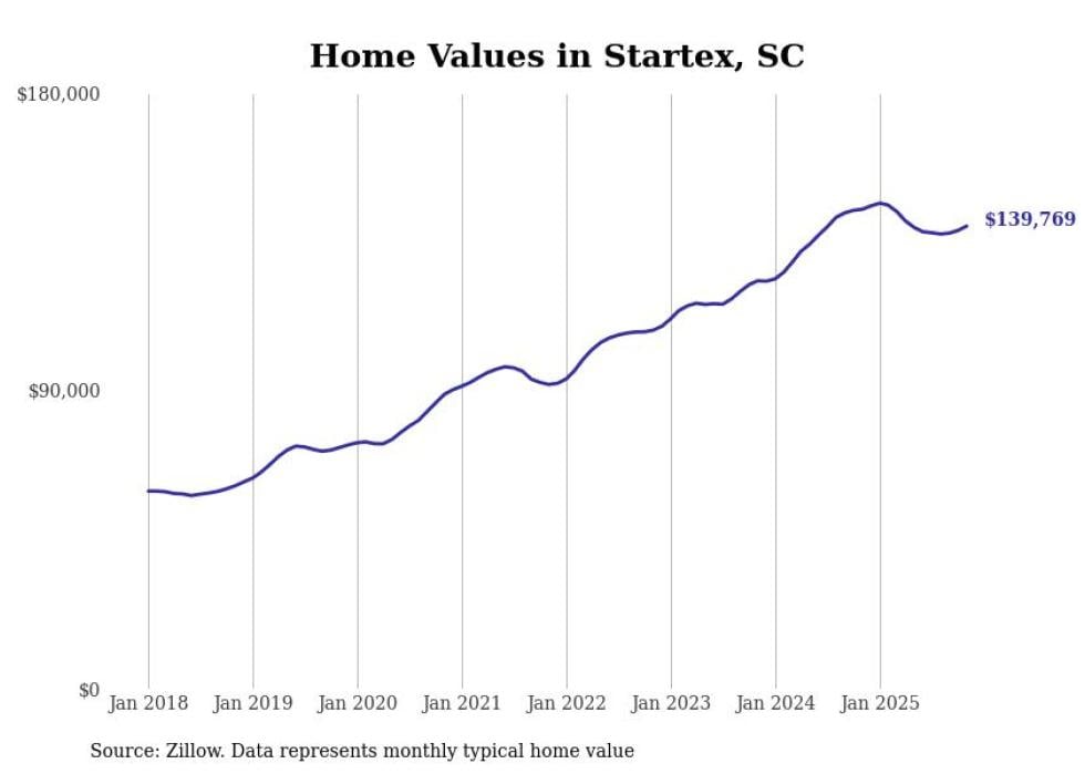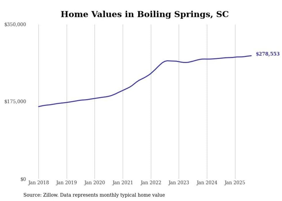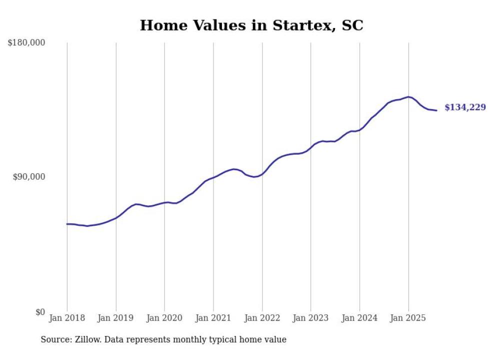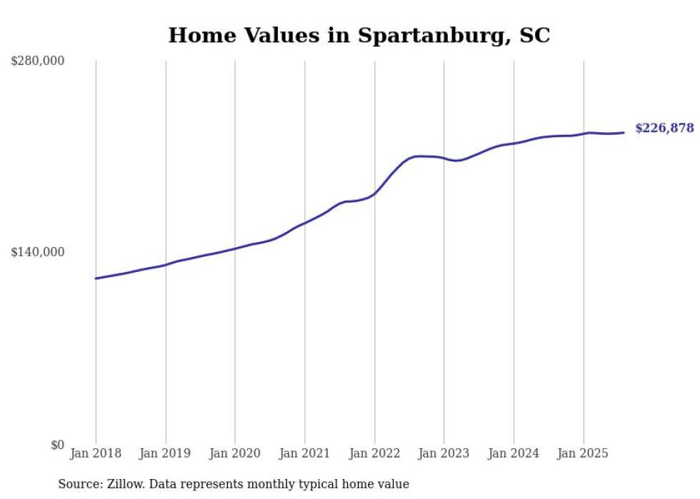 Stacker compiled a list of cities with the most expensive homes in the Spartanburg metro area using data from Zillow. Charts show the monthly typical home value since January 2018. All 15 cities and towns with data available were included in the list.