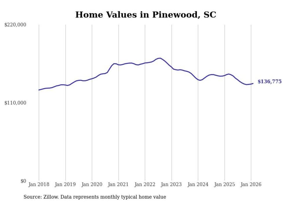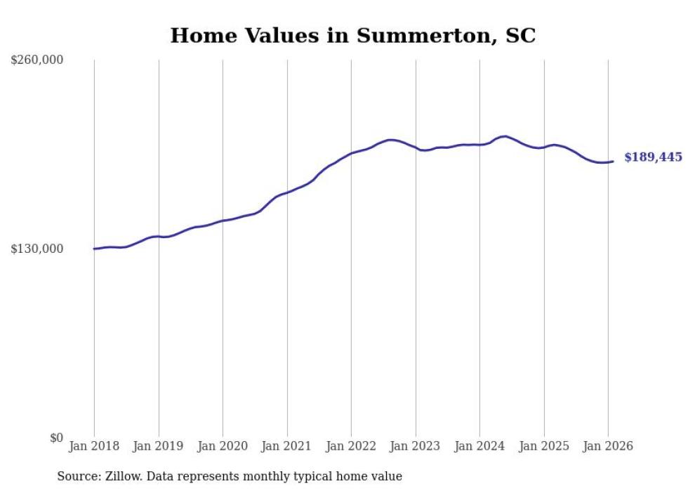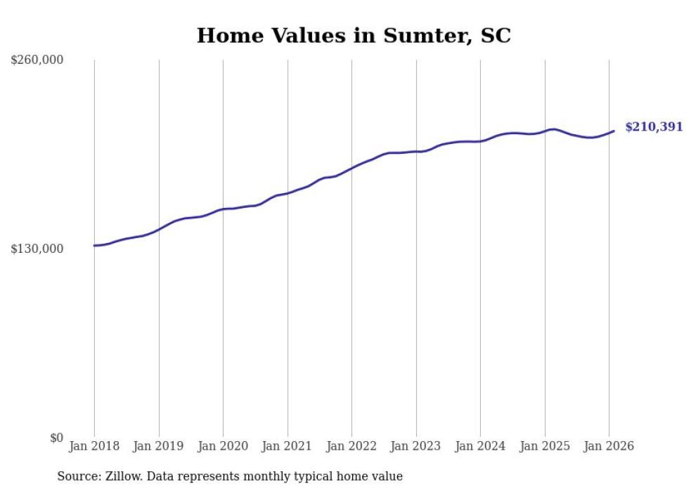 Stacker compiled a list of cities with the most expensive homes in the Sumter metro area using data from Zillow. Charts show the monthly typical home value since January 2018. All 14 cities and towns with data available were included in the list.