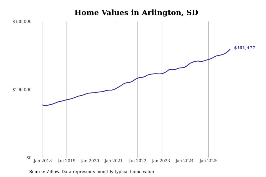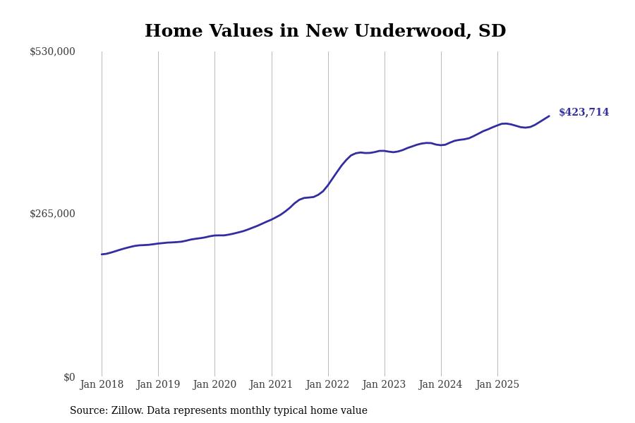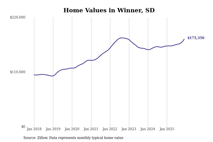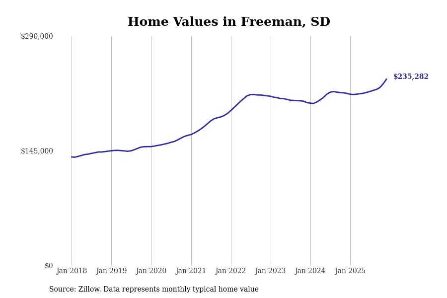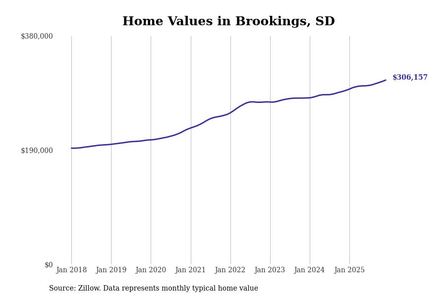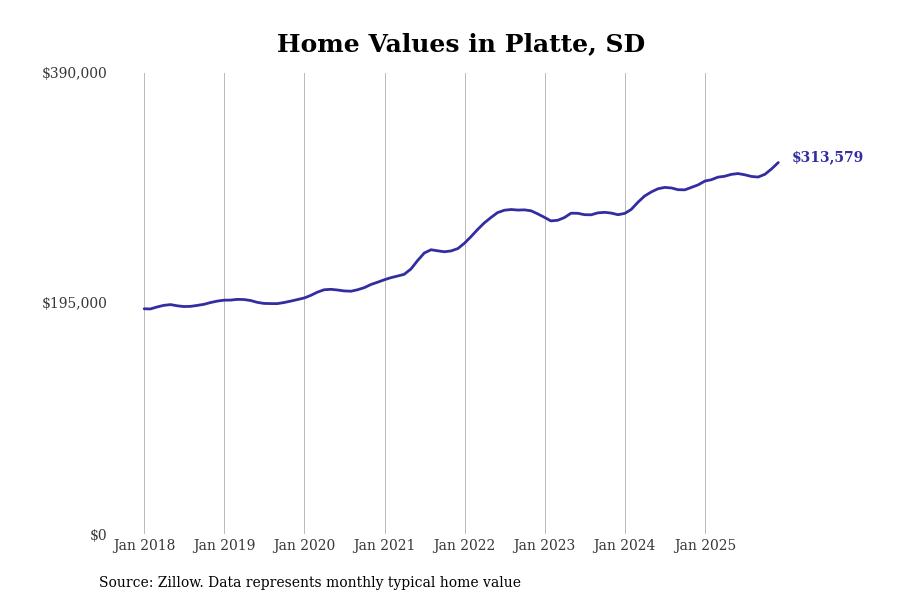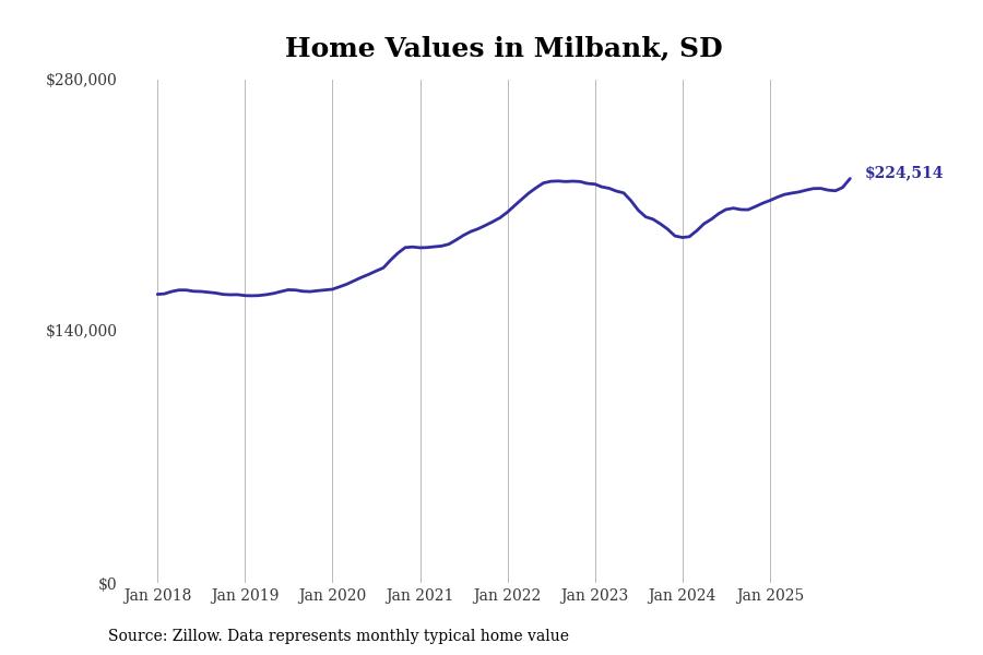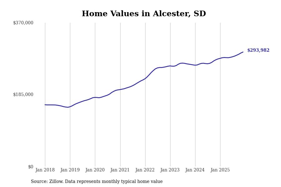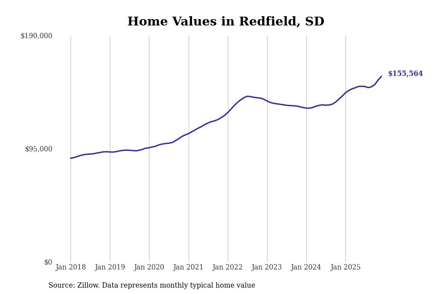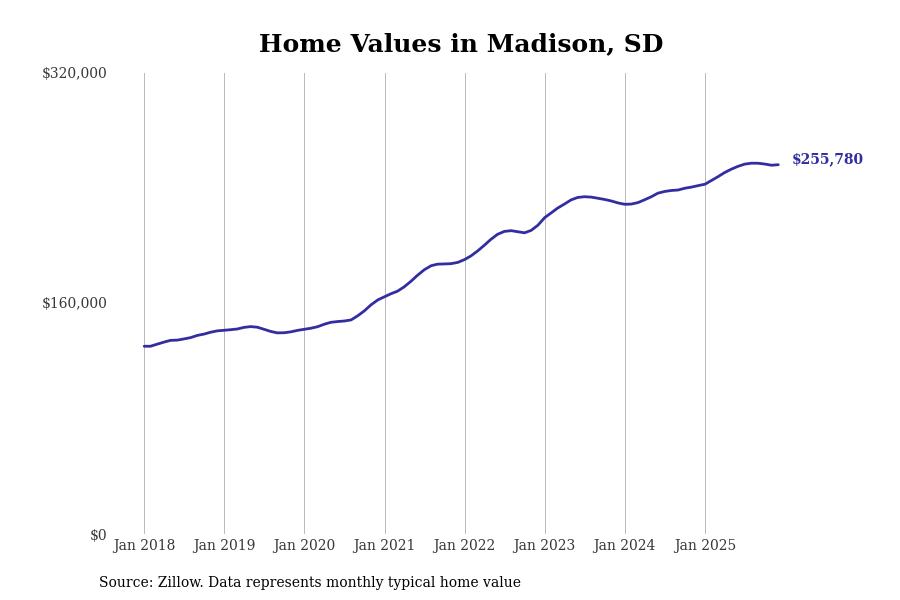 Stacker compiled a list of cities with the fastest-growing home prices in South Dakota using data from Zillow. Cities are ranked by the dollar change in the Zillow Home Values Index for all homes from the 12 months ending December 2025. The charts in this story were created automatically using Matplotlib. Data was available for 50 cities and towns in South Dakota.