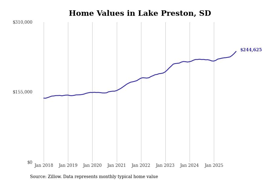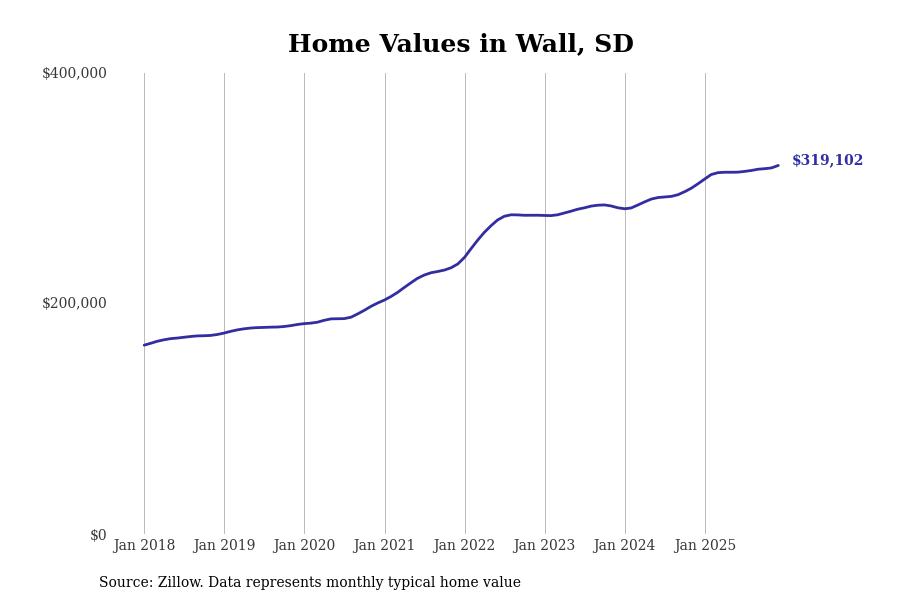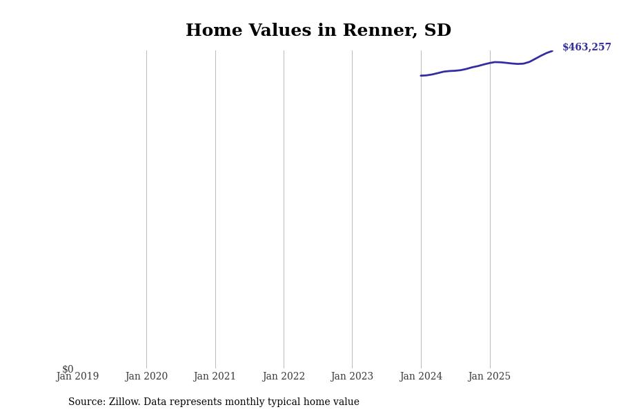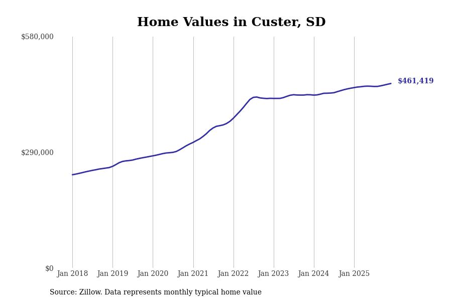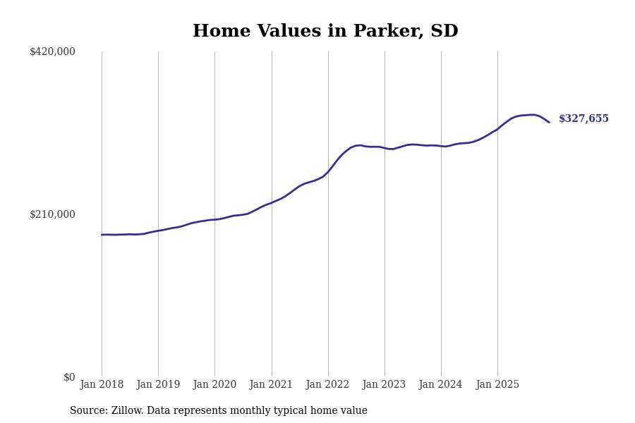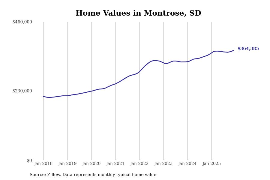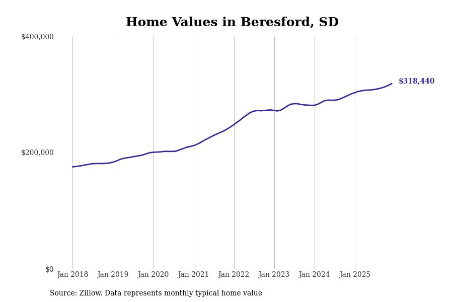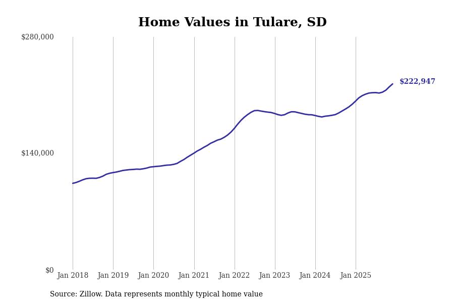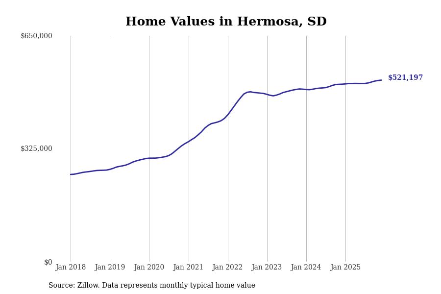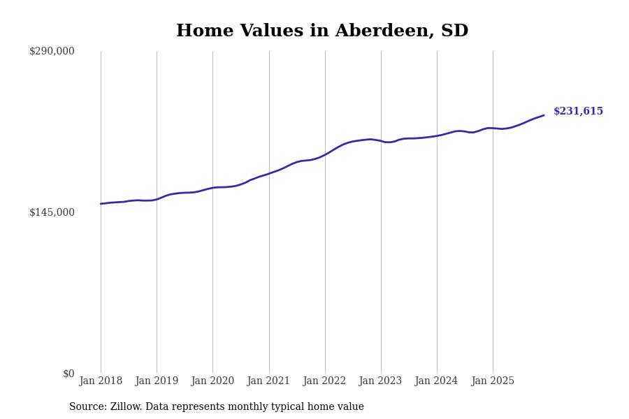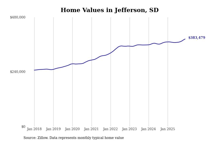 Stacker compiled a list of cities with the fastest-growing home prices in South Dakota using data from Zillow. Cities are ranked by the dollar change in the Zillow Home Values Index for all homes from the 12 months ending December 2025. The charts in this story were created automatically using Matplotlib. Data was available for 50 cities and towns in South Dakota.