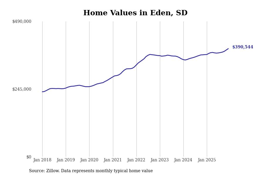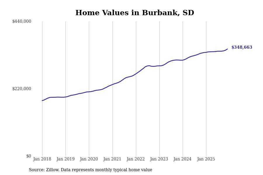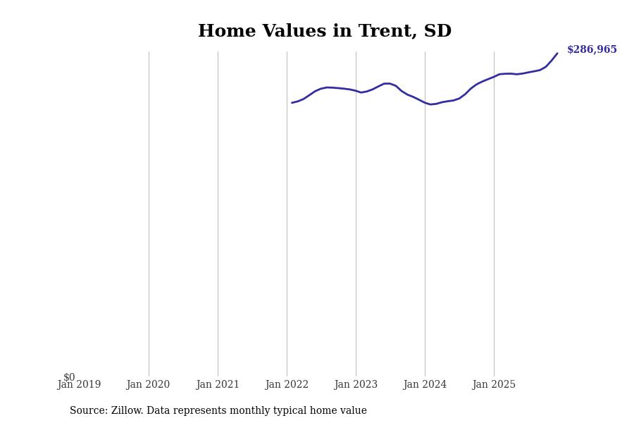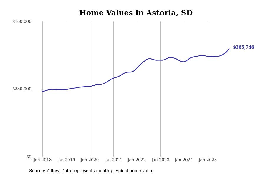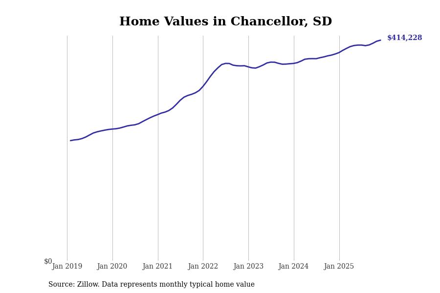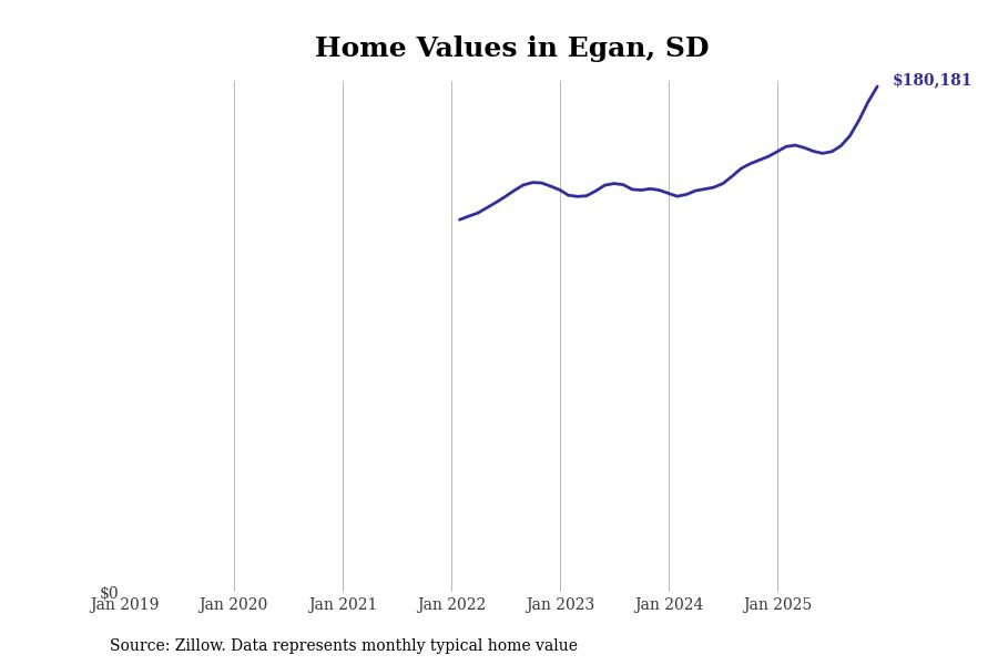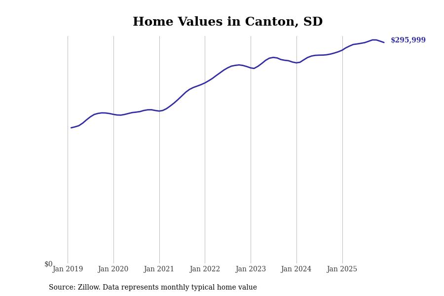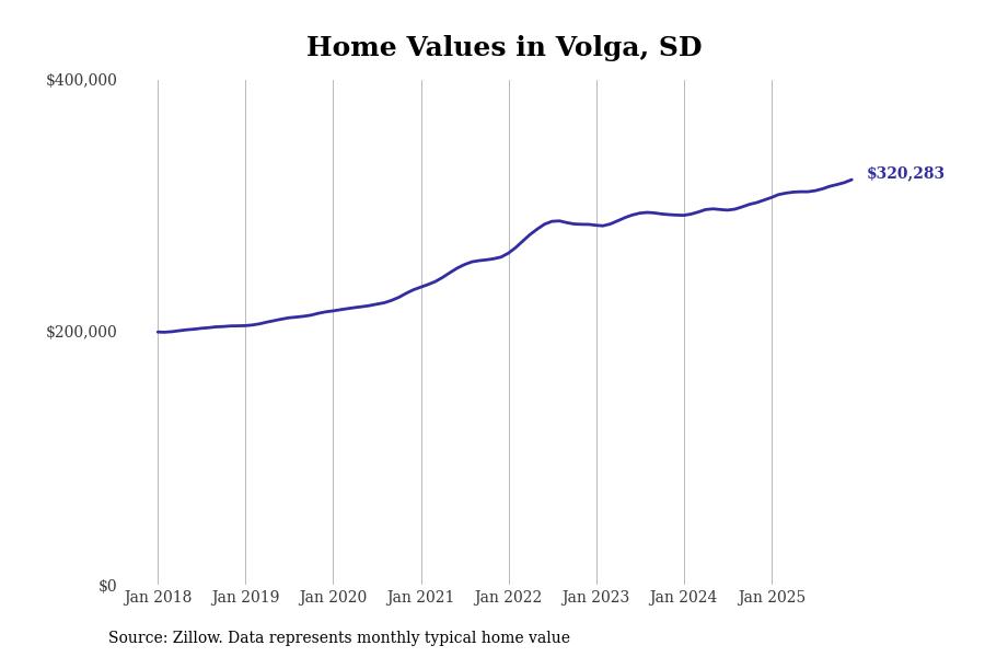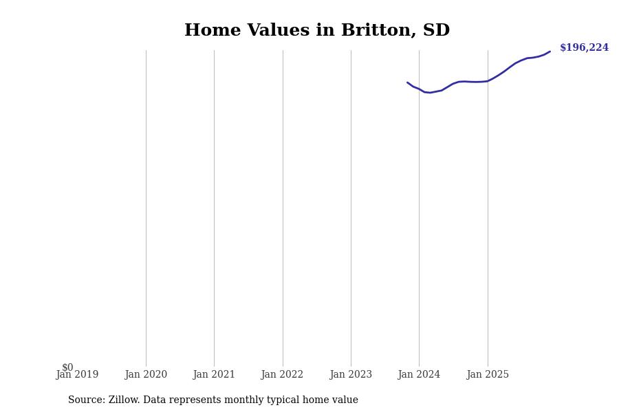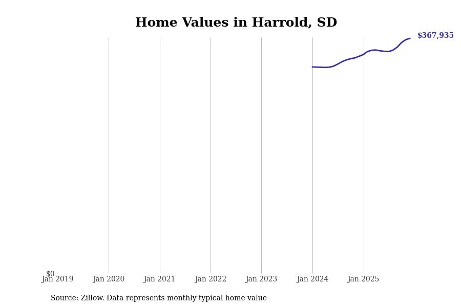 Stacker compiled a list of cities with the fastest-growing home prices in South Dakota using data from Zillow. Cities are ranked by the dollar change in the Zillow Home Values Index for all homes from the 12 months ending December 2025. The charts in this story were created automatically using Matplotlib. Data was available for 50 cities and towns in South Dakota.