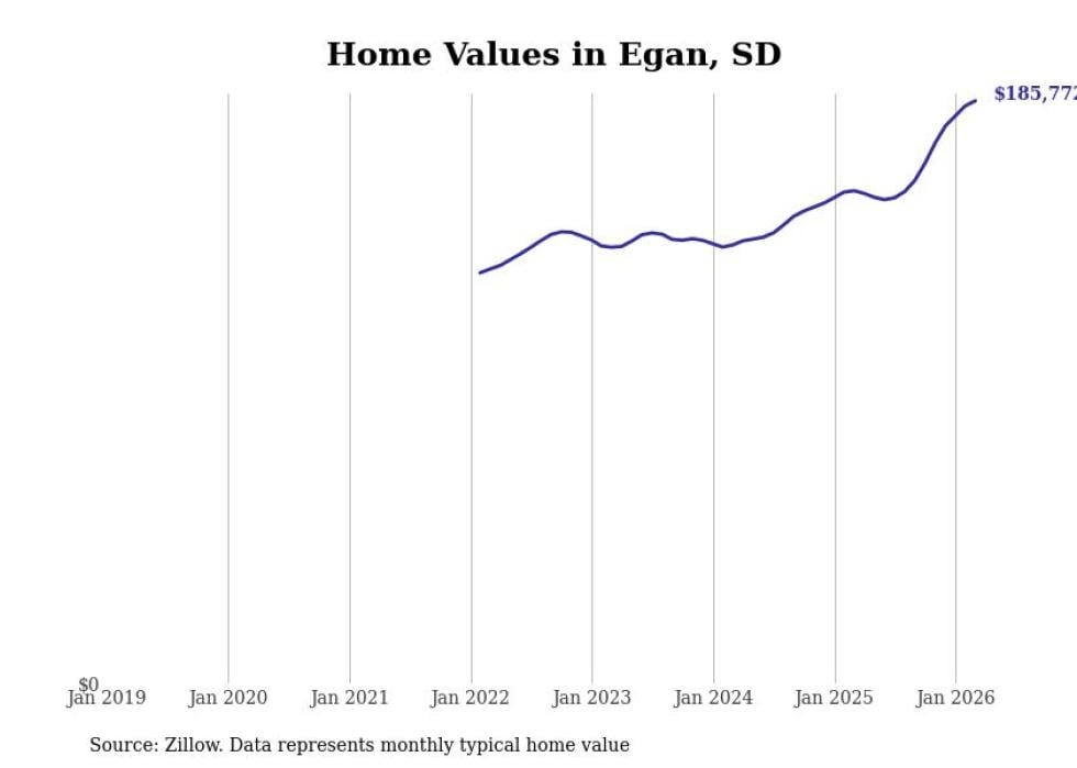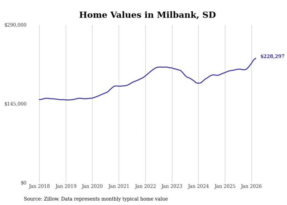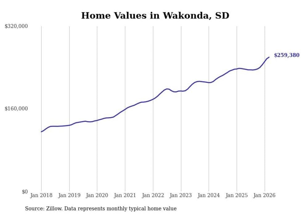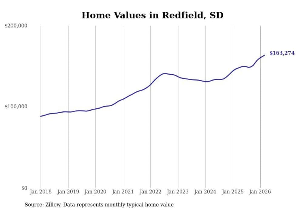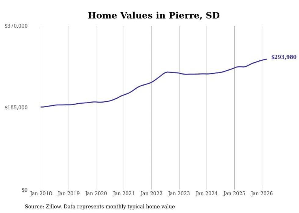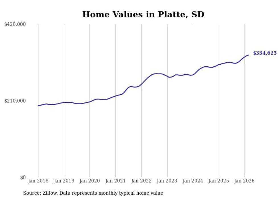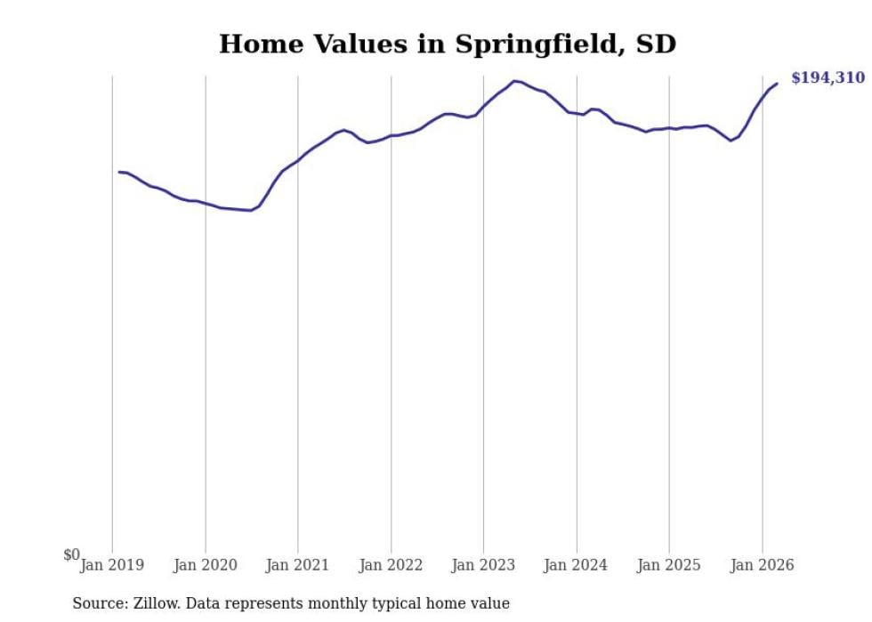 Stacker compiled a list of cities with the fastest-growing home prices in South Dakota using data from Zillow. Cities are ranked by the dollar change in the Zillow Home Values Index for all homes from the 12 months ending March 2026. The charts in this story were created automatically using Matplotlib. Data was available for 50 cities and towns in South Dakota.