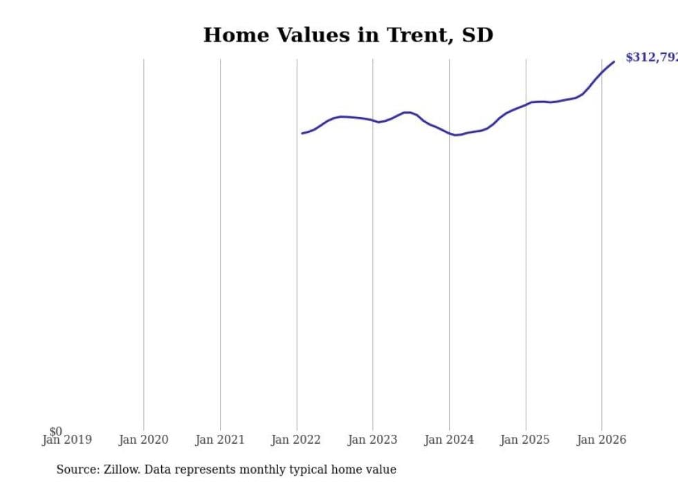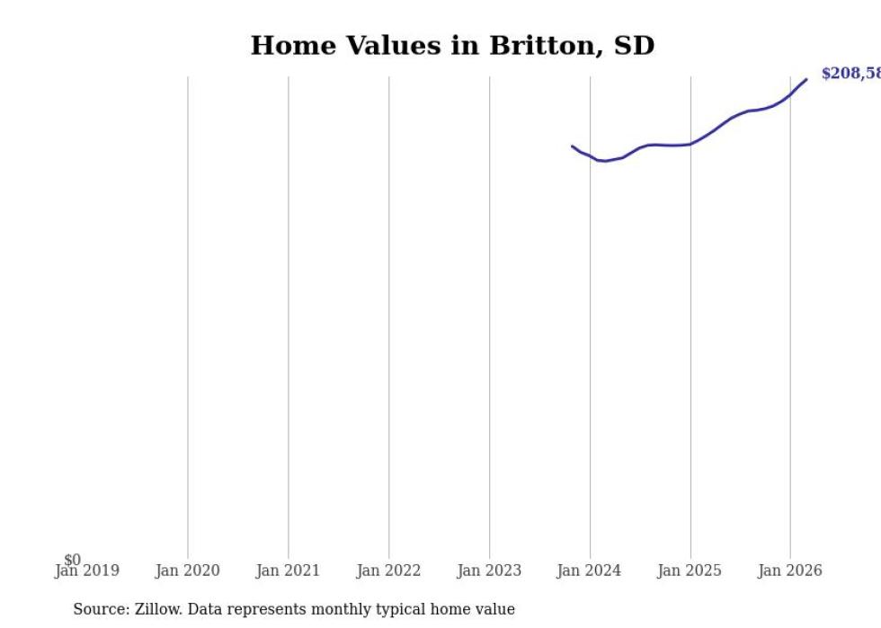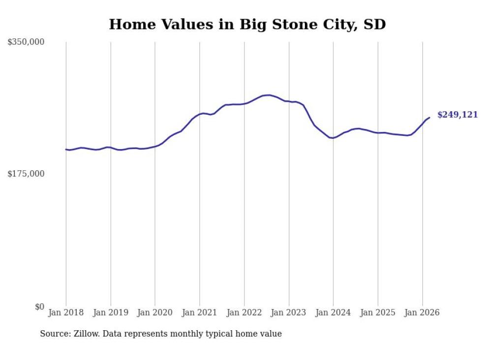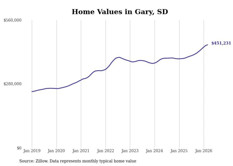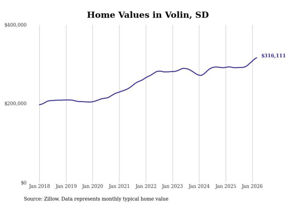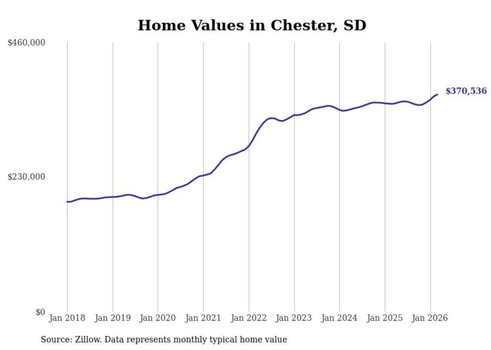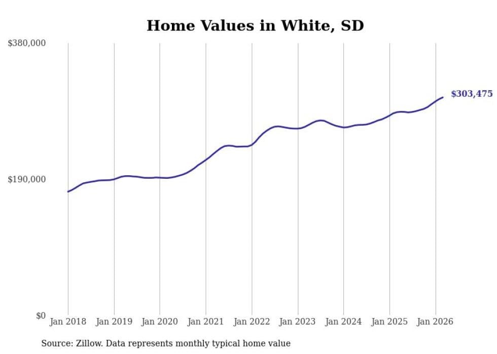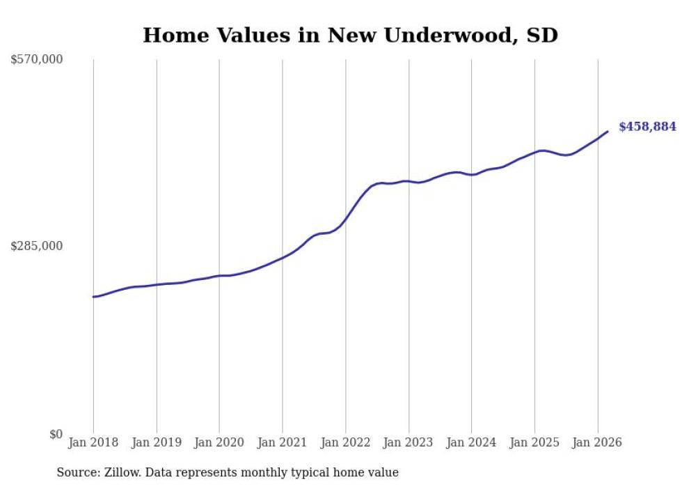Stacker compiled a list of cities with the fastest-growing home prices in South Dakota using data from Zillow. Cities are ranked by the dollar change in the Zillow Home Values Index for all homes from the 12 months ending March 2026. The charts in this story were created automatically using Matplotlib. Data was available for 50 cities and towns in South Dakota.