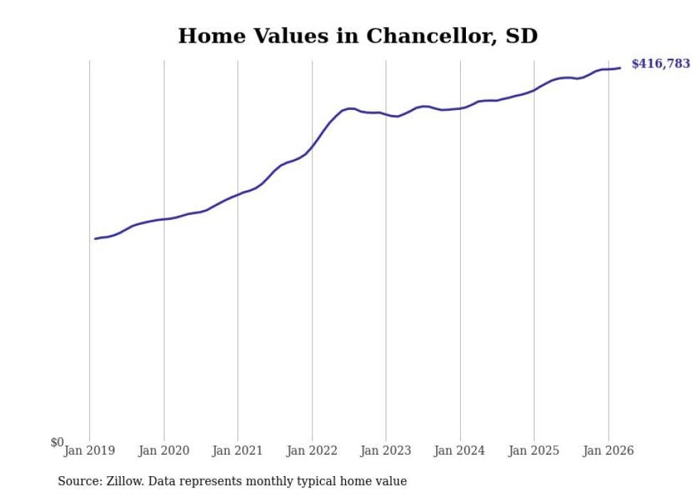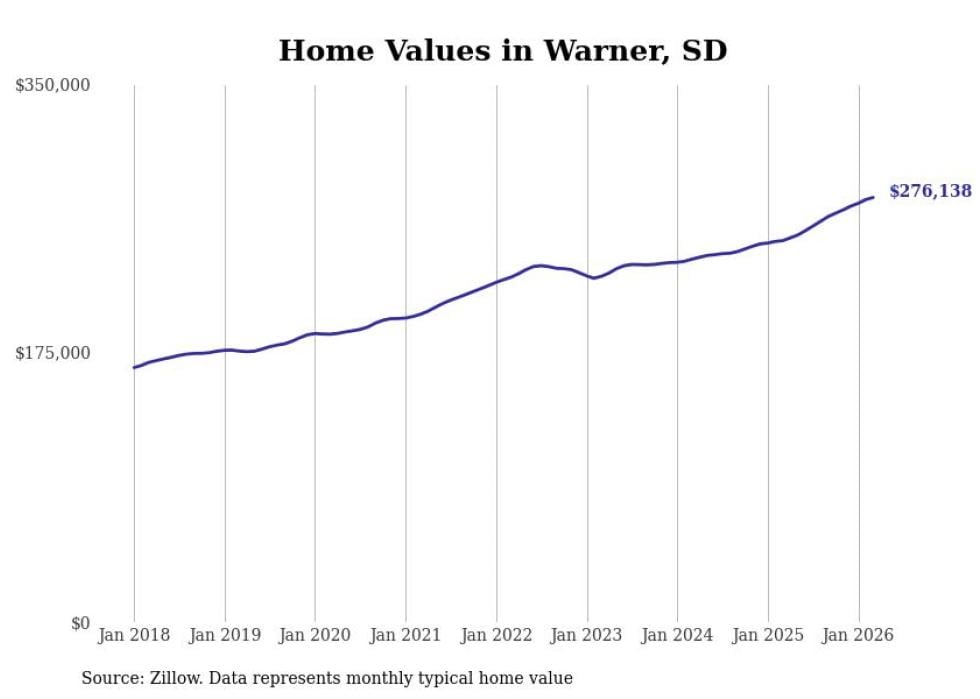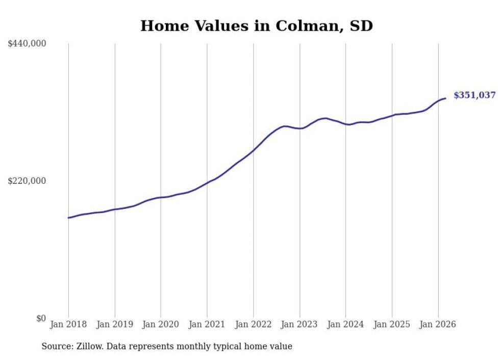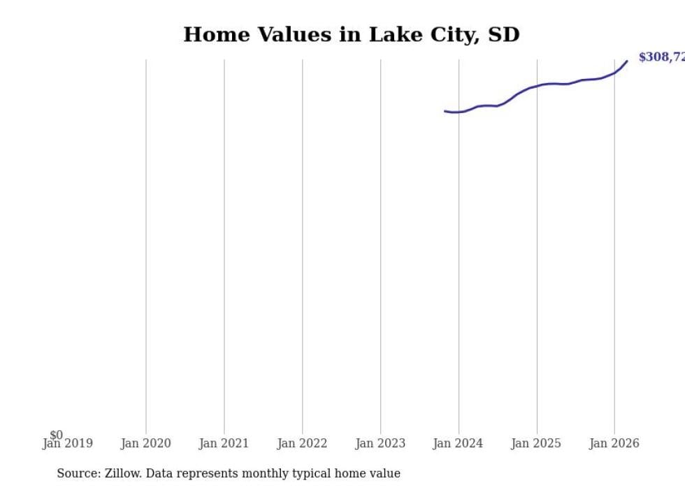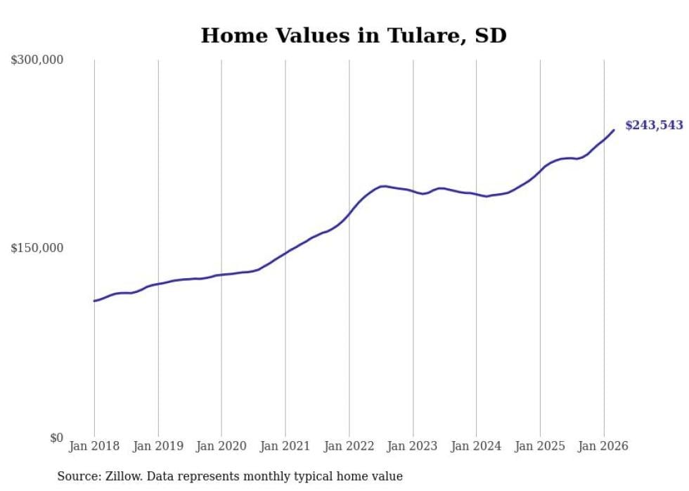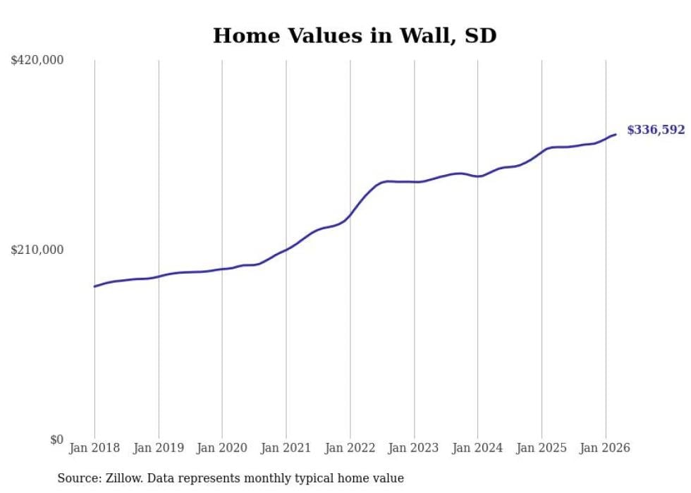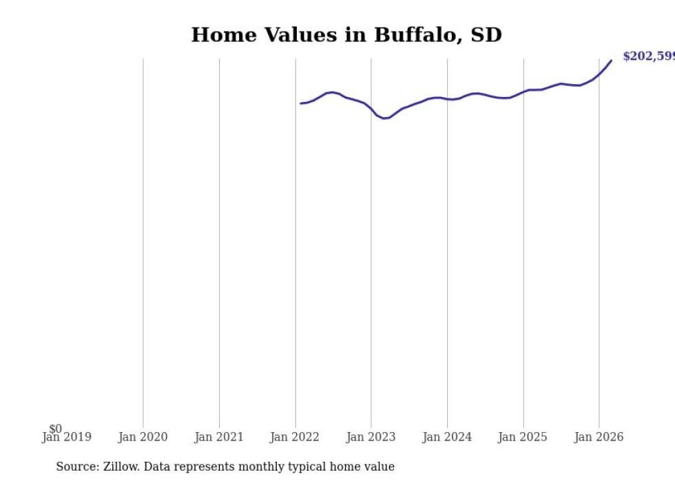 Stacker compiled a list of cities with the fastest-growing home prices in South Dakota using data from Zillow. Cities are ranked by the dollar change in the Zillow Home Values Index for all homes from the 12 months ending March 2026. The charts in this story were created automatically using Matplotlib. Data was available for 50 cities and towns in South Dakota.