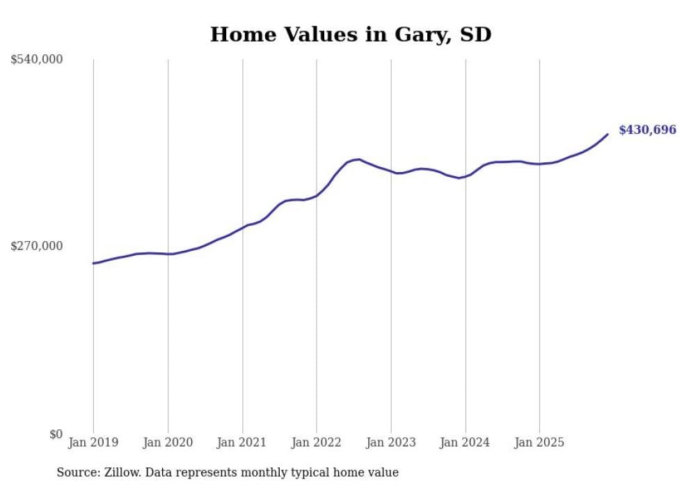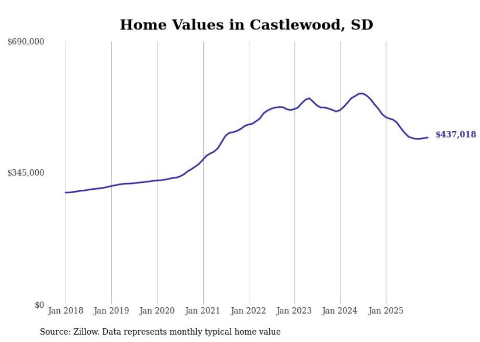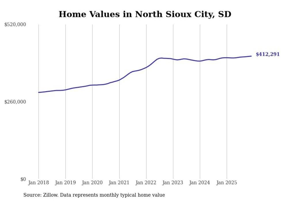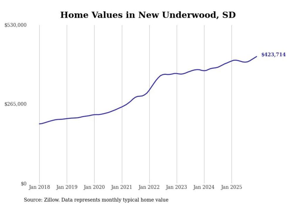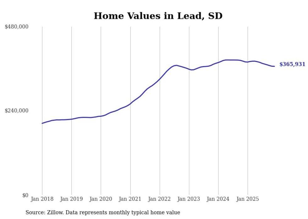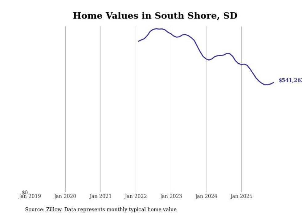 Stacker compiled a list of cities with the most expensive homes in South Dakota using data from Zillow. Cities are ranked by the Zillow Home Values Index for all homes as of December 2025. The charts in this story were created automatically using Matplotlib.