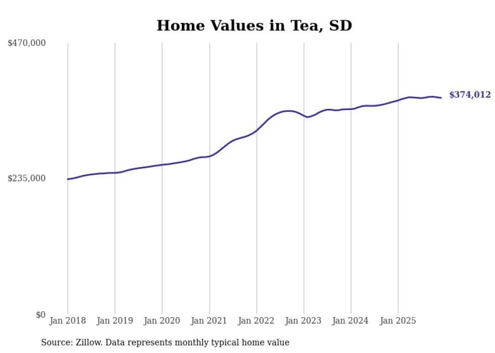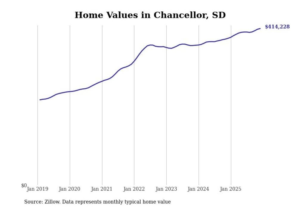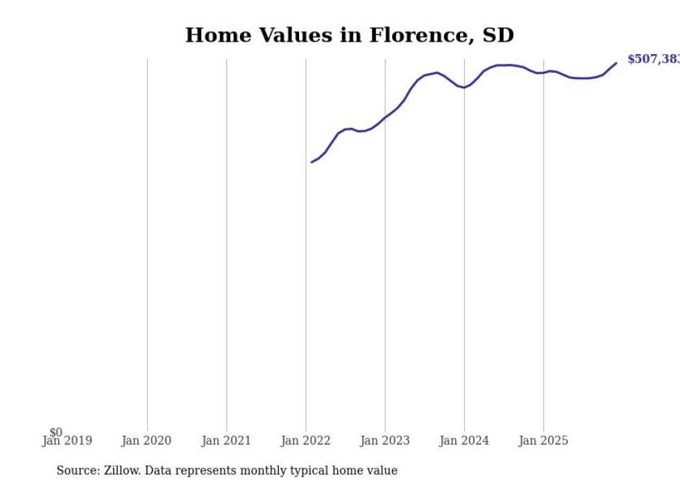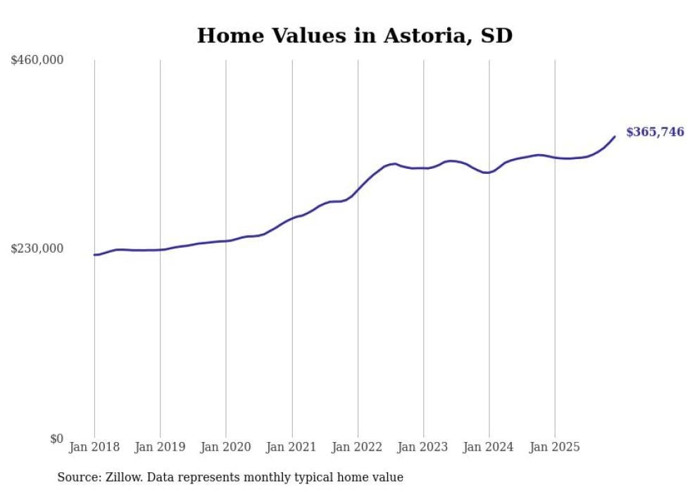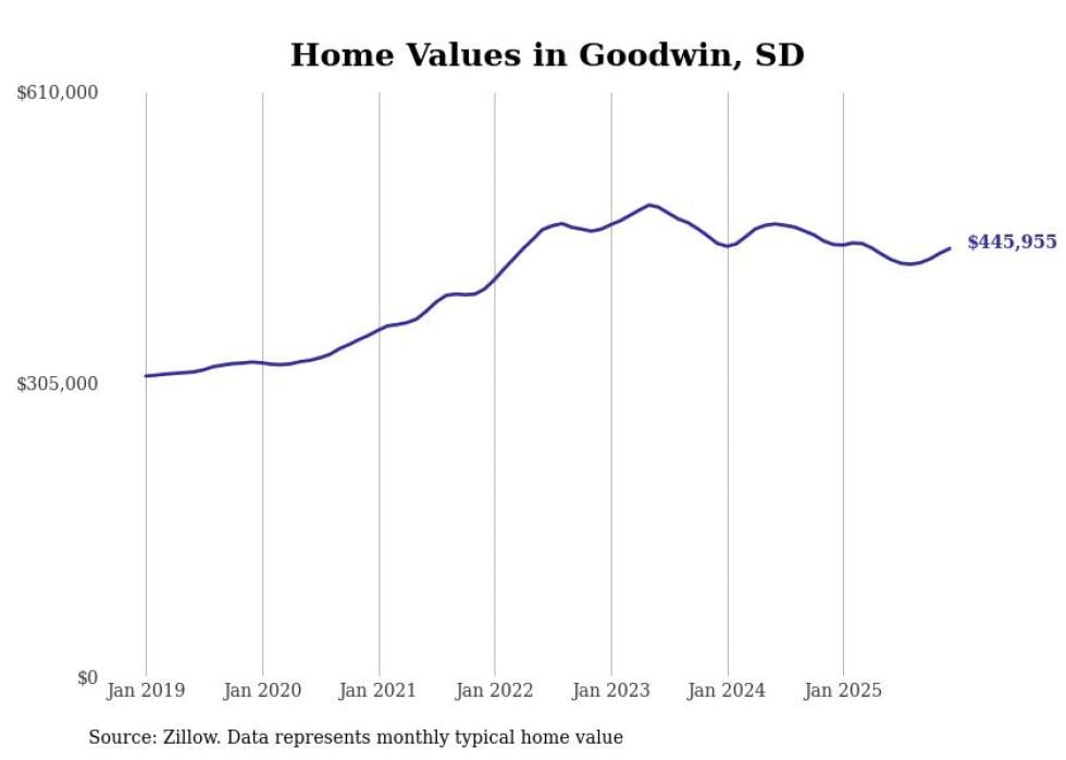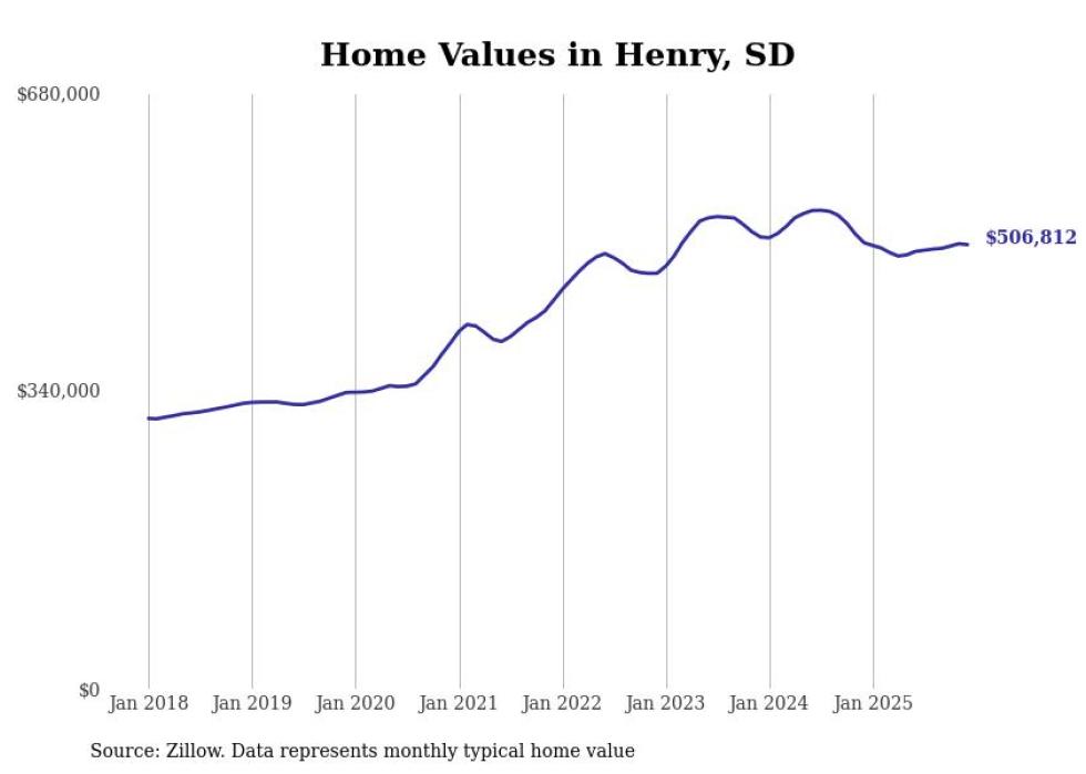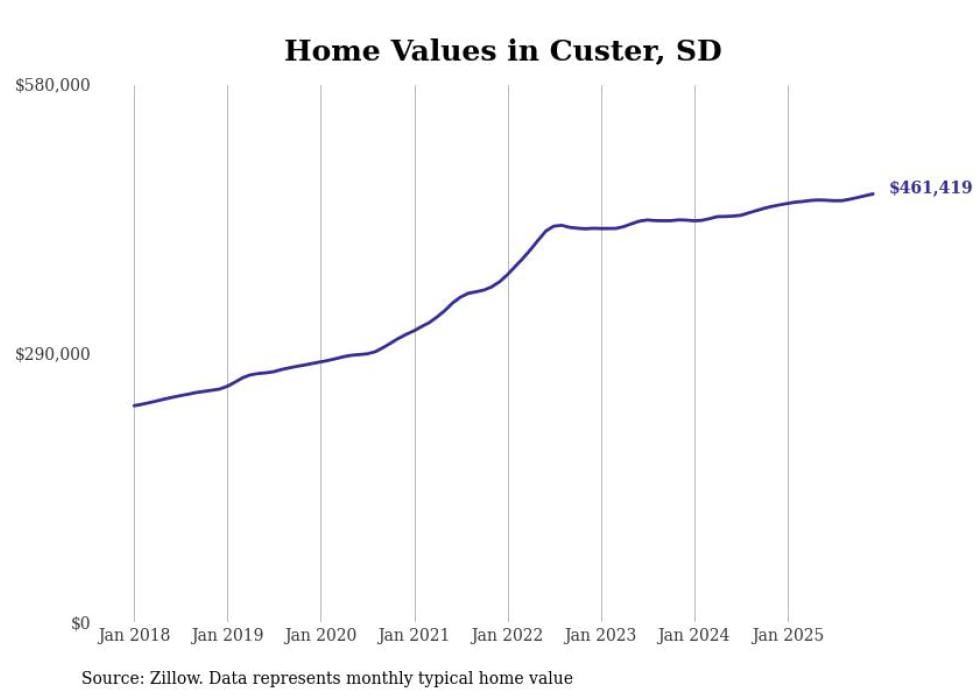 Stacker compiled a list of cities with the most expensive homes in South Dakota using data from Zillow. Cities are ranked by the Zillow Home Values Index for all homes as of December 2025. The charts in this story were created automatically using Matplotlib.