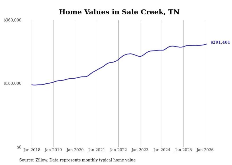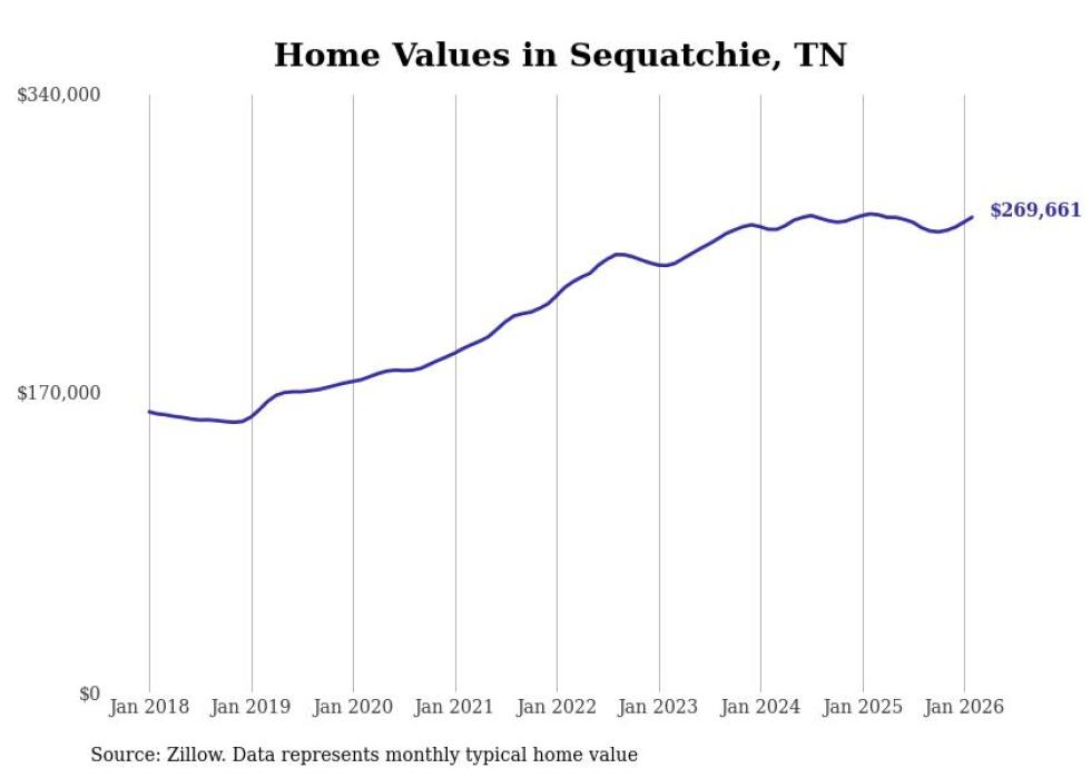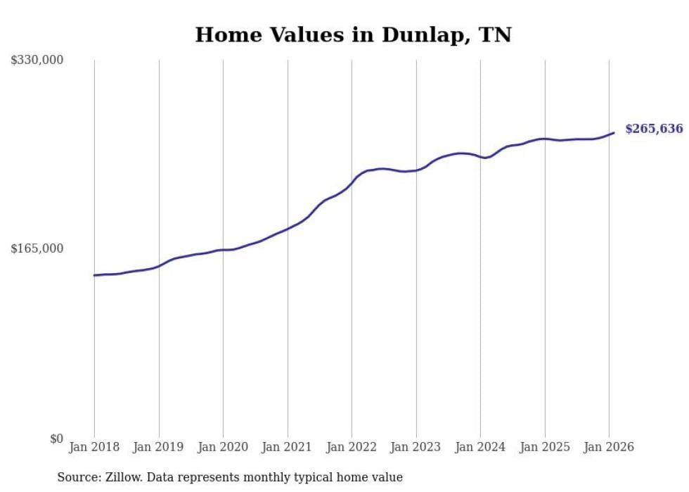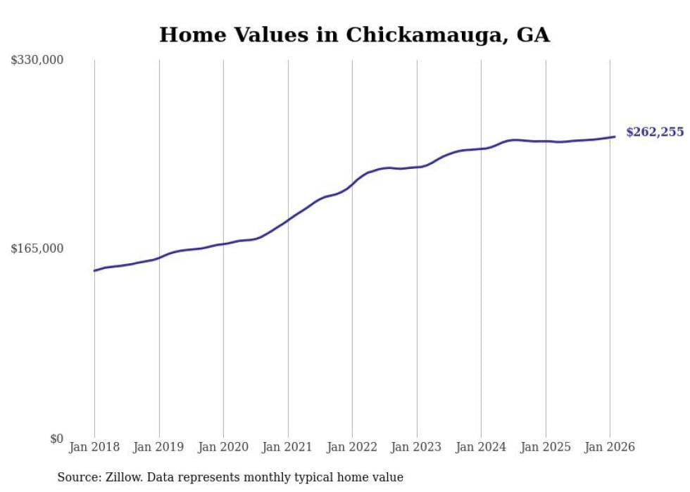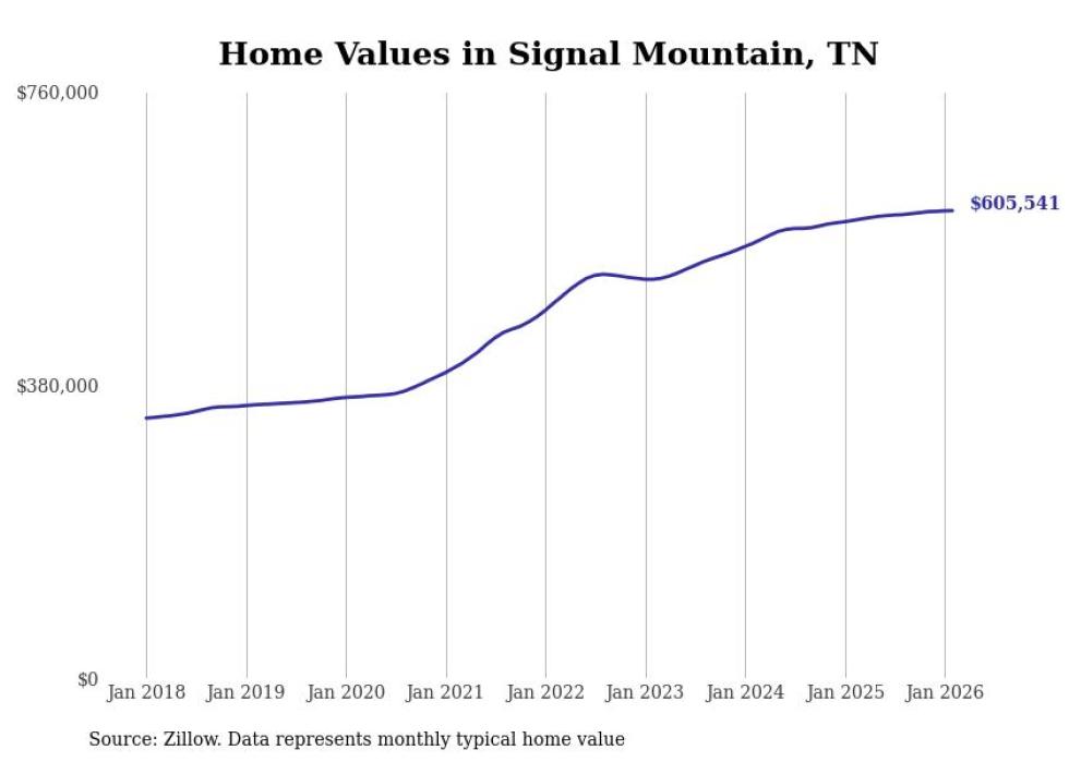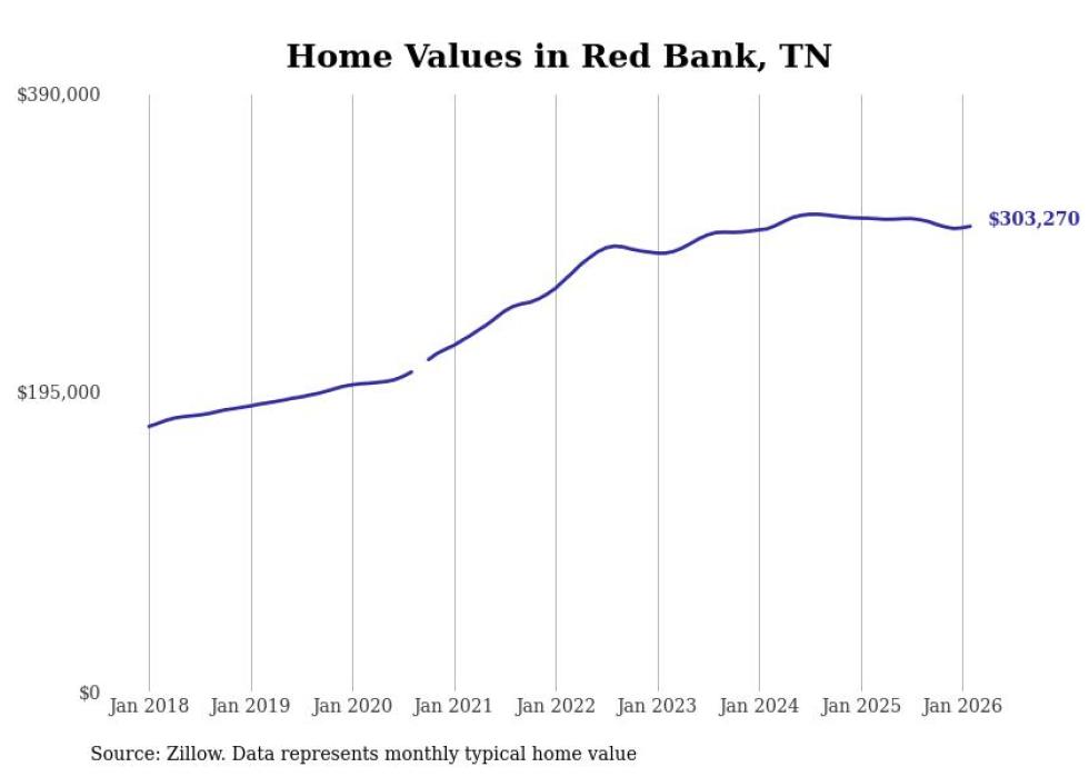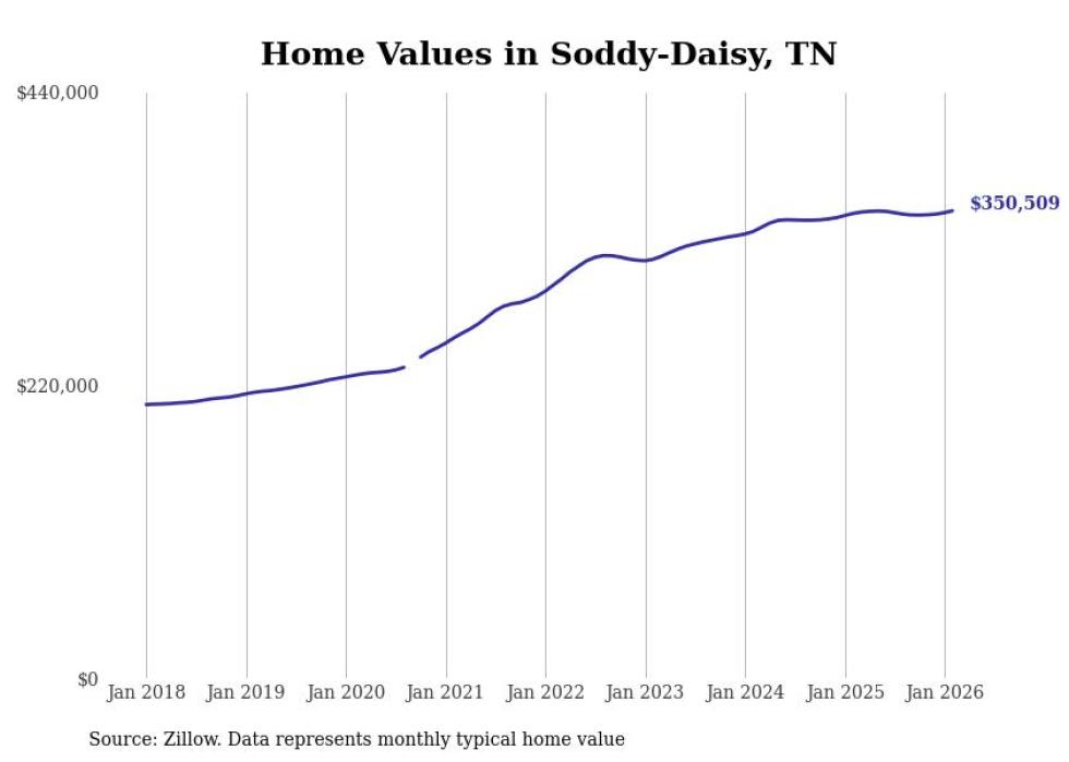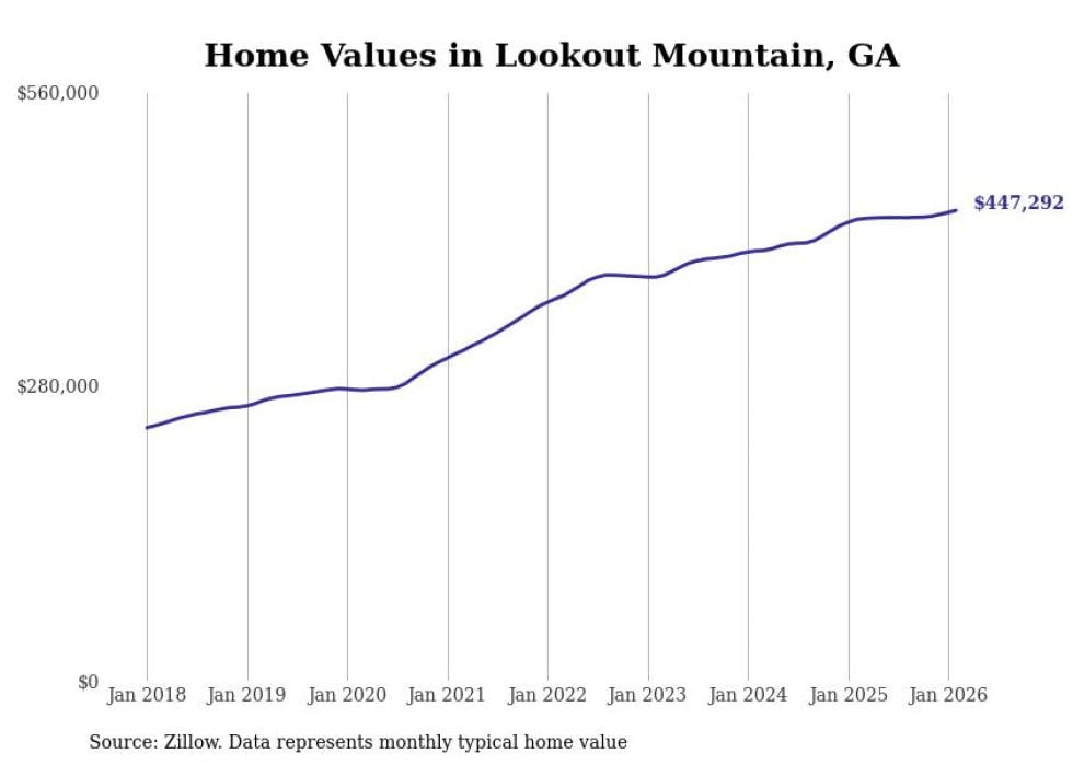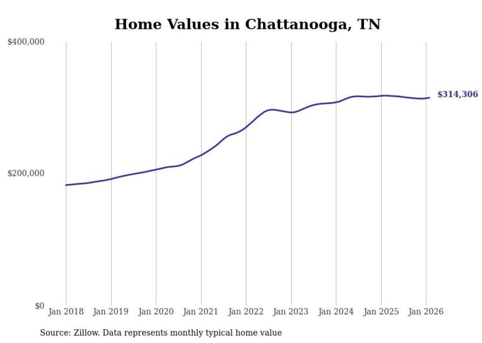 Stacker compiled a list of cities with the most expensive homes in the Chattanooga metro area using data from Zillow. Charts show the monthly typical home value since January 2018. Data was available for 36 cities and towns.
