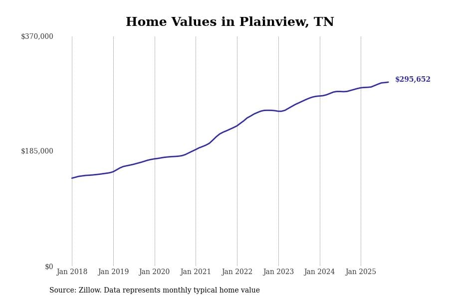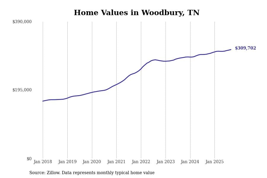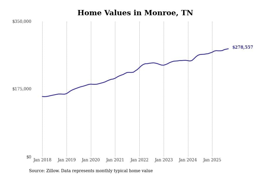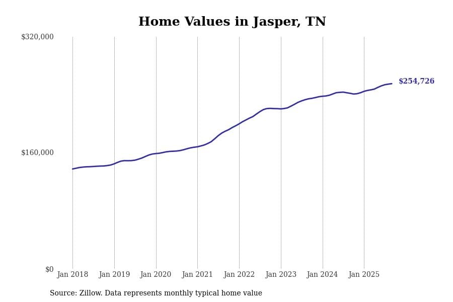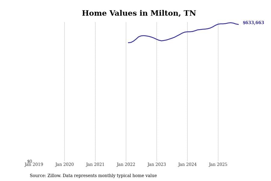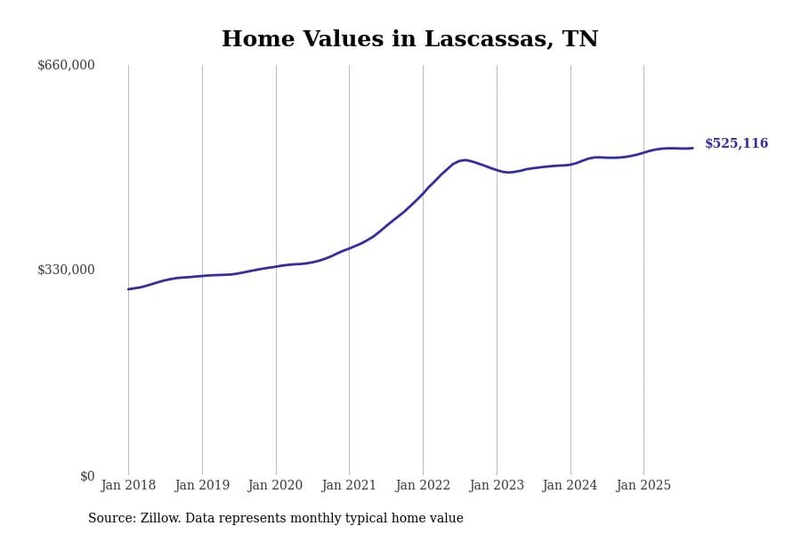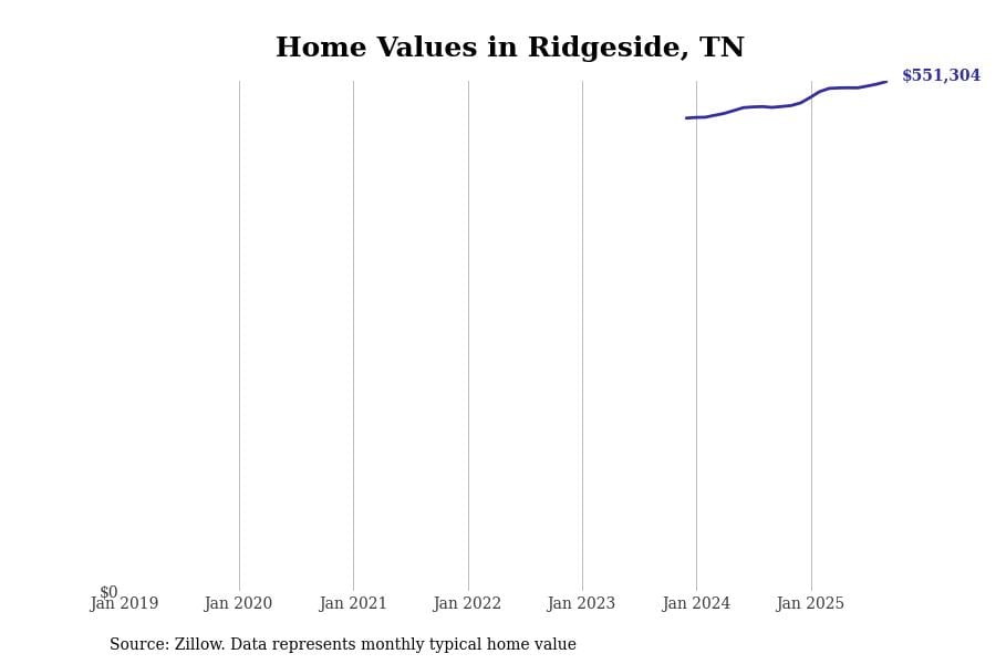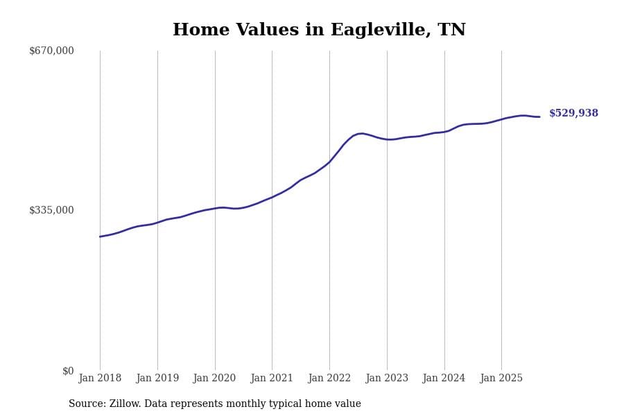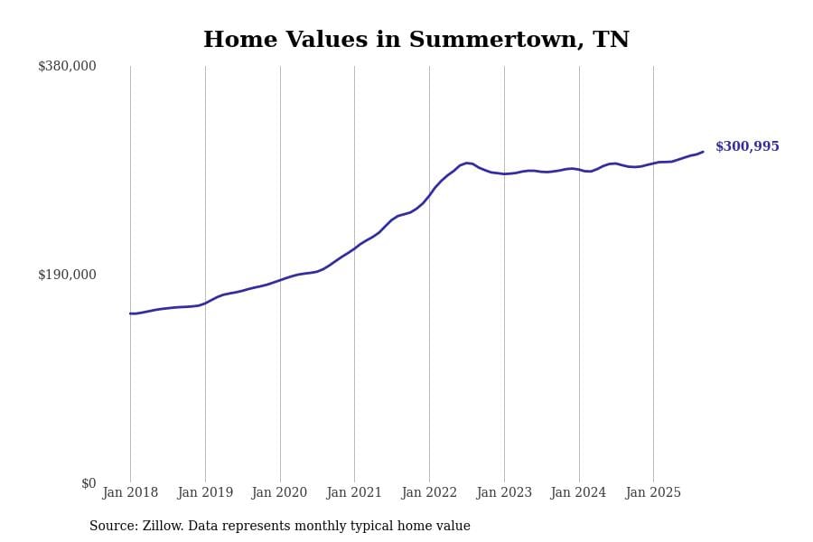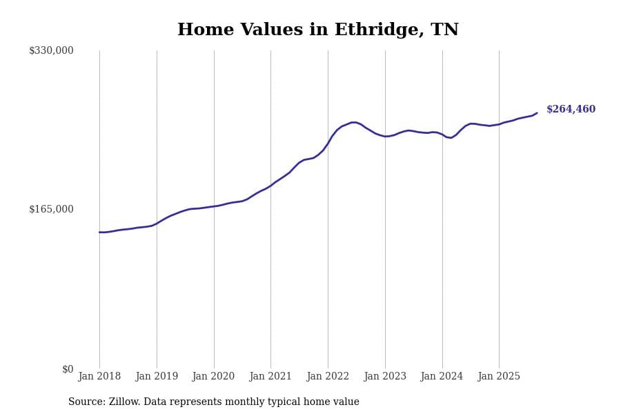 Stacker compiled a list of cities with the fastest-growing home prices in Tennessee using data from Zillow. Cities are ranked by the dollar change in the Zillow Home Values Index for all homes from the 12 months ending September 2025. The charts in this story were created automatically using Matplotlib. Data was available for 50 cities and towns in Tennessee.