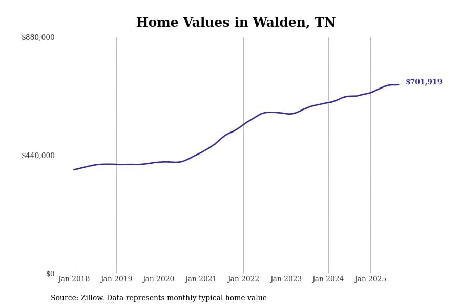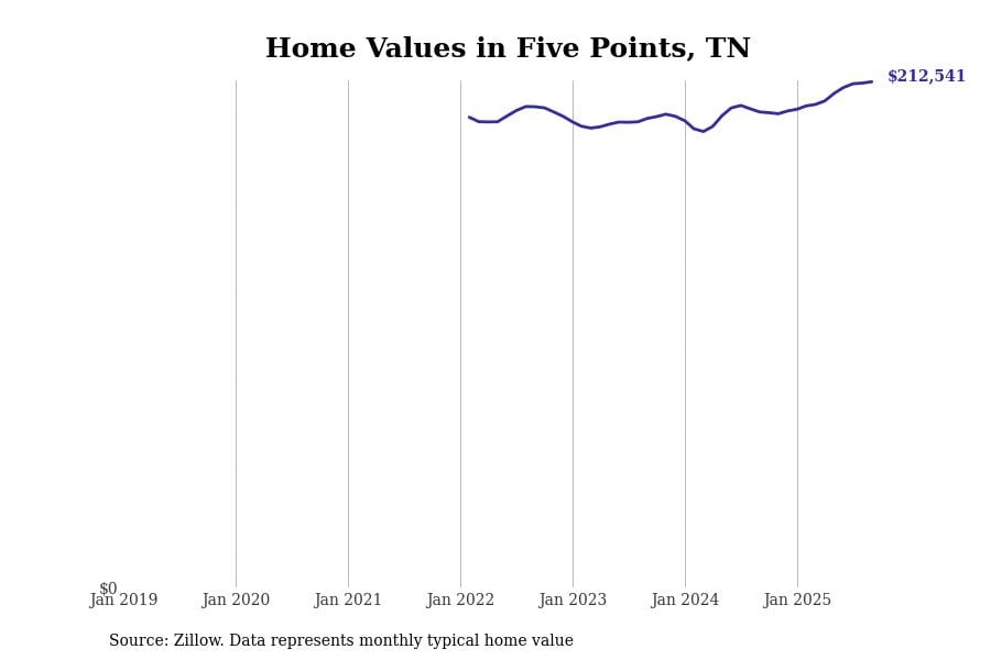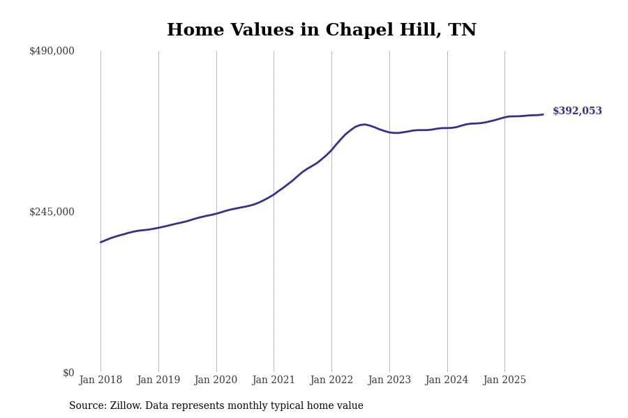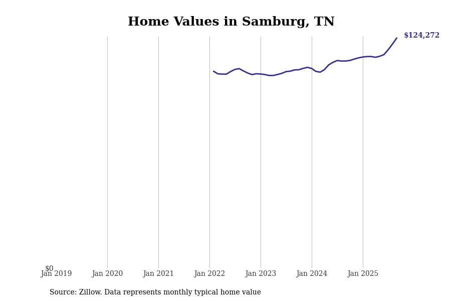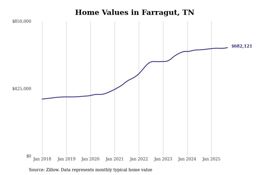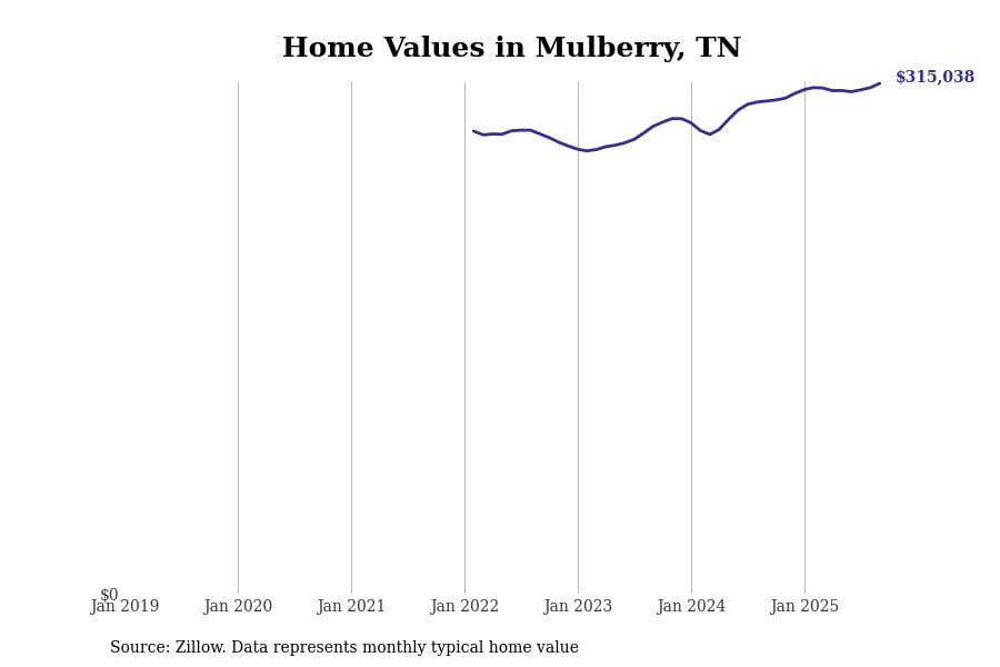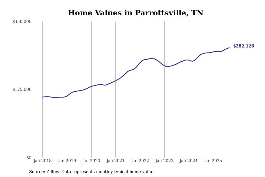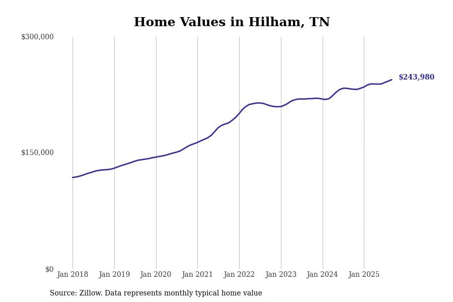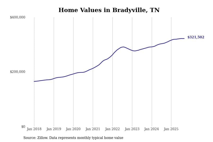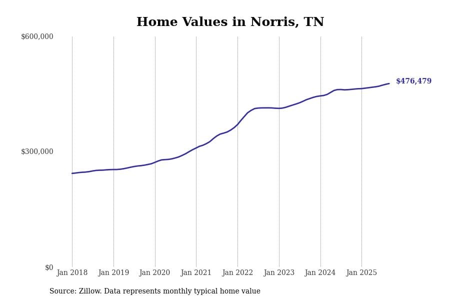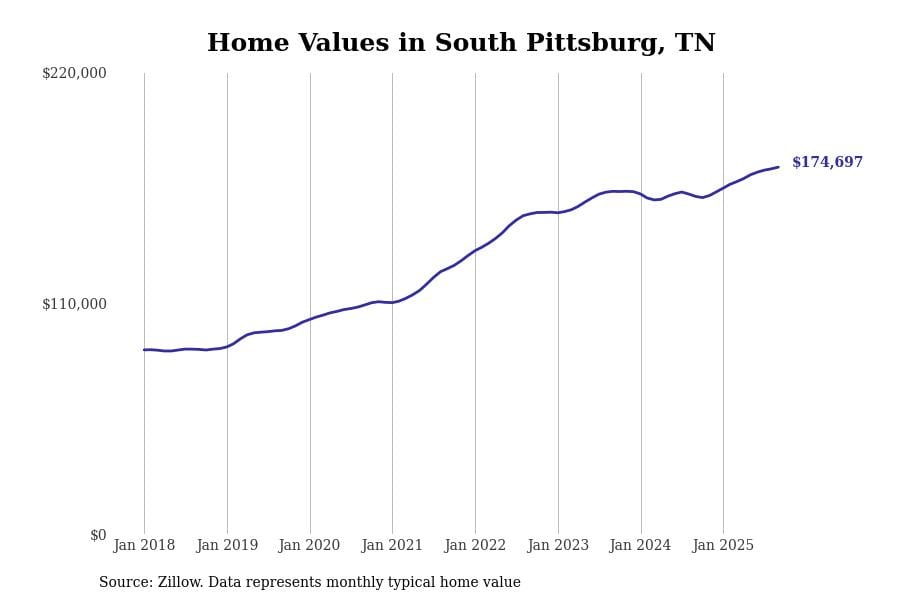 Stacker compiled a list of cities with the fastest-growing home prices in Tennessee using data from Zillow. Cities are ranked by the dollar change in the Zillow Home Values Index for all homes from the 12 months ending September 2025. The charts in this story were created automatically using Matplotlib. Data was available for 50 cities and towns in Tennessee.
