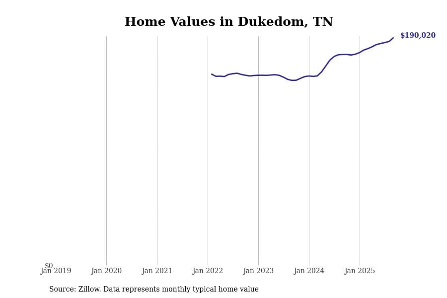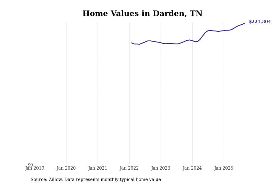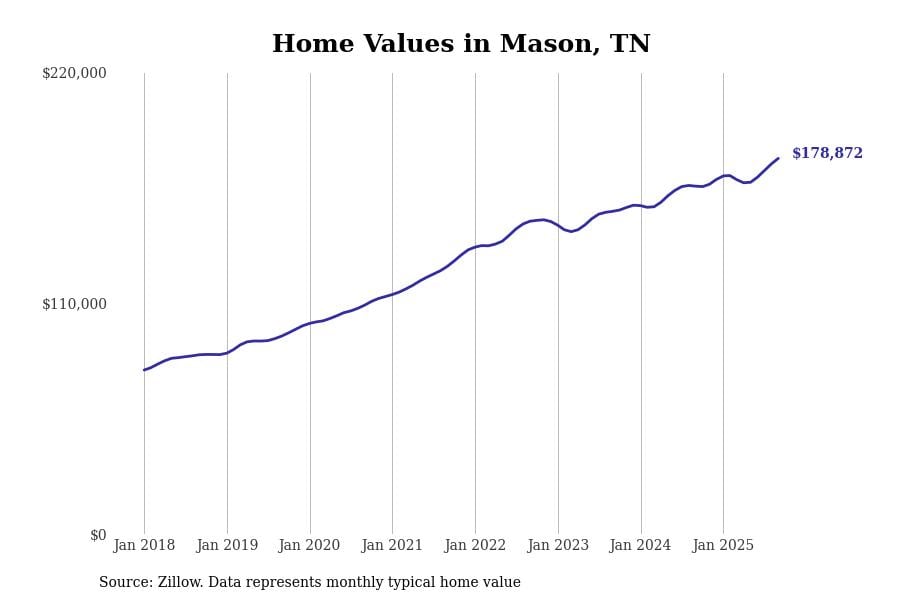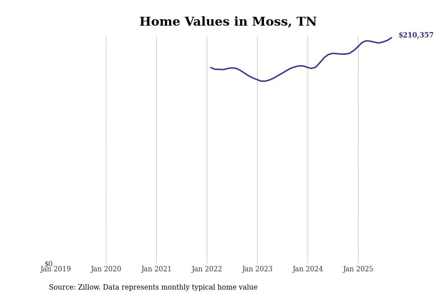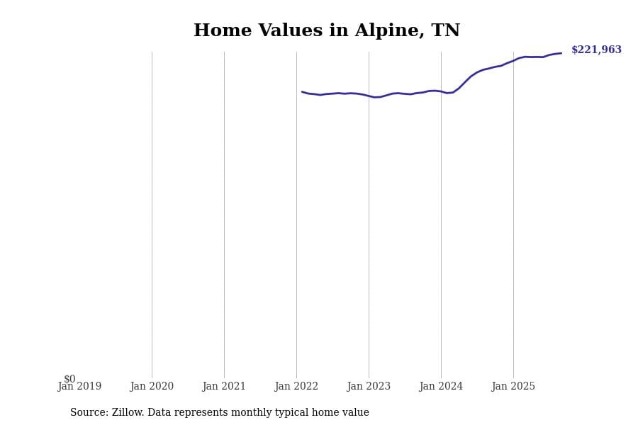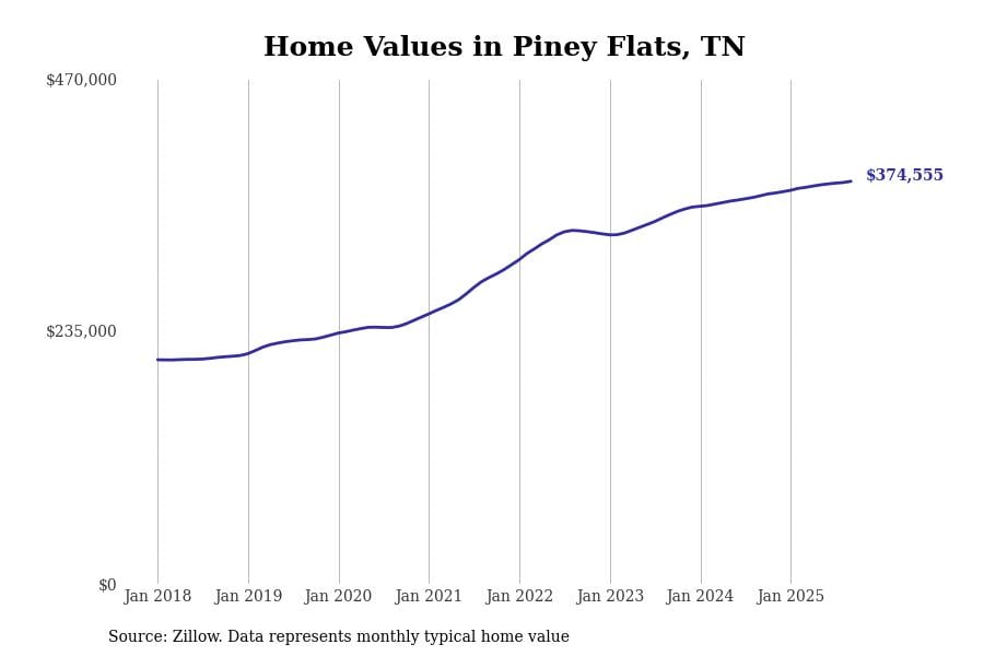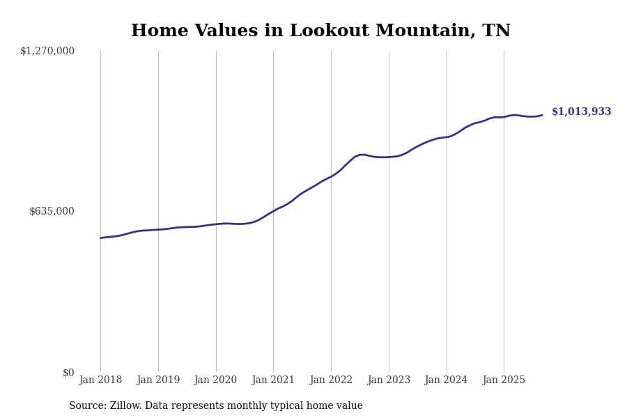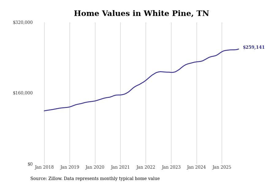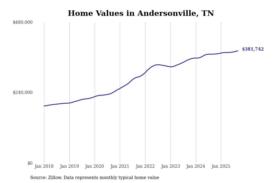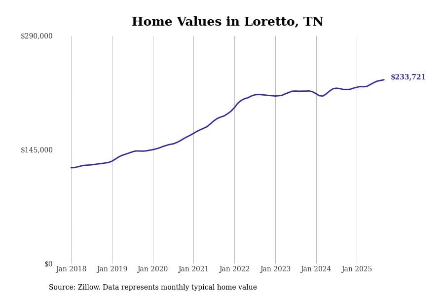 Stacker compiled a list of cities with the fastest-growing home prices in Tennessee using data from Zillow. Cities are ranked by the dollar change in the Zillow Home Values Index for all homes from the 12 months ending September 2025. The charts in this story were created automatically using Matplotlib. Data was available for 50 cities and towns in Tennessee.