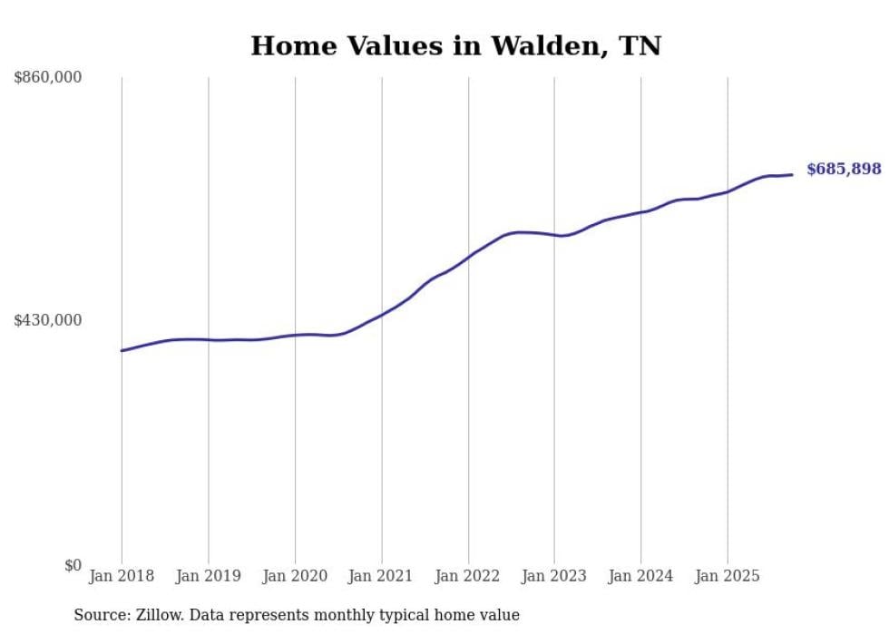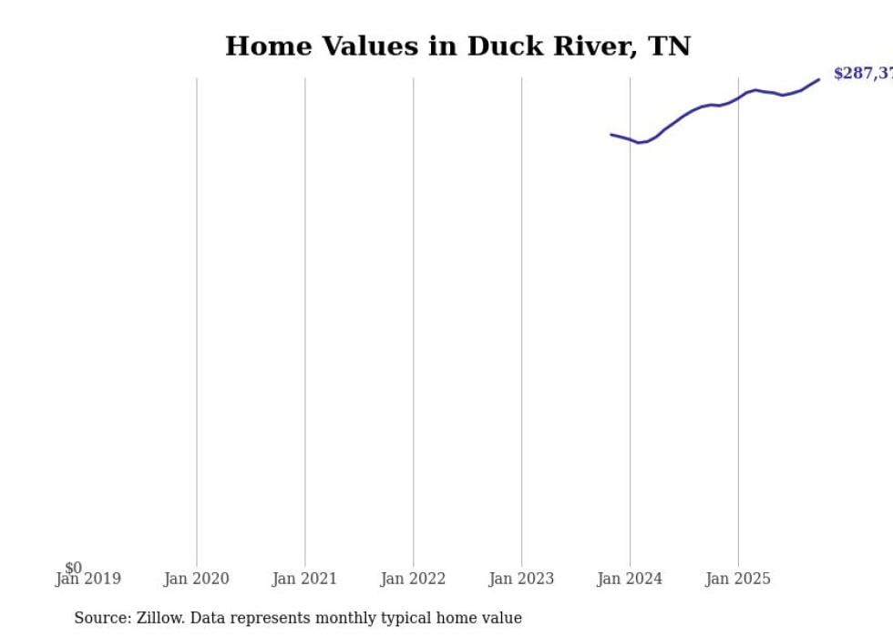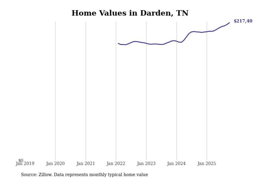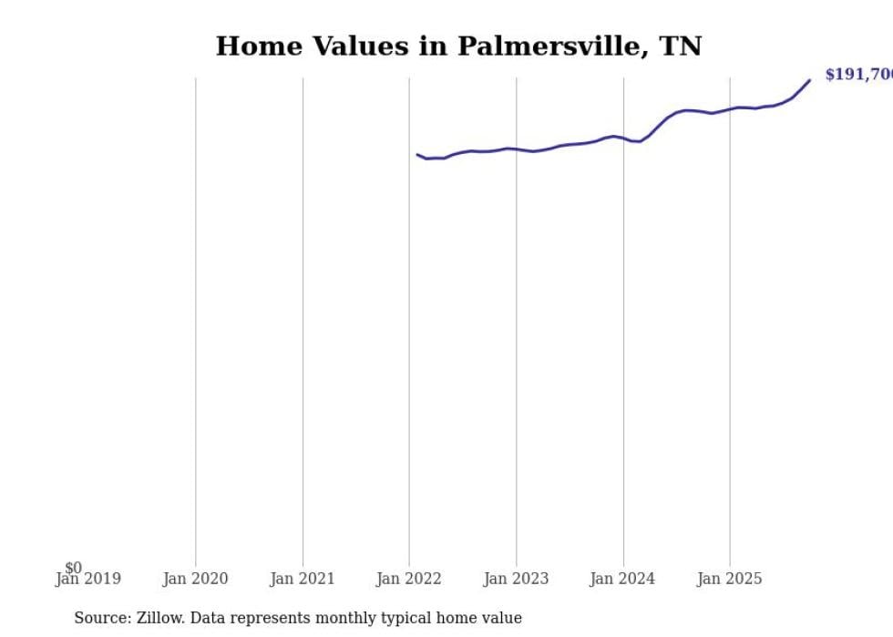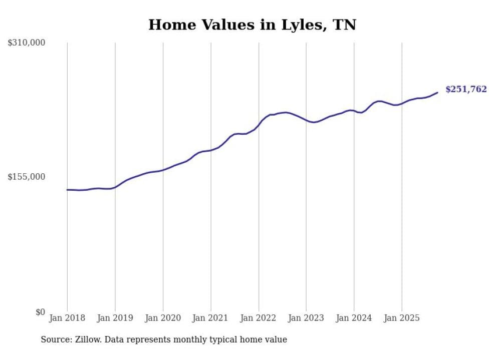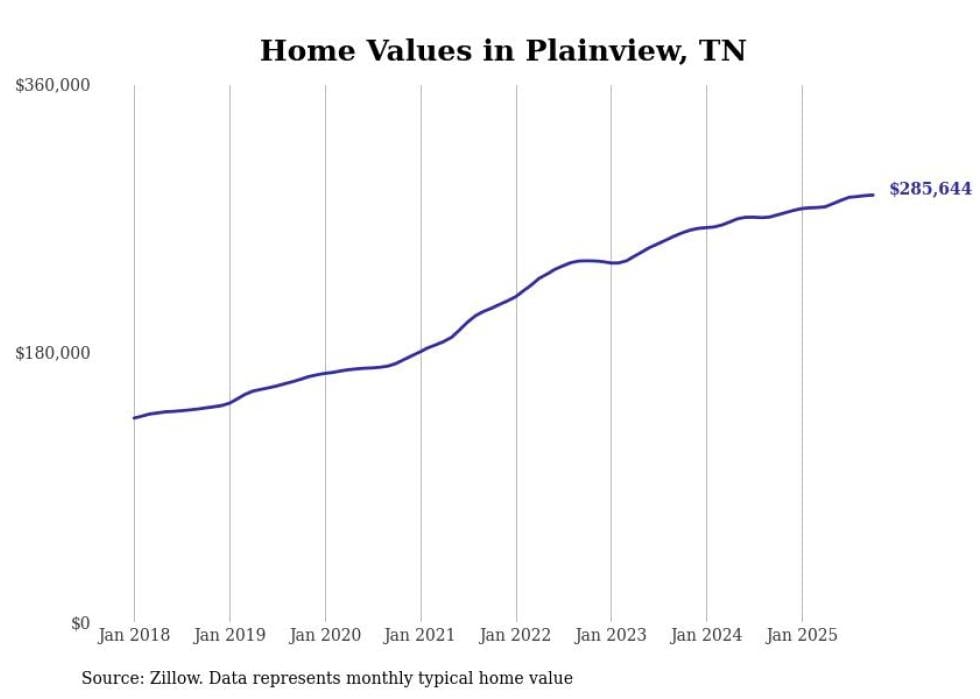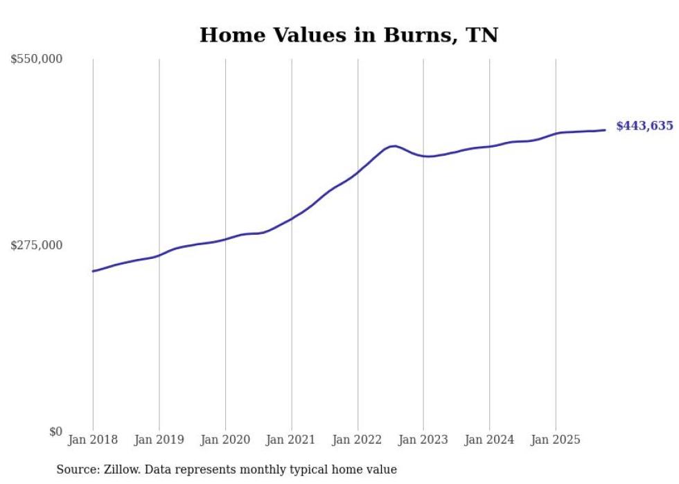 Stacker compiled a list of cities with the fastest-growing home prices in Tennessee using data from Zillow. Cities are ranked by the dollar change in the Zillow Home Values Index for all homes from the 12 months ending October 2025. The charts in this story were created automatically using Matplotlib. Data was available for 50 cities and towns in Tennessee.