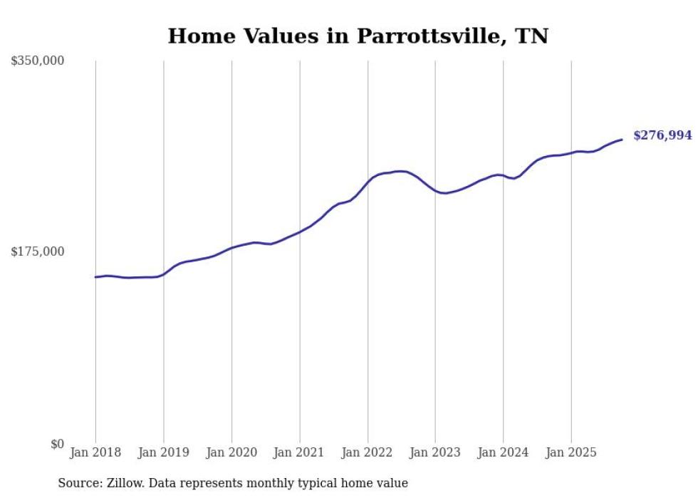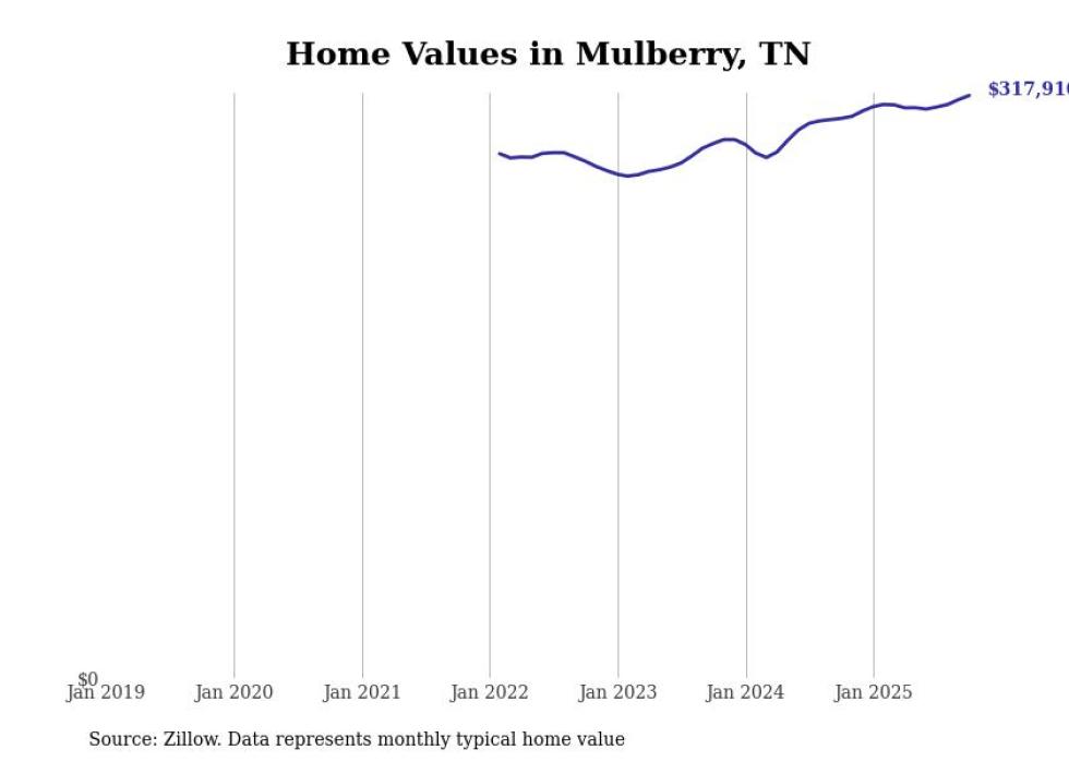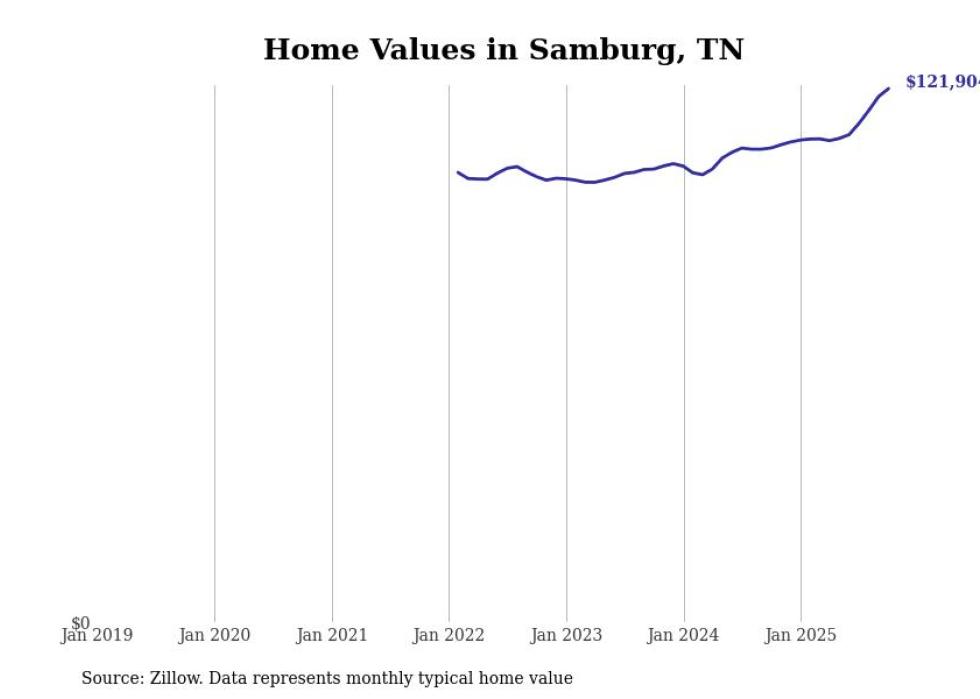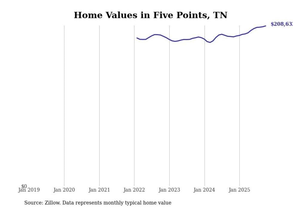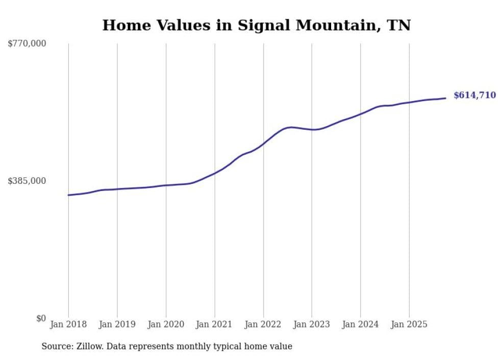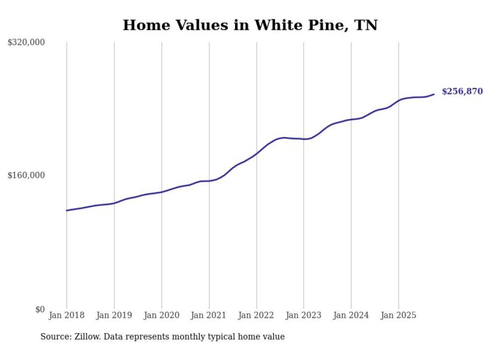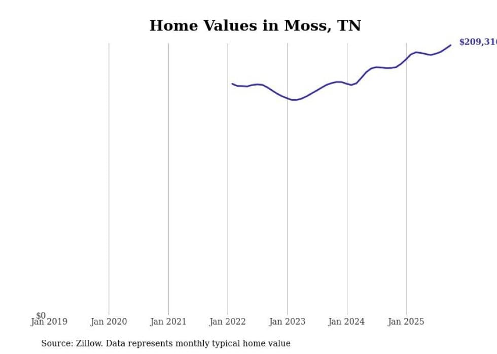 Stacker compiled a list of cities with the fastest-growing home prices in Tennessee using data from Zillow. Cities are ranked by the dollar change in the Zillow Home Values Index for all homes from the 12 months ending October 2025. The charts in this story were created automatically using Matplotlib. Data was available for 50 cities and towns in Tennessee.