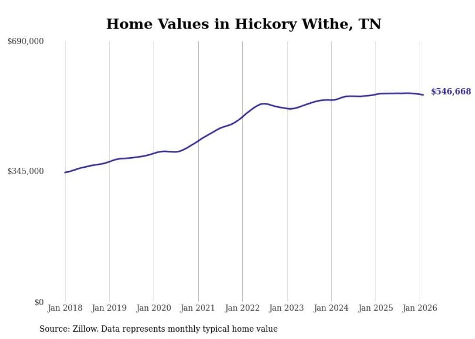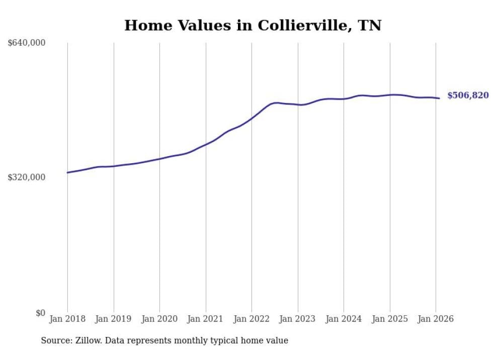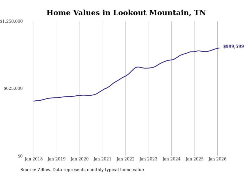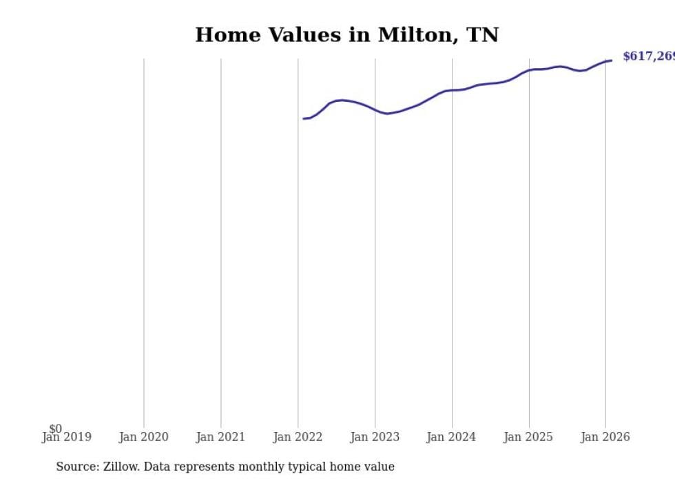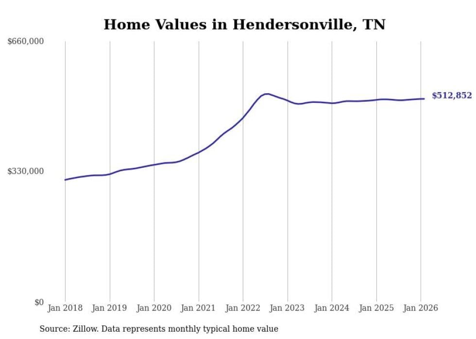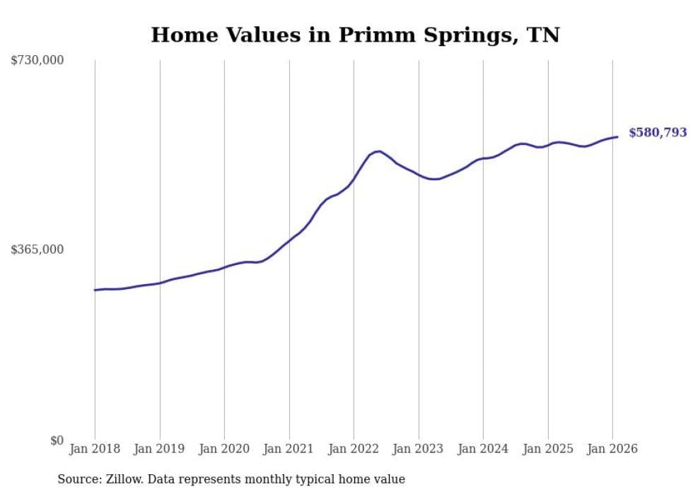 Stacker compiled a list of cities with the most expensive homes in Tennessee using data from Zillow. Cities are ranked by the Zillow Home Values Index for all homes as of February 2026. The charts in this story were created automatically using Matplotlib.