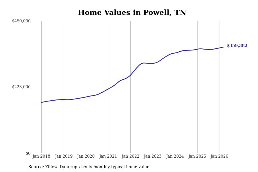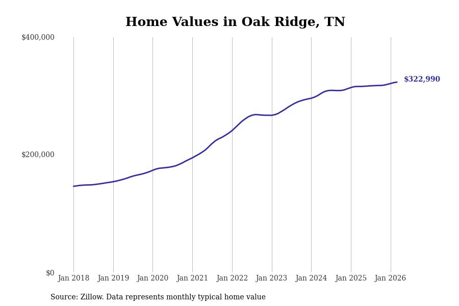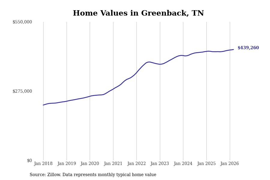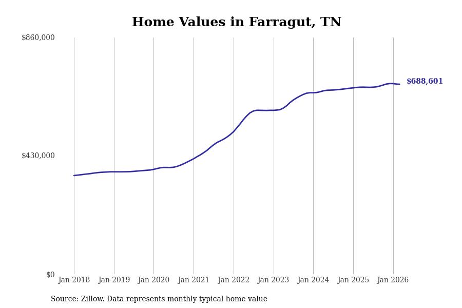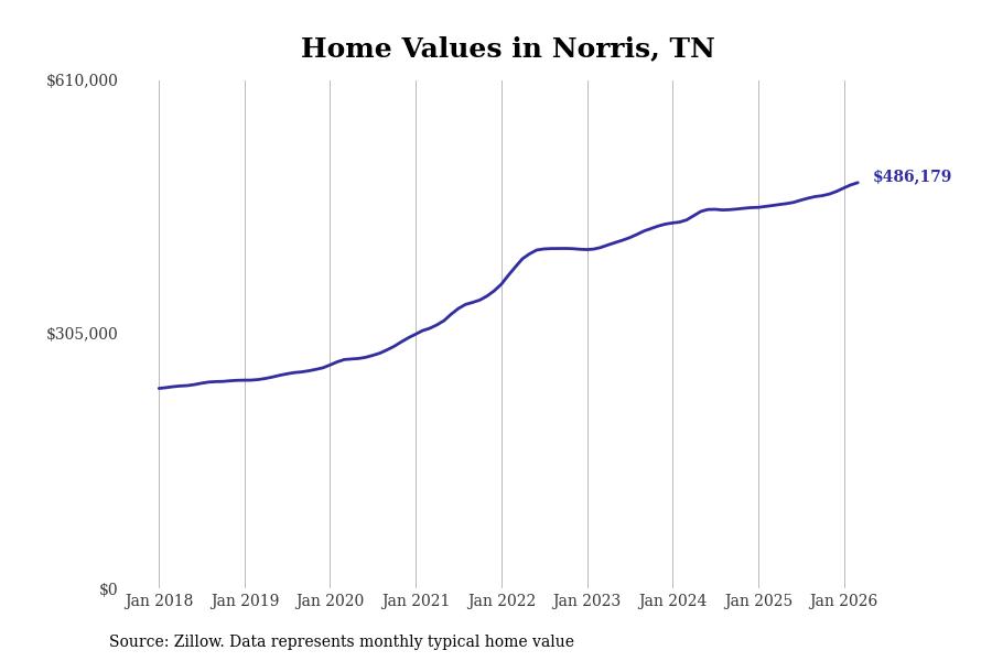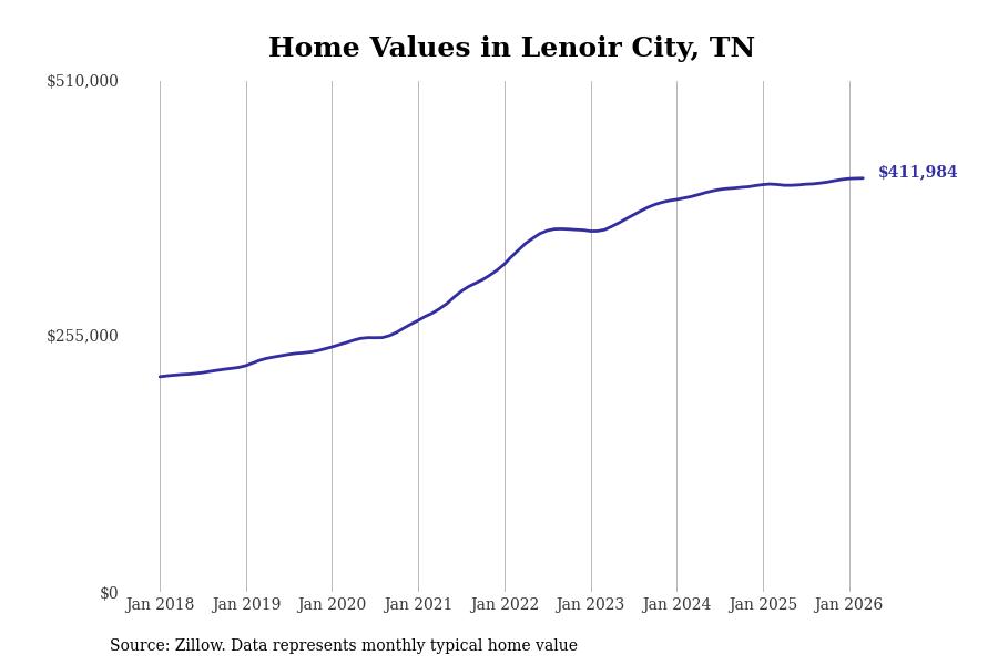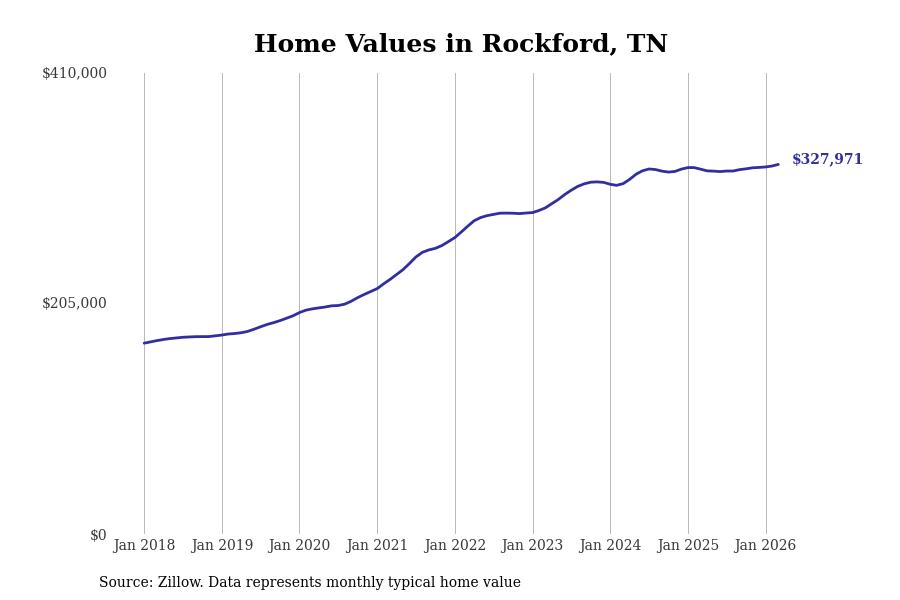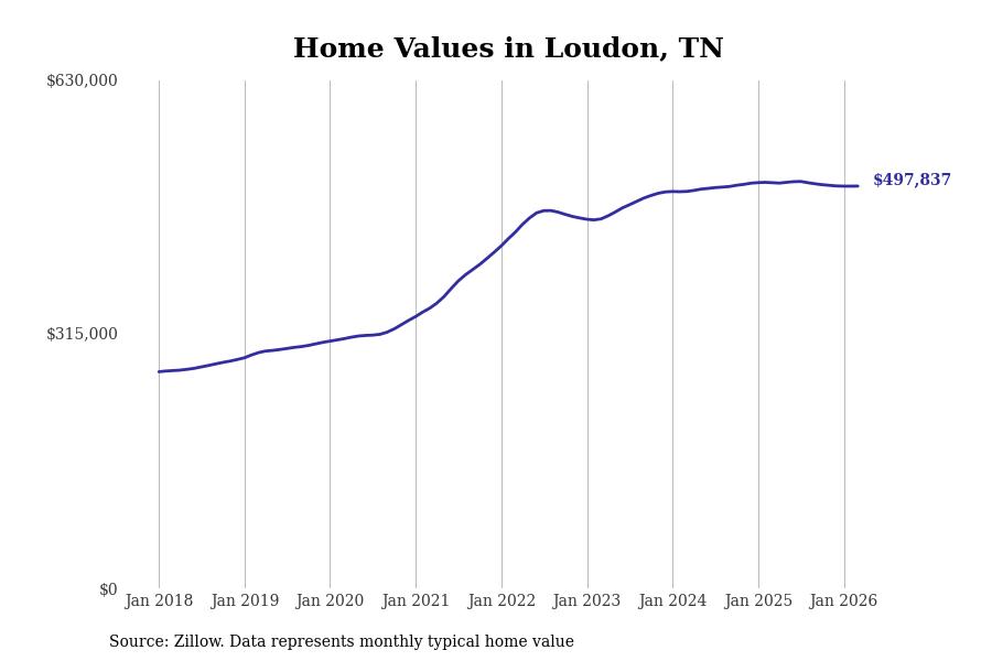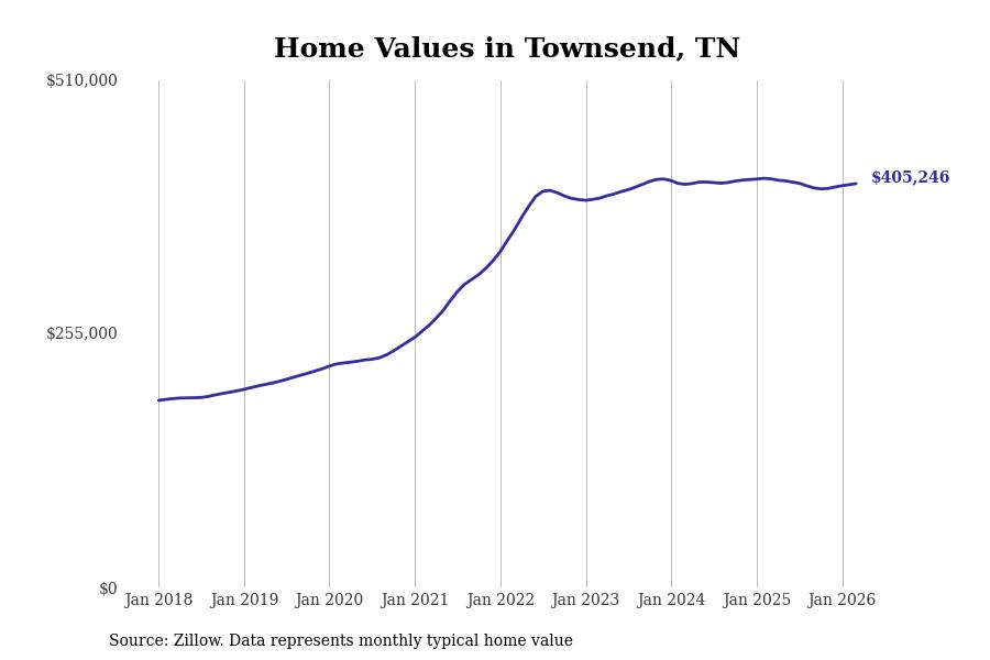 Stacker compiled a list of cities with the most expensive homes in the Knoxville metro area using data from Zillow. Charts show the monthly typical home value since January 2018. Data was available for 47 cities and towns.