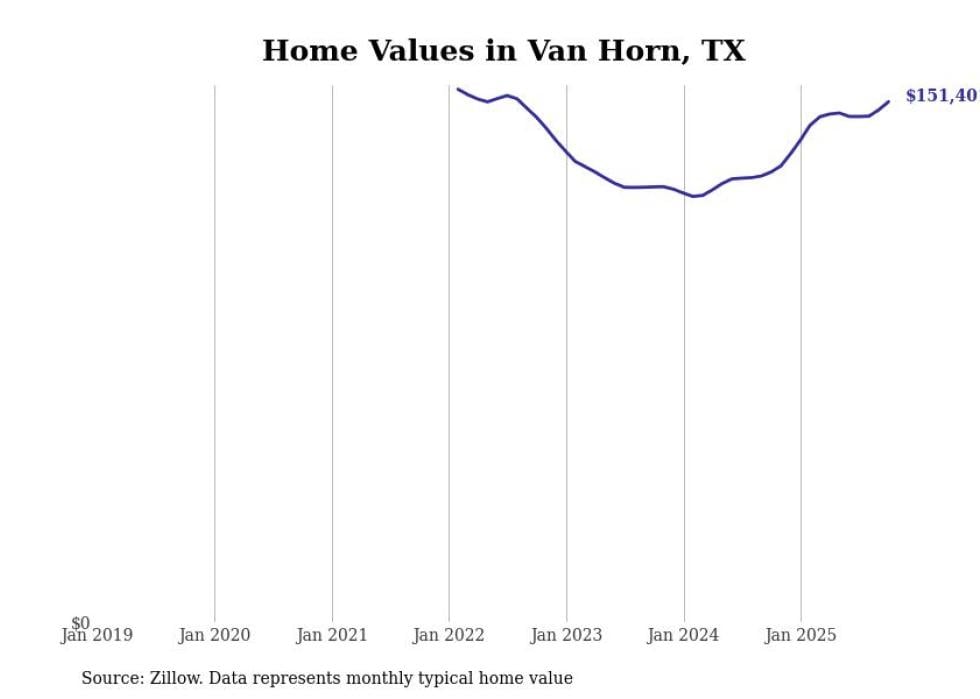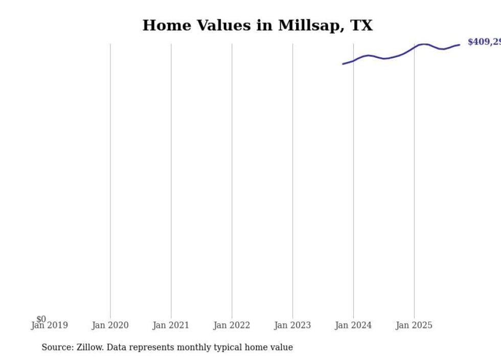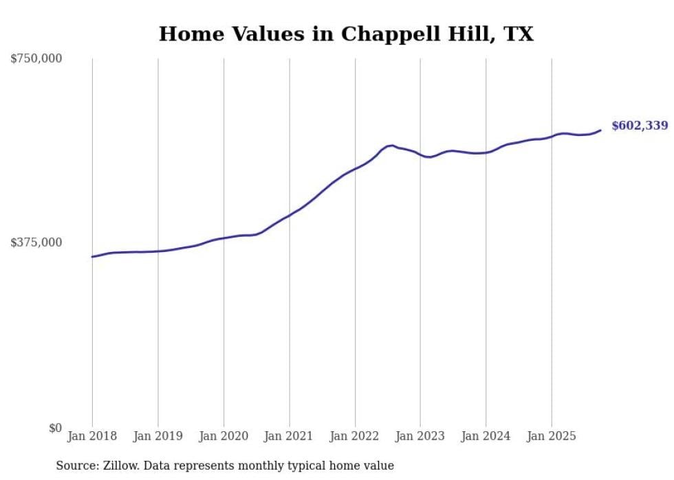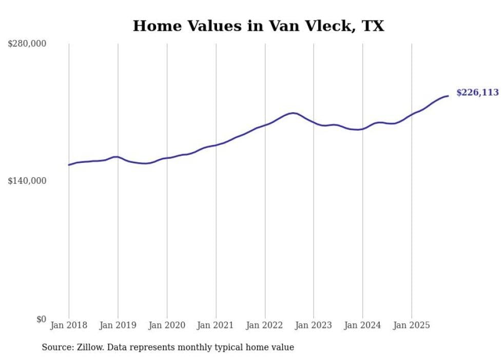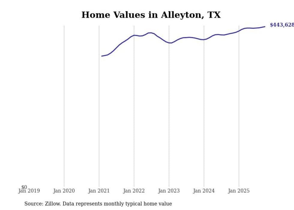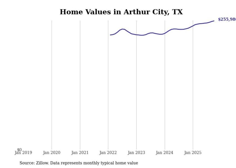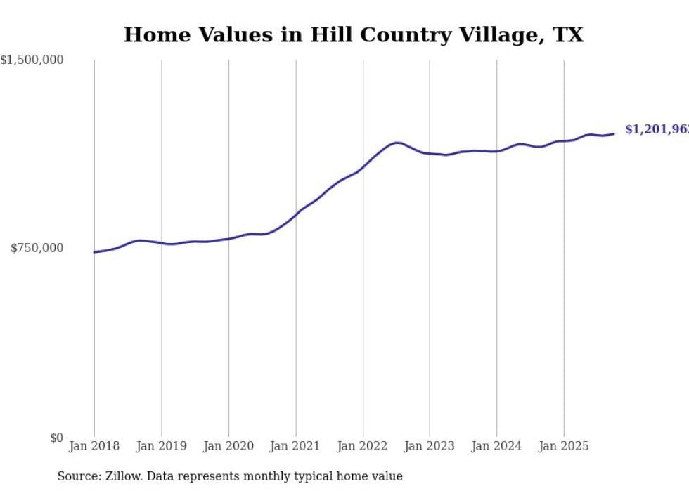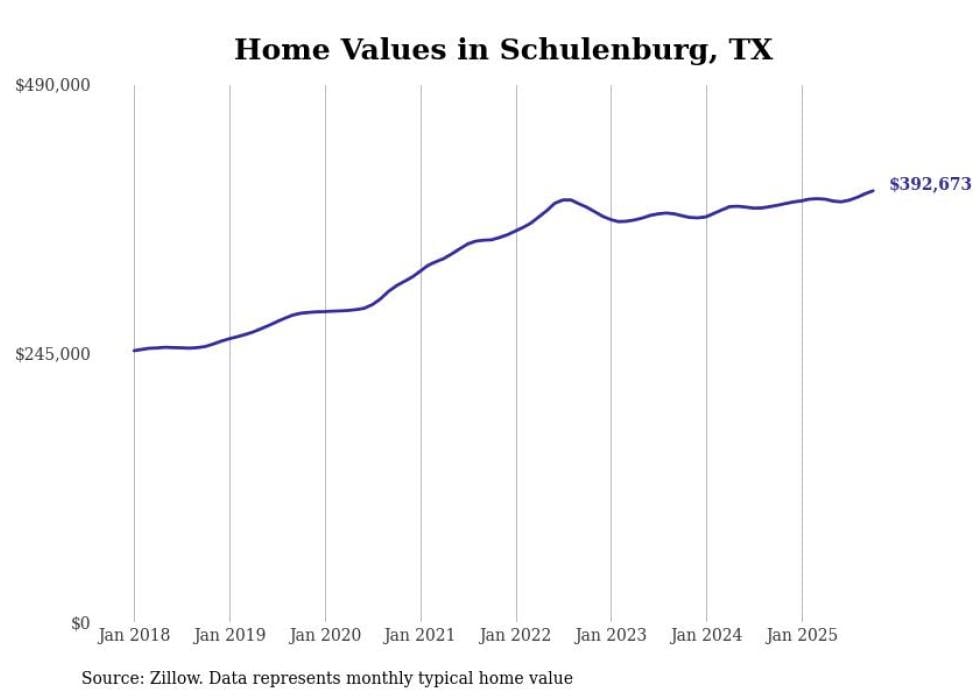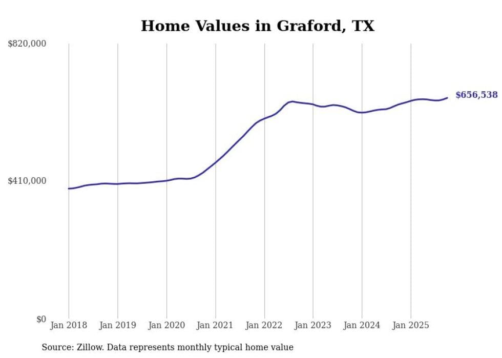 Stacker compiled a list of cities with the fastest-growing home prices in Texas using data from Zillow. Cities are ranked by the dollar change in the Zillow Home Values Index for all homes from the 12 months ending October 2025. The charts in this story were created automatically using Matplotlib. Data was available for 50 cities and towns in Texas.