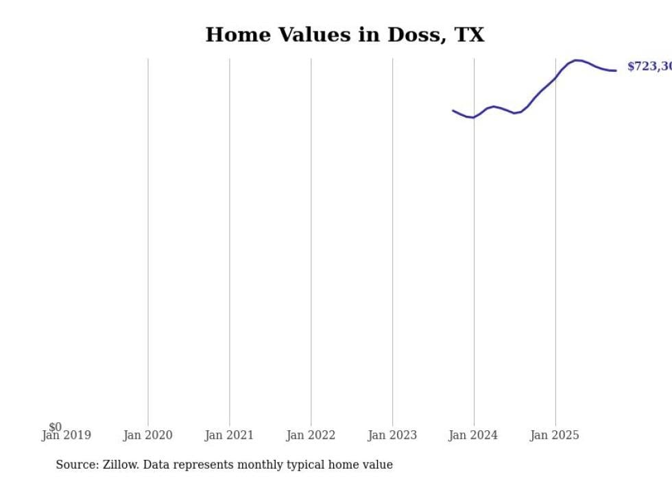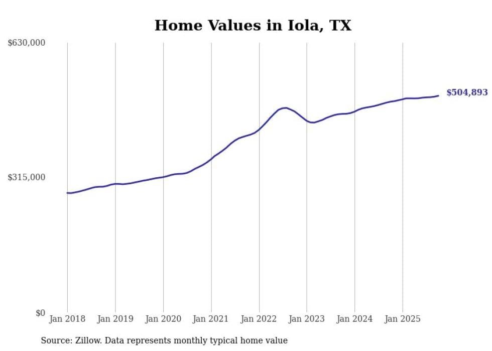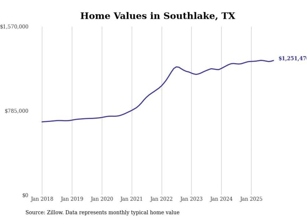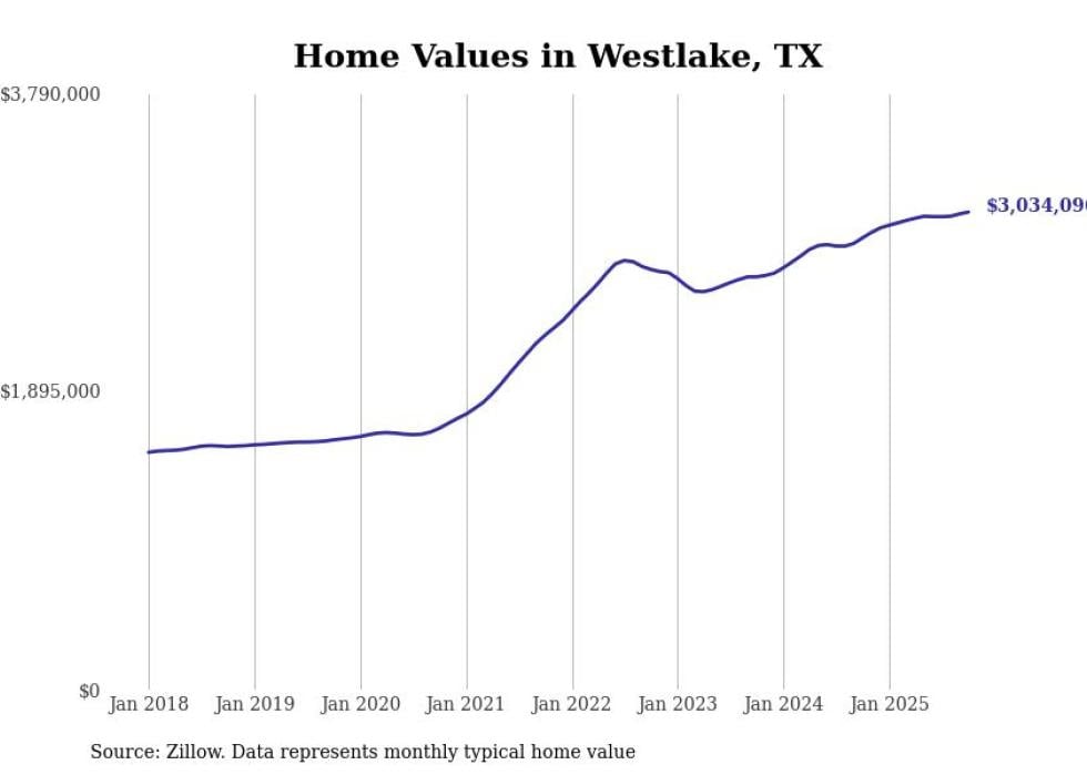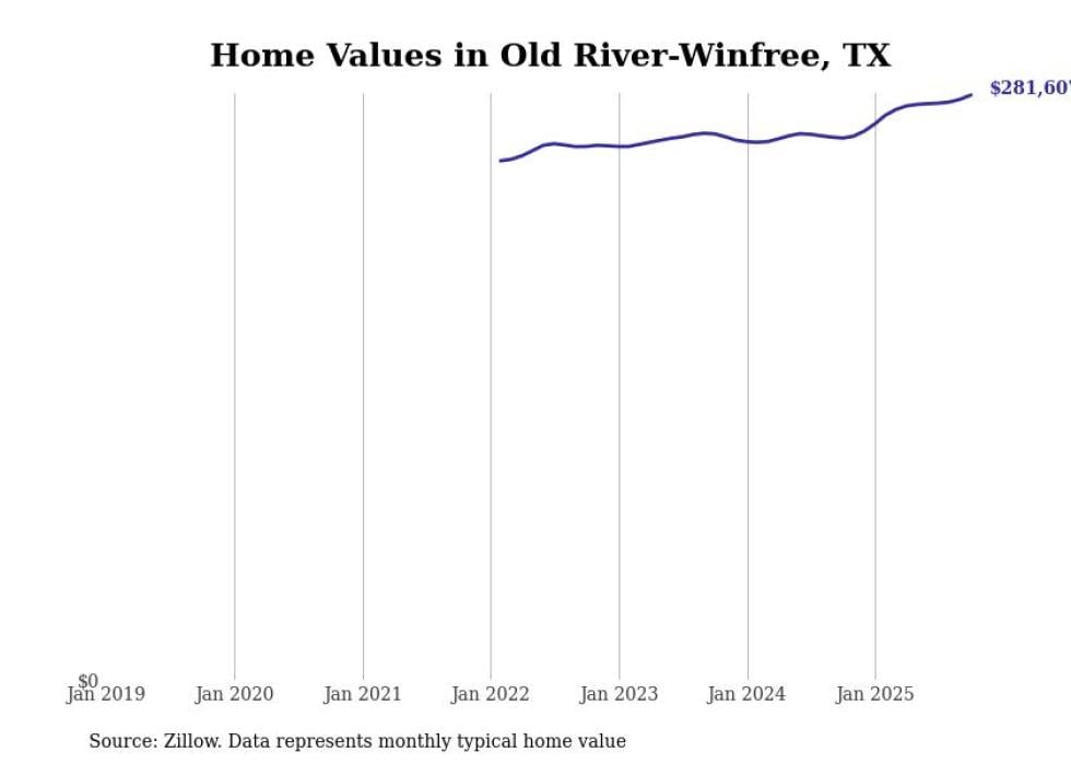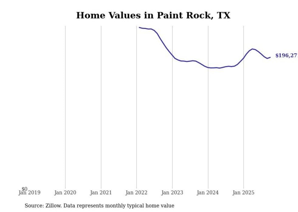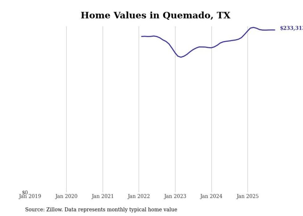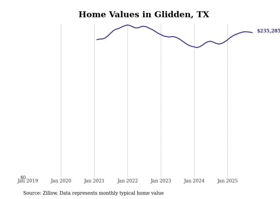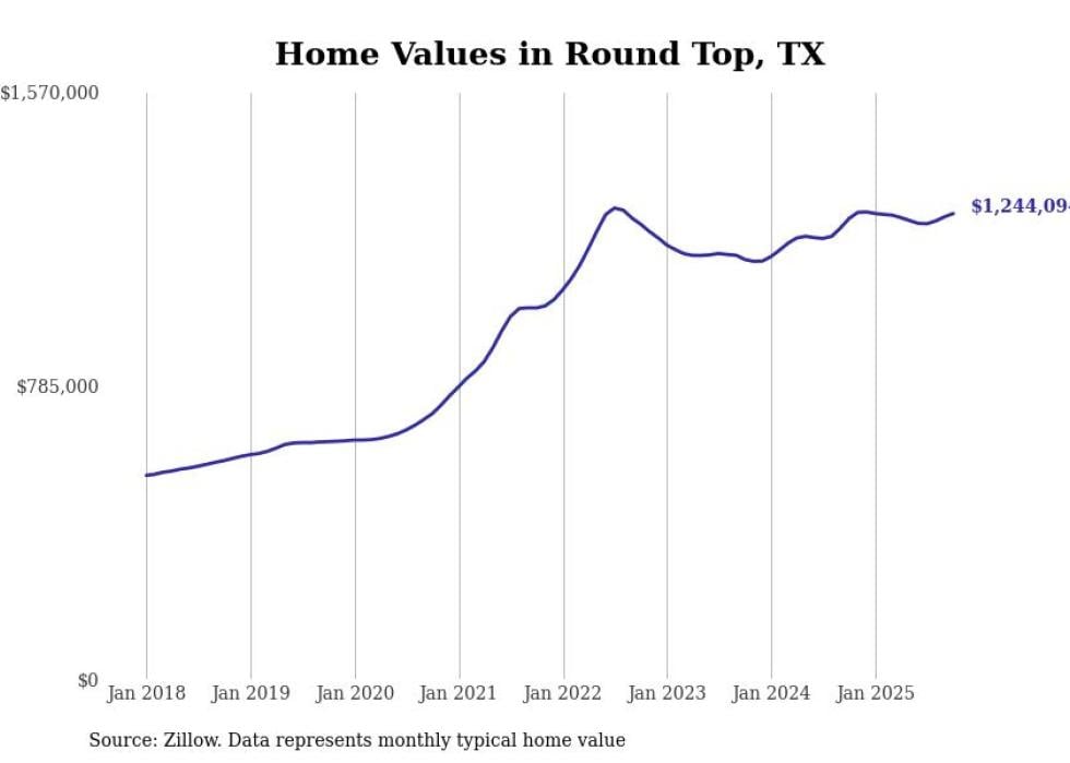 Stacker compiled a list of cities with the fastest-growing home prices in Texas using data from Zillow. Cities are ranked by the dollar change in the Zillow Home Values Index for all homes from the 12 months ending October 2025. The charts in this story were created automatically using Matplotlib. Data was available for 50 cities and towns in Texas.