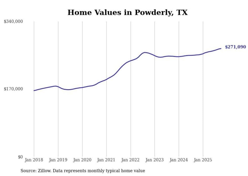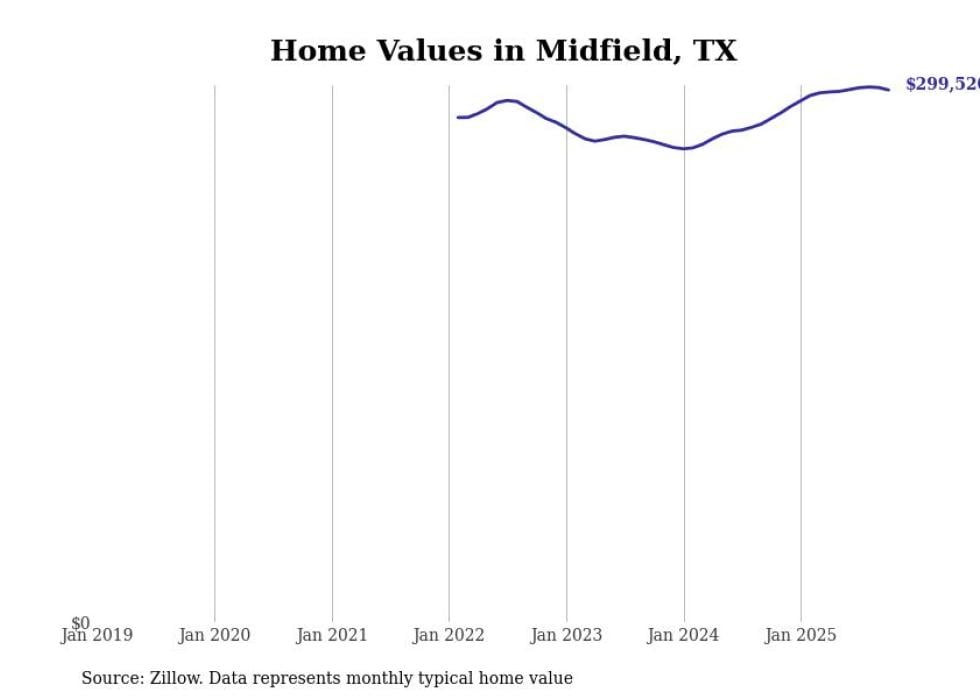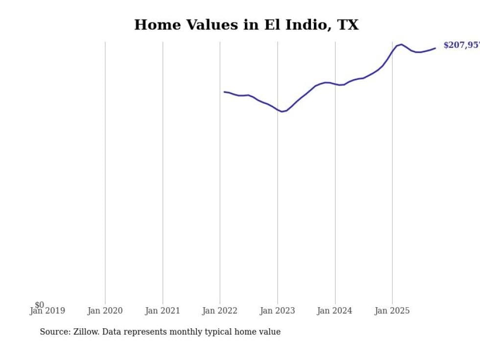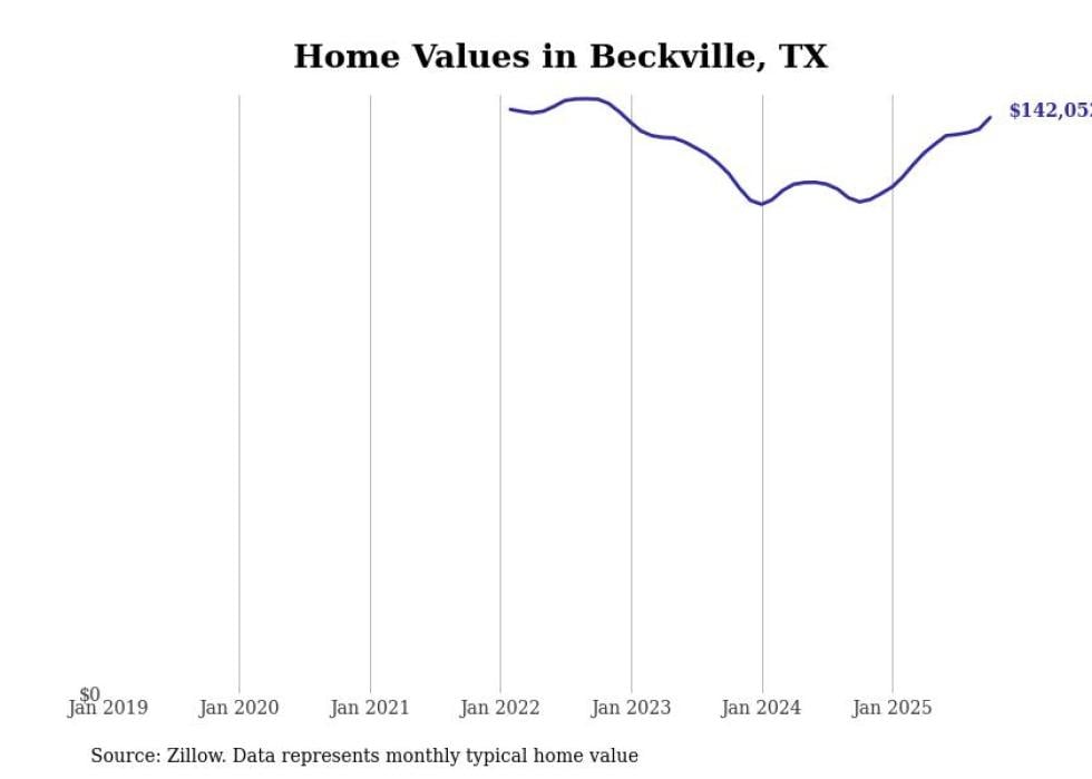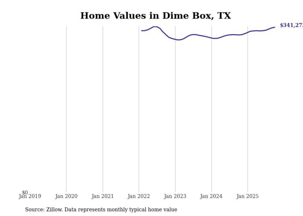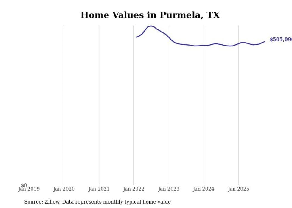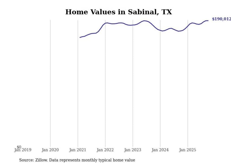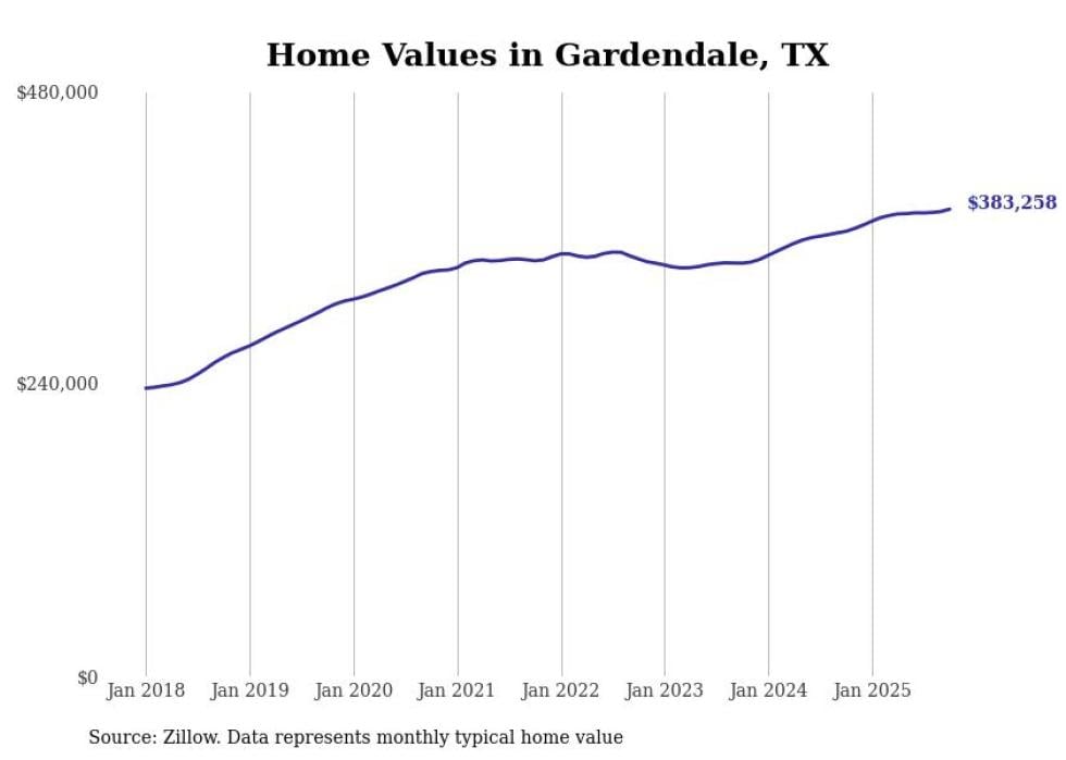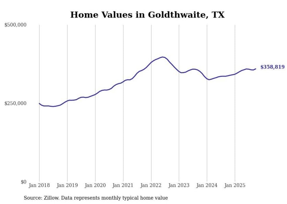 Stacker compiled a list of cities with the fastest-growing home prices in Texas using data from Zillow. Cities are ranked by the dollar change in the Zillow Home Values Index for all homes from the 12 months ending October 2025. The charts in this story were created automatically using Matplotlib. Data was available for 50 cities and towns in Texas.