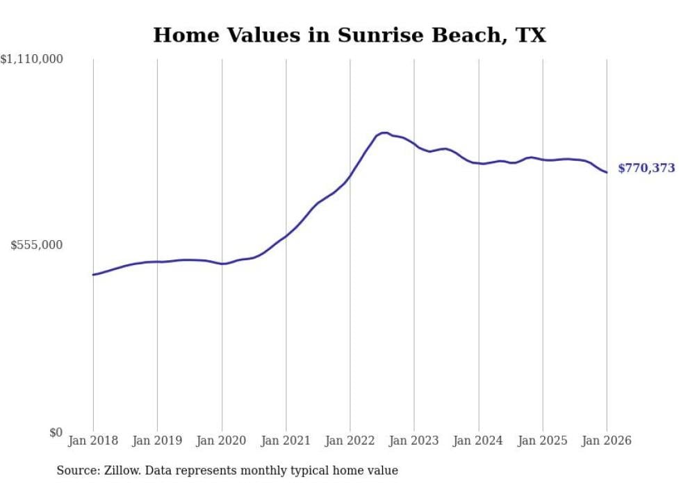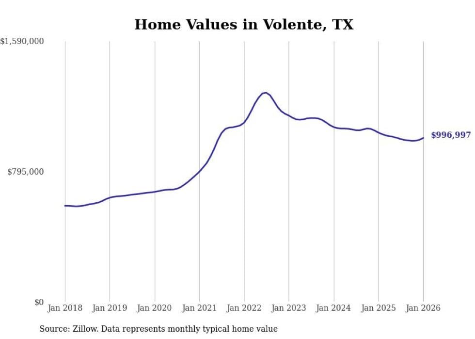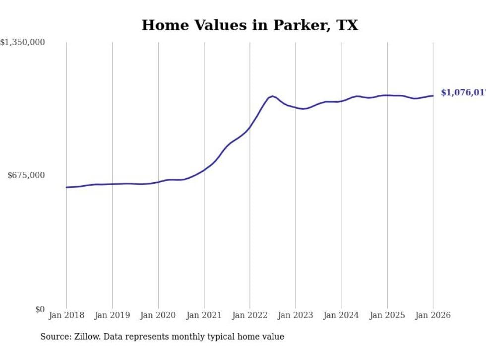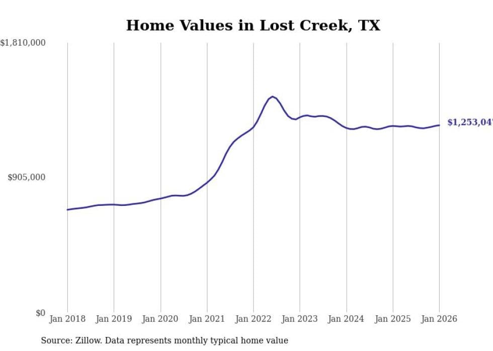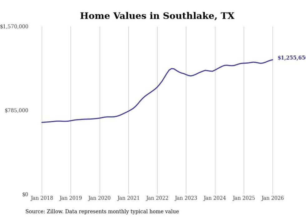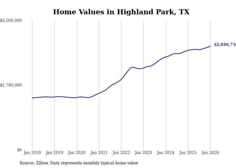 Stacker compiled a list of cities with the most expensive homes in Texas using data from Zillow. Cities are ranked by the Zillow Home Values Index for all homes as of January 2026. The charts in this story were created automatically using Matplotlib.