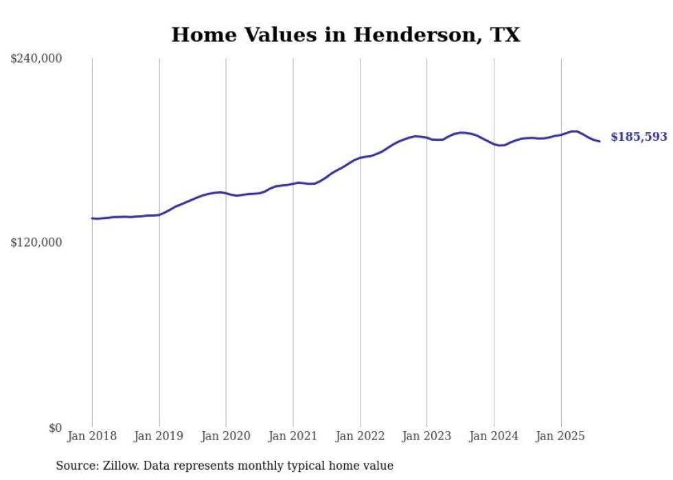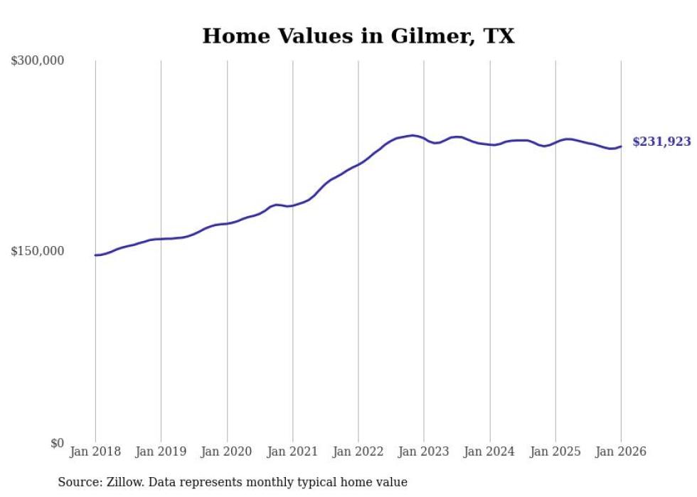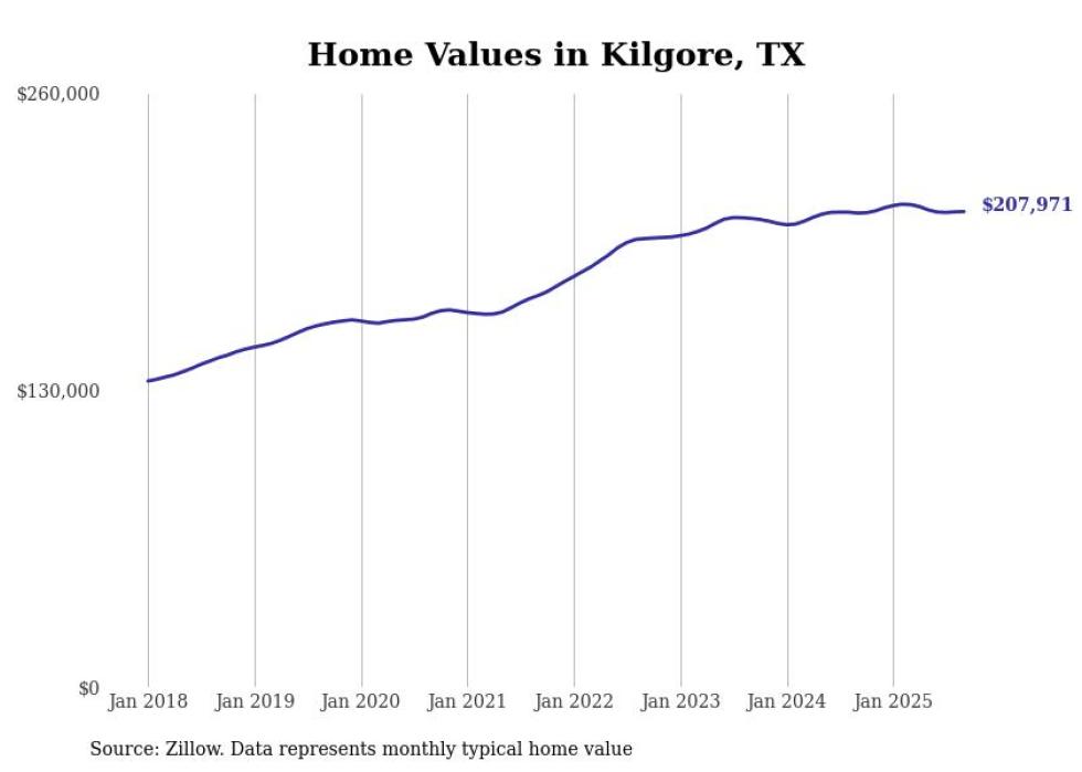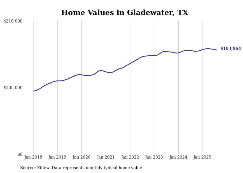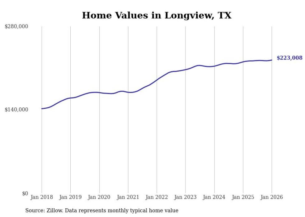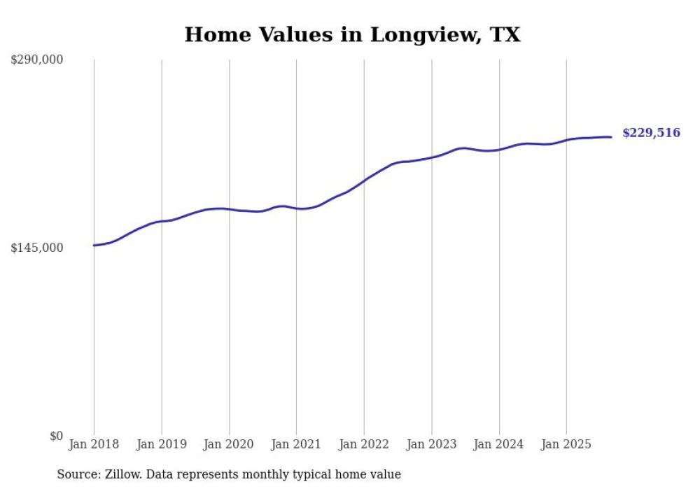 Stacker compiled a list of cities with the most expensive homes in the Longview, TX metro area using data from Zillow. Charts show the monthly typical home value since January 2018.