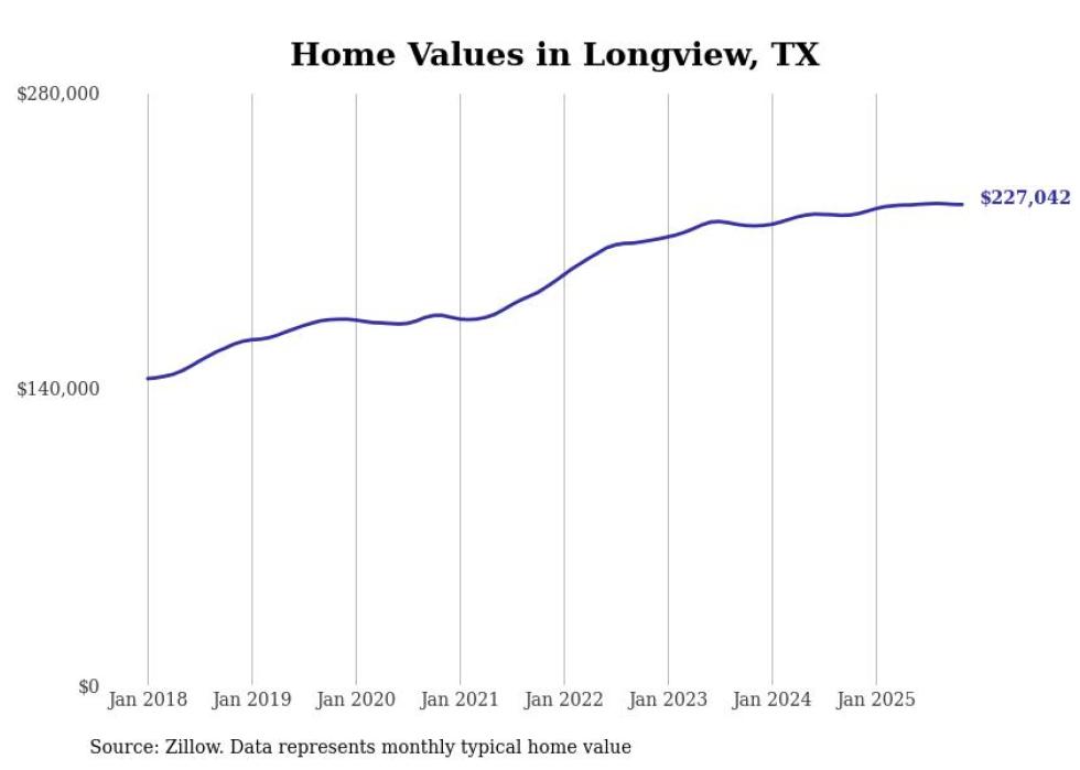 Stacker compiled a list of cities with the most expensive homes in the Longview, Texas metro area using data from Zillow. Charts show the monthly typical home value since January 2018. All 21 cities and towns with data available were included in the list.