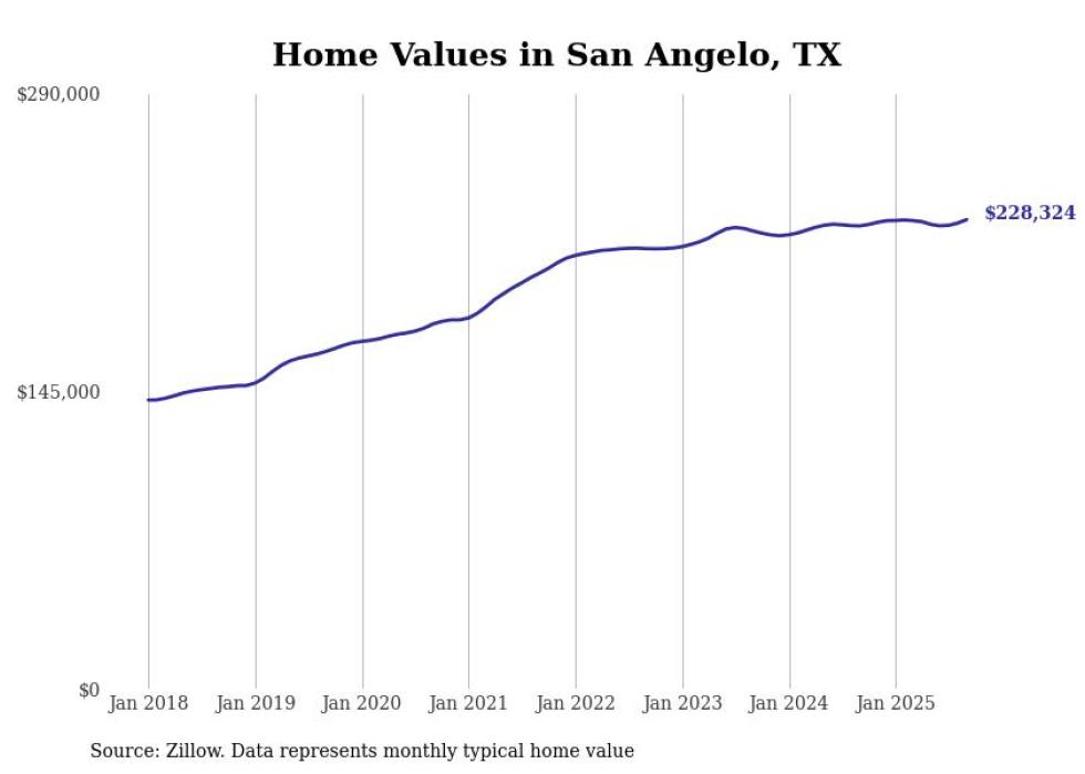 Stacker compiled a list of cities with the most expensive homes in the San Angelo, TX metro area using data from Zillow. Charts show the monthly typical home value since January 2018.