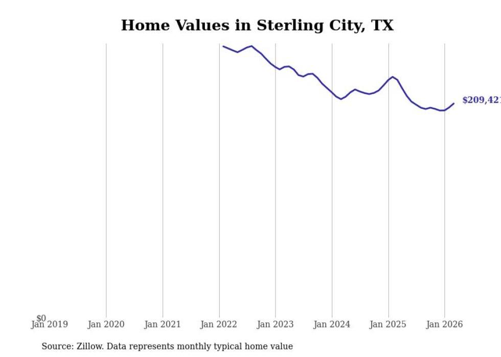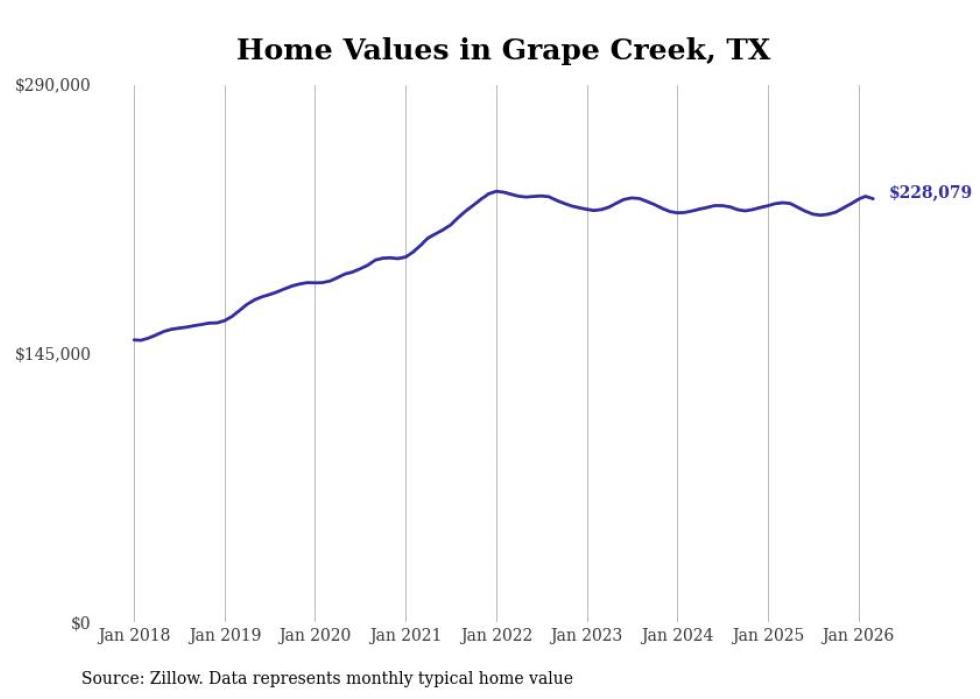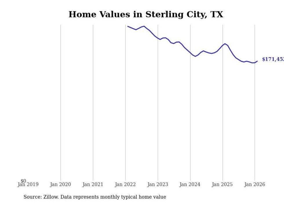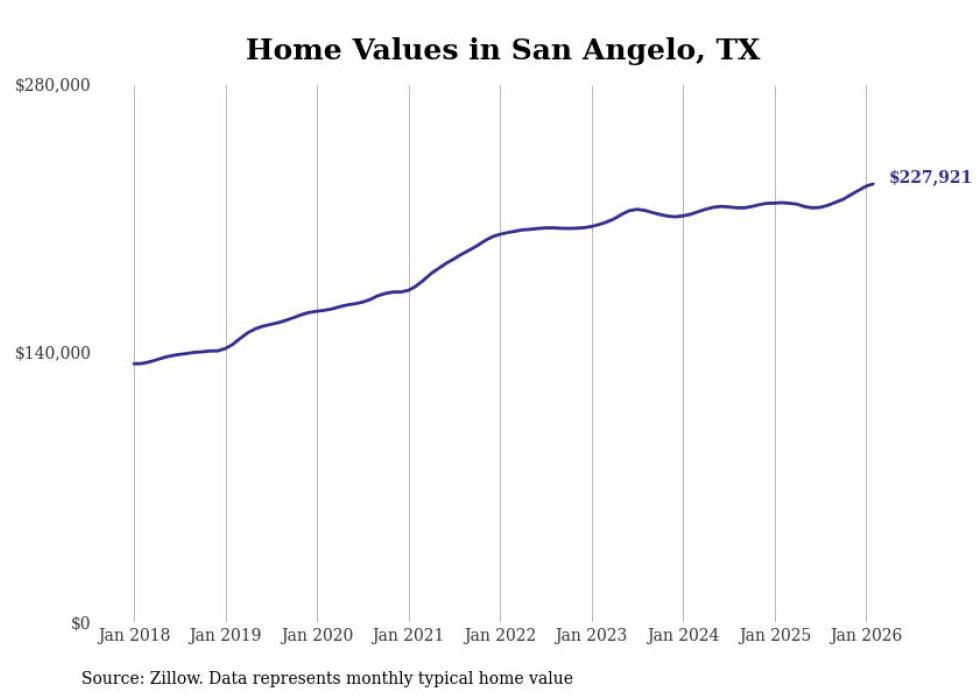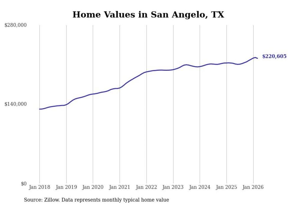 Stacker compiled a list of cities with the most expensive homes in the San Angelo metro area using data from Zillow. Charts show the monthly typical home value since January 2018. All 6 cities and towns with data available were included in the list.