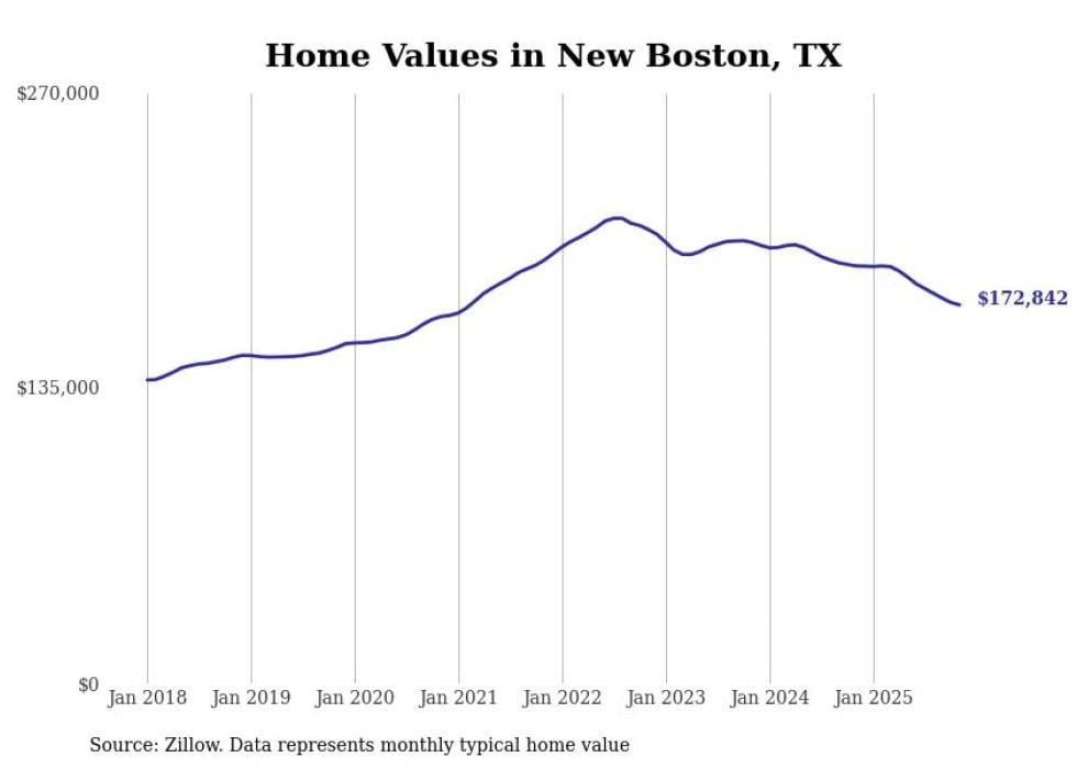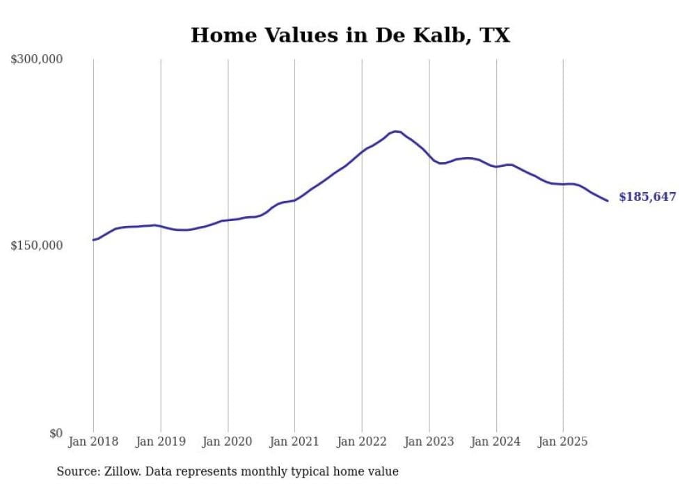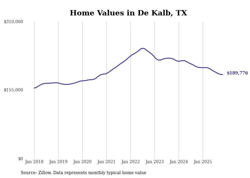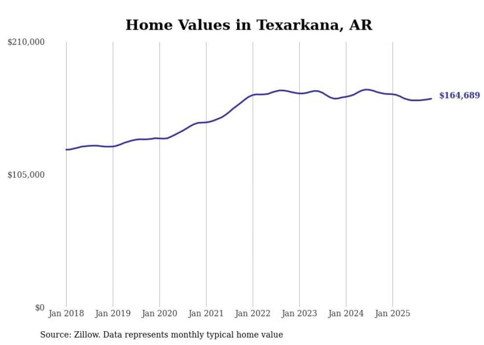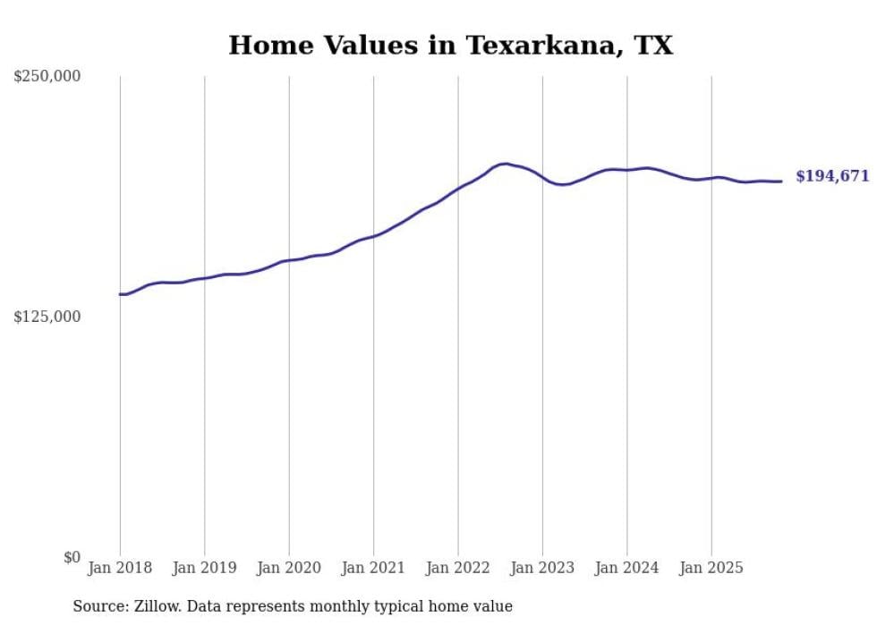 Stacker compiled a list of cities with the most expensive homes in the Texarkana, TX-AR metro area using data from Zillow. Charts show the monthly typical home value since January 2018.