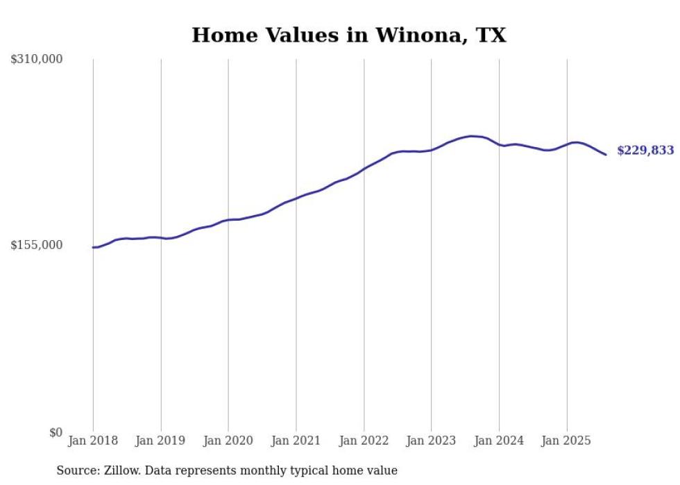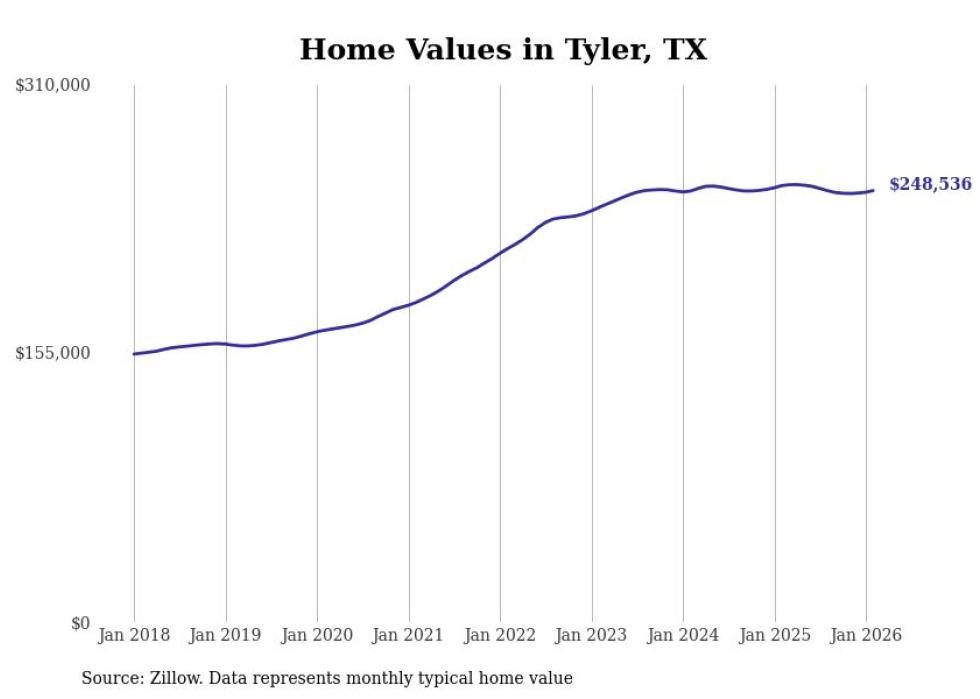 Stacker compiled a list of cities with the most expensive homes in the Tyler metro area using data from Zillow. Charts show the monthly typical home value since January 2018. All 7 cities and towns with data available were included in the list.