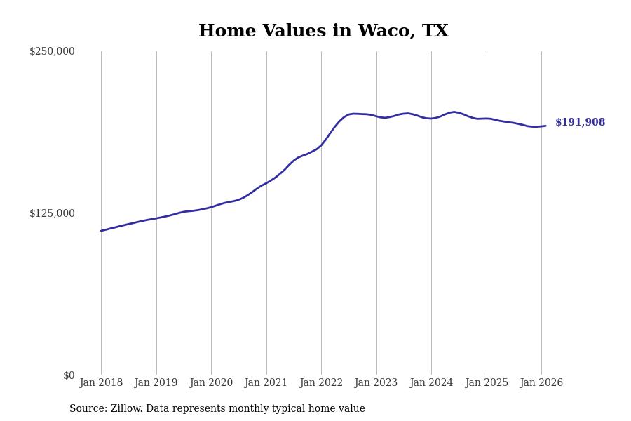 Stacker compiled a list of cities with the most expensive homes in the Waco, TX metro area using data from Zillow. Charts show the monthly typical home value since January 2018.