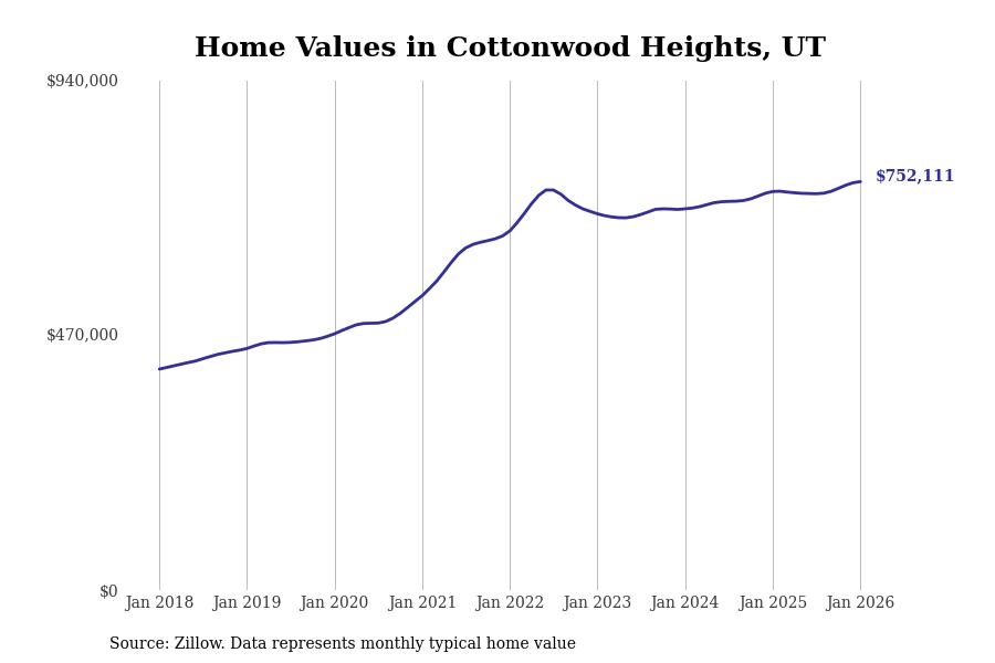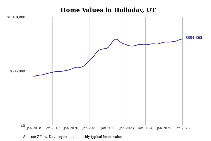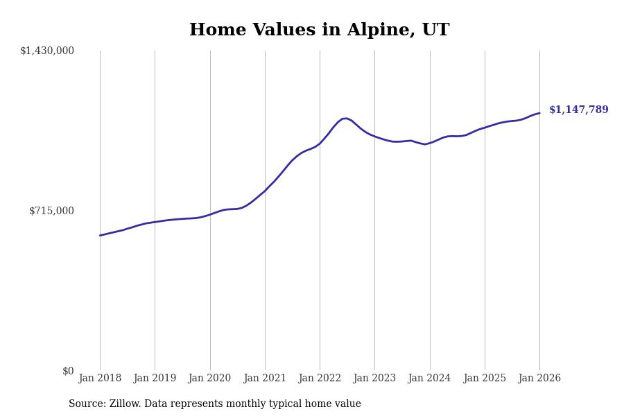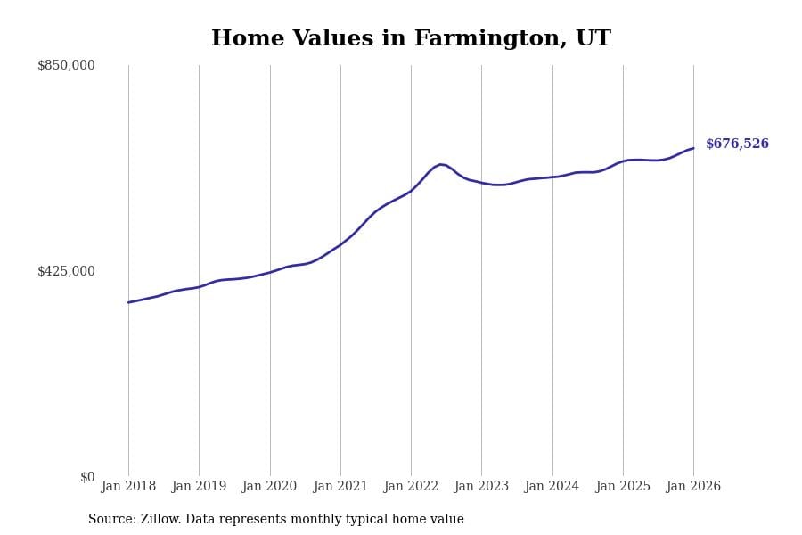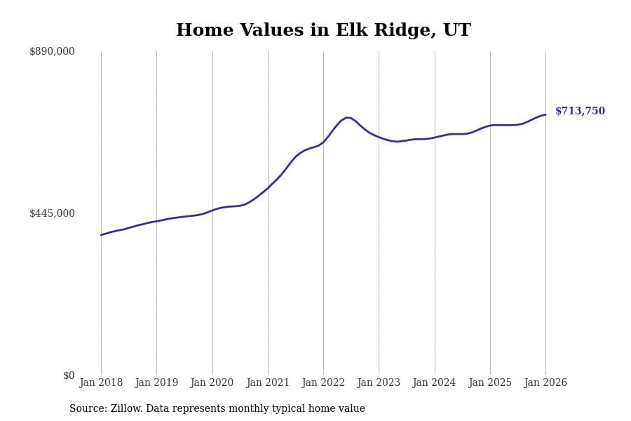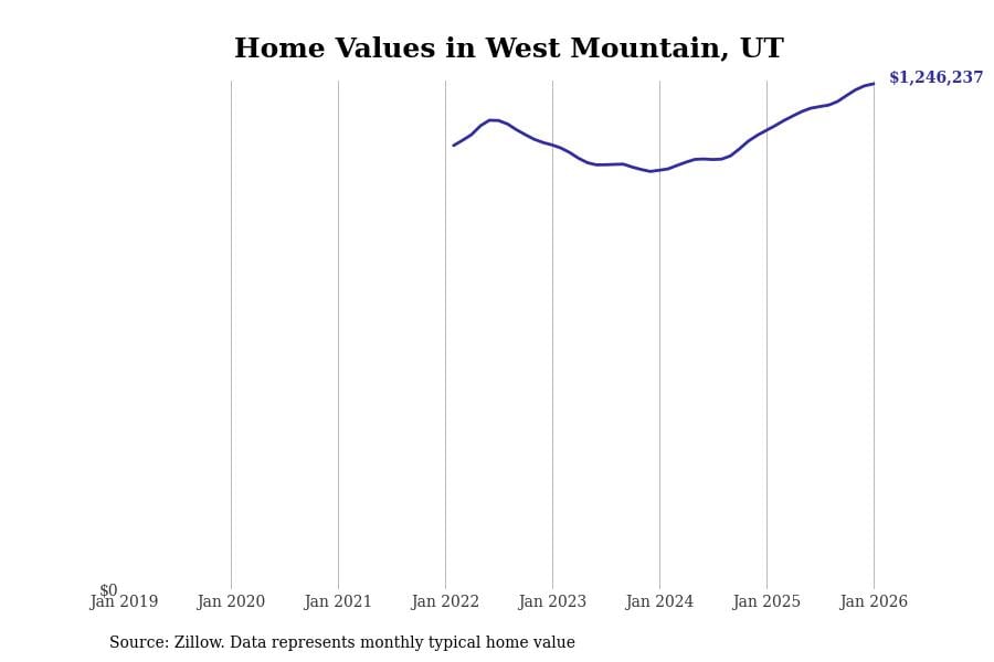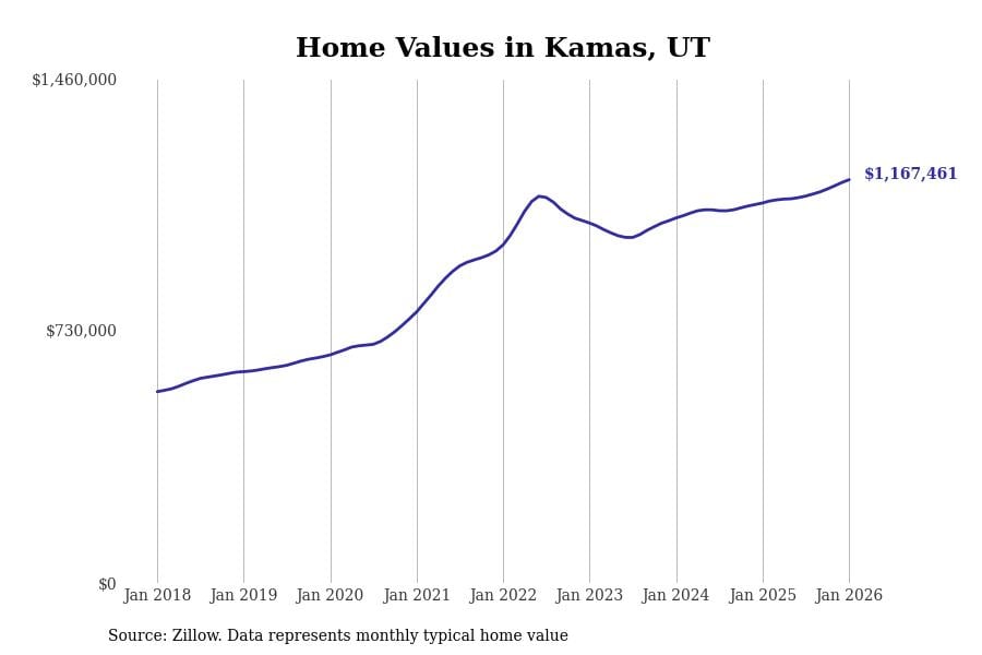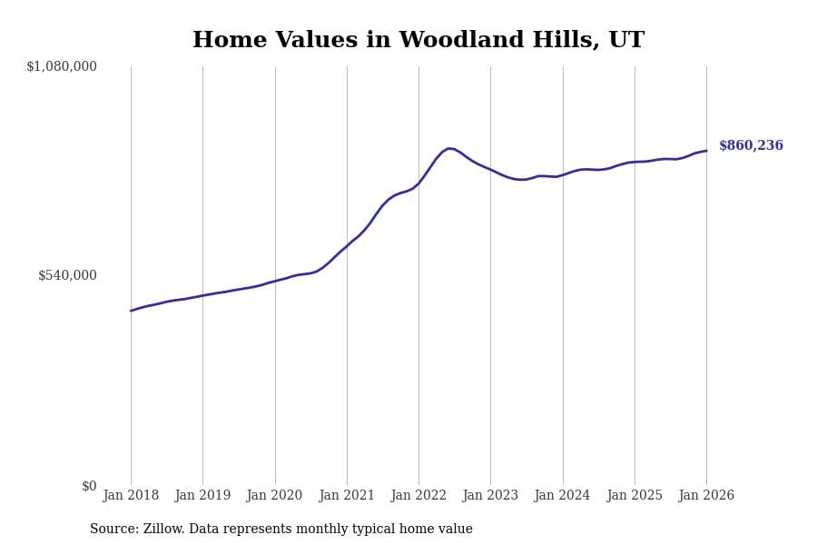 Stacker compiled a list of cities with the most expensive homes in Utah using data from Zillow. Cities are ranked by the Zillow Home Values Index for all homes as of January 2026. The charts in this story were created automatically using Matplotlib.