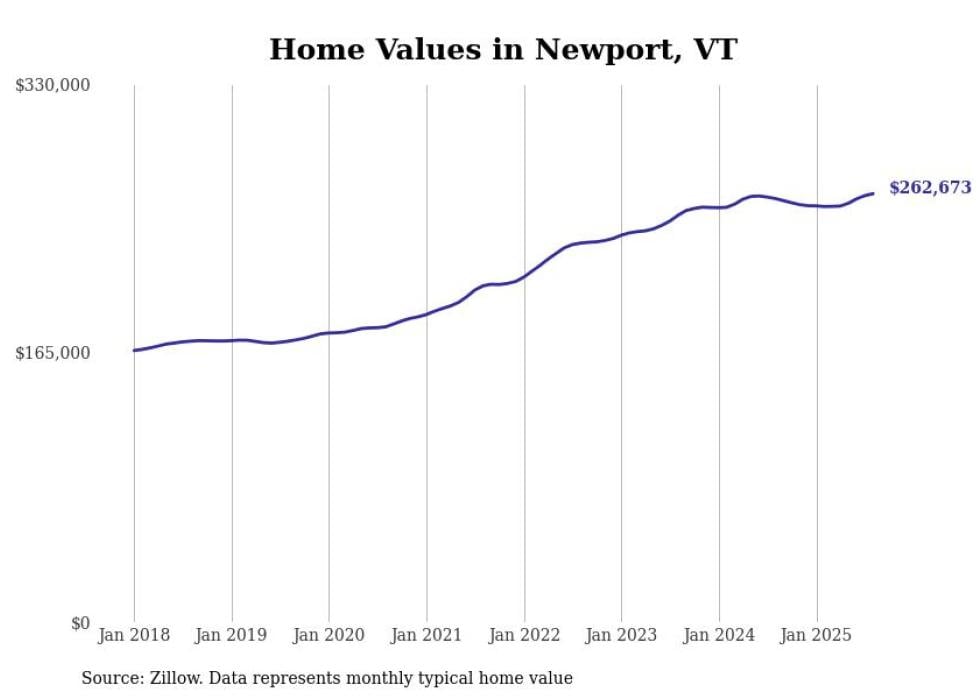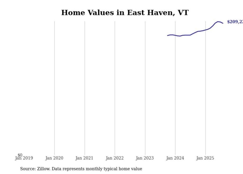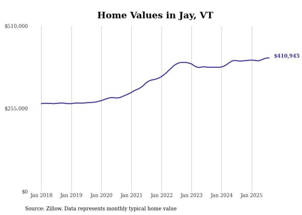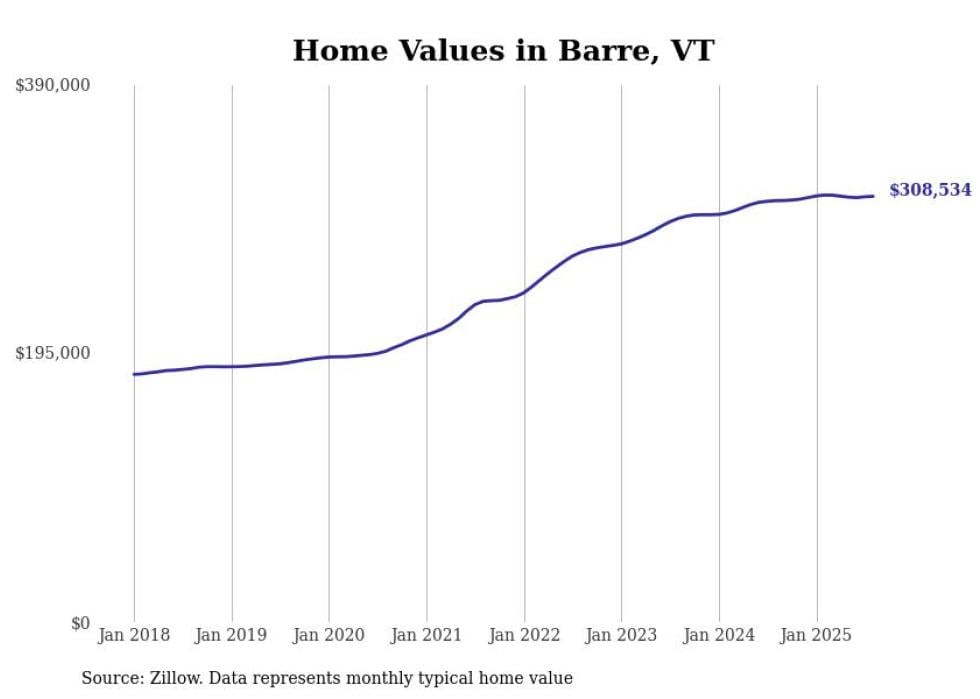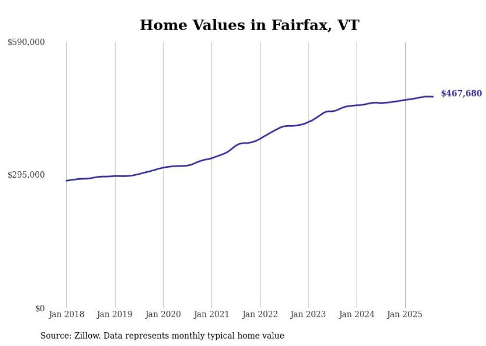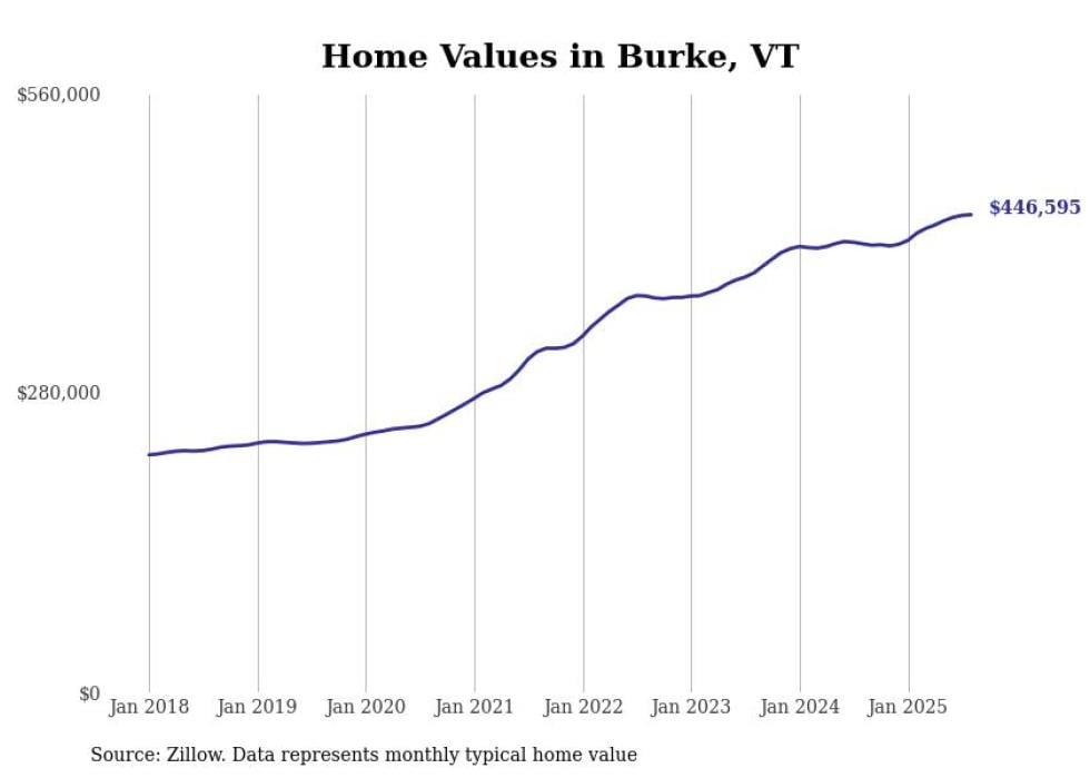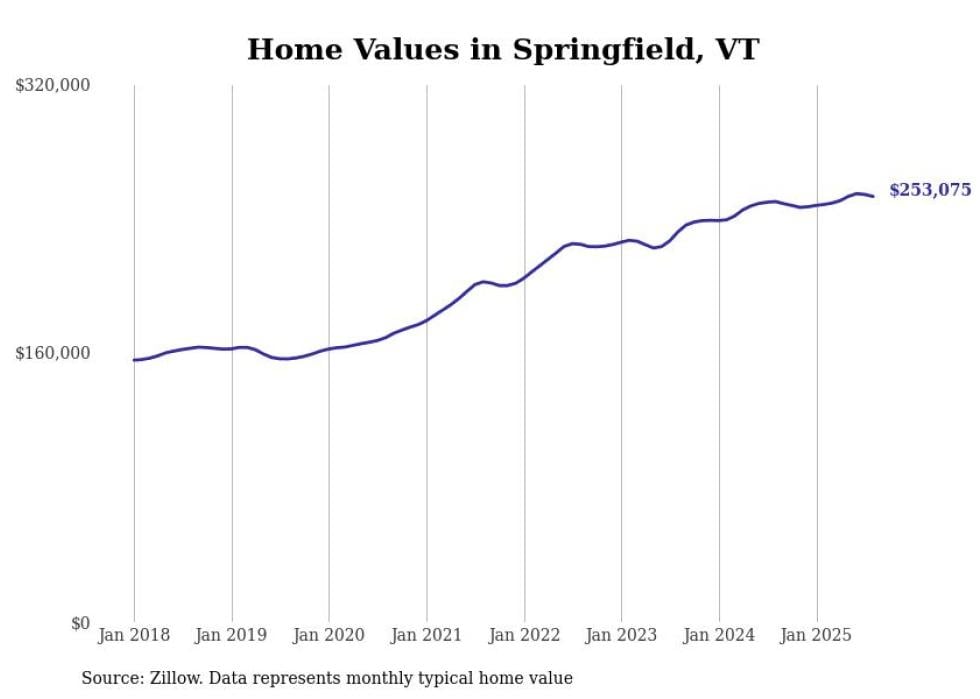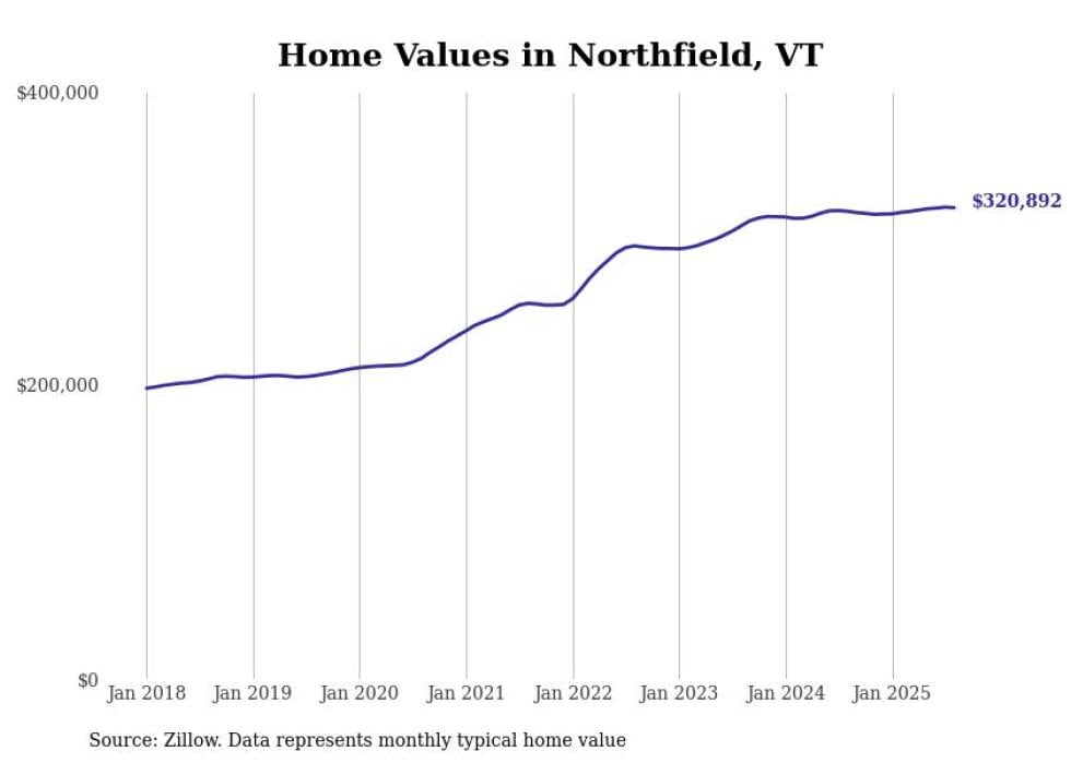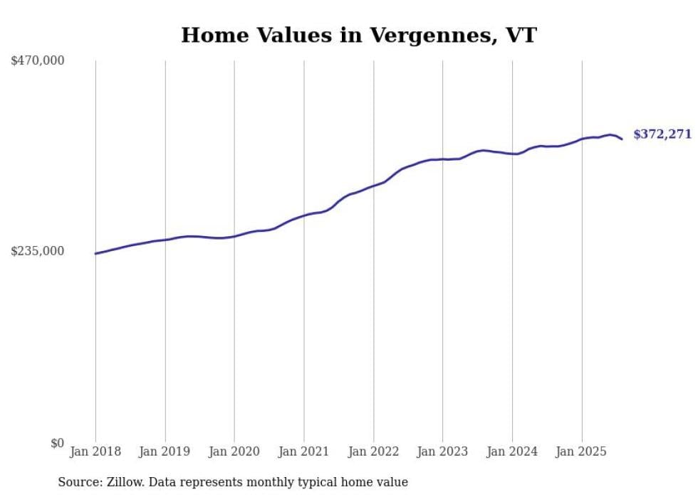 Stacker compiled a list of cities with the fastest-growing home prices in Vermont using data from Zillow. Cities are ranked by the dollar change in the Zillow Home Values Index for all homes from the 12 months ending August 2025. The charts in this story were created automatically using Matplotlib. Data was available for 50 cities and towns in Vermont.