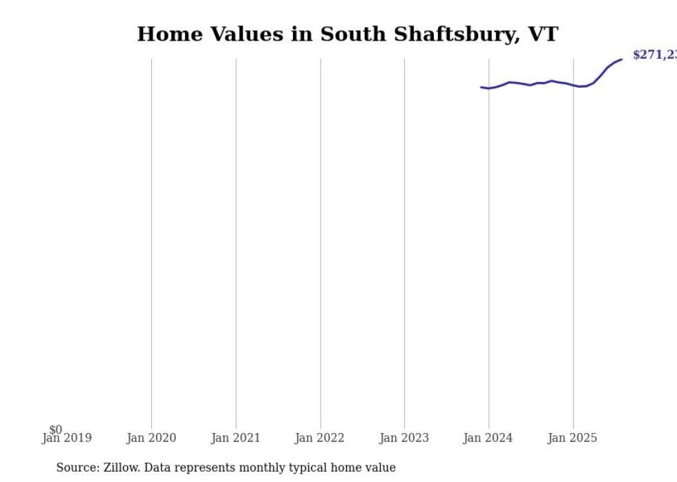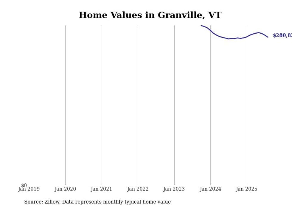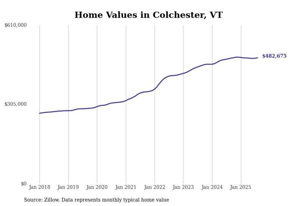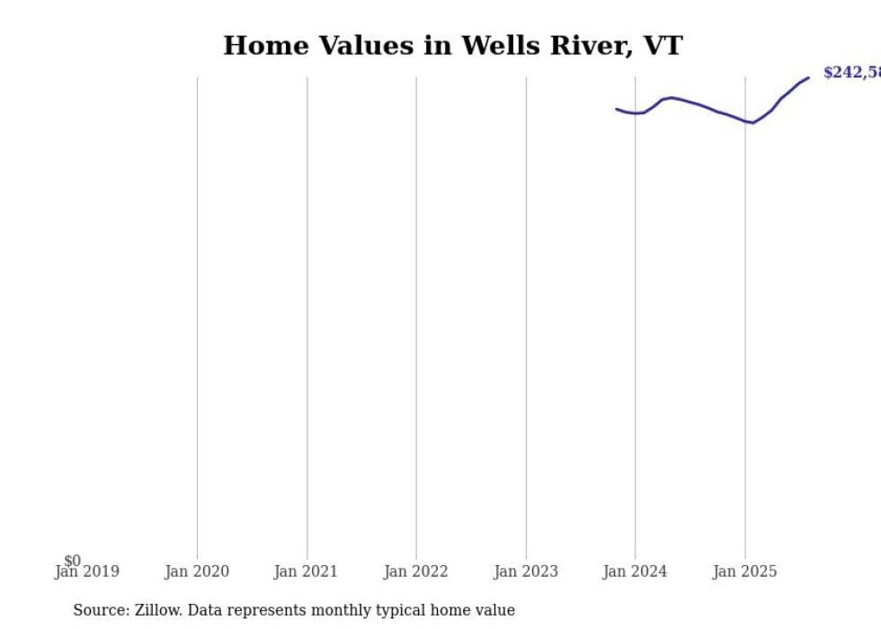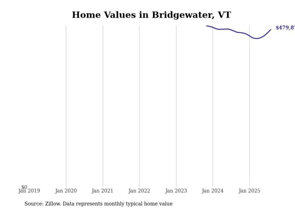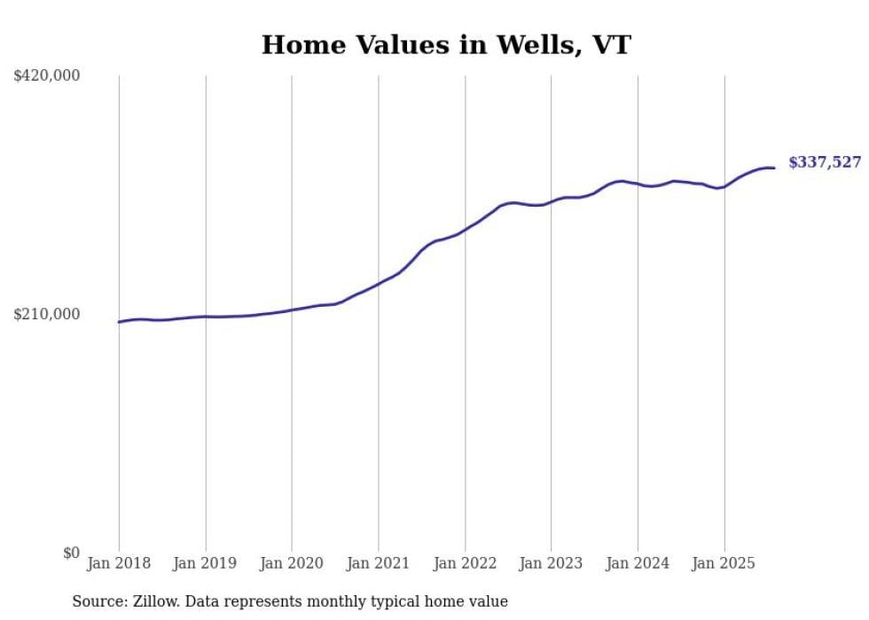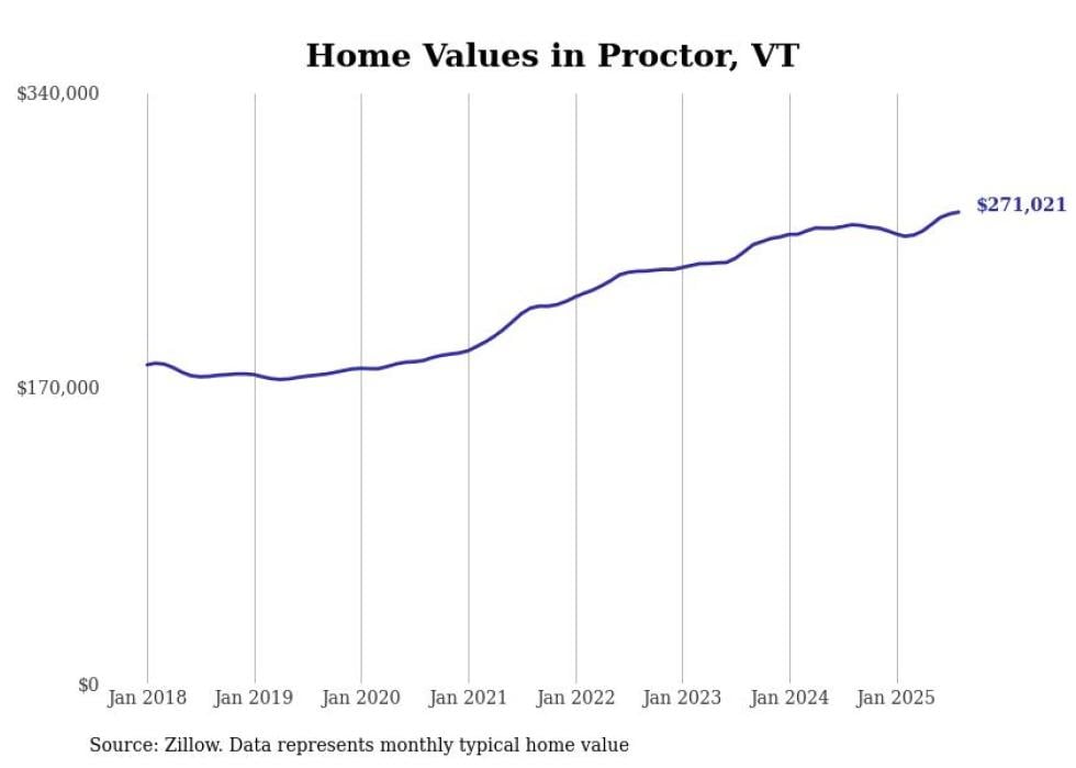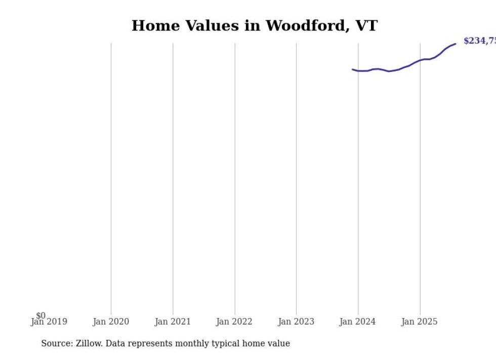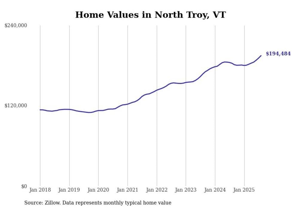Stacker compiled a list of cities with the fastest-growing home prices in Vermont using data from Zillow. Cities are ranked by the dollar change in the Zillow Home Values Index for all homes from the 12 months ending August 2025. The charts in this story were created automatically using Matplotlib. Data was available for 50 cities and towns in Vermont.