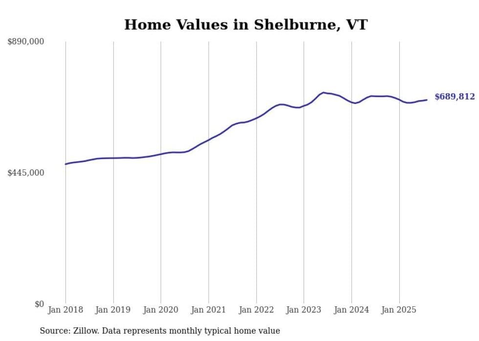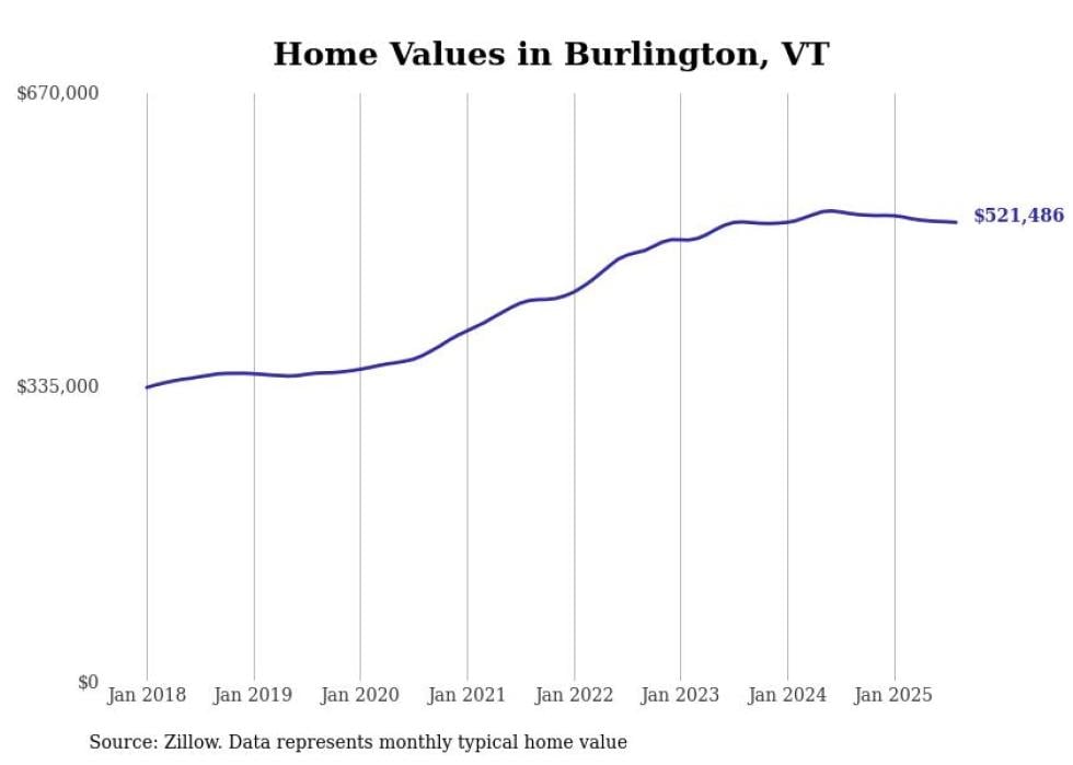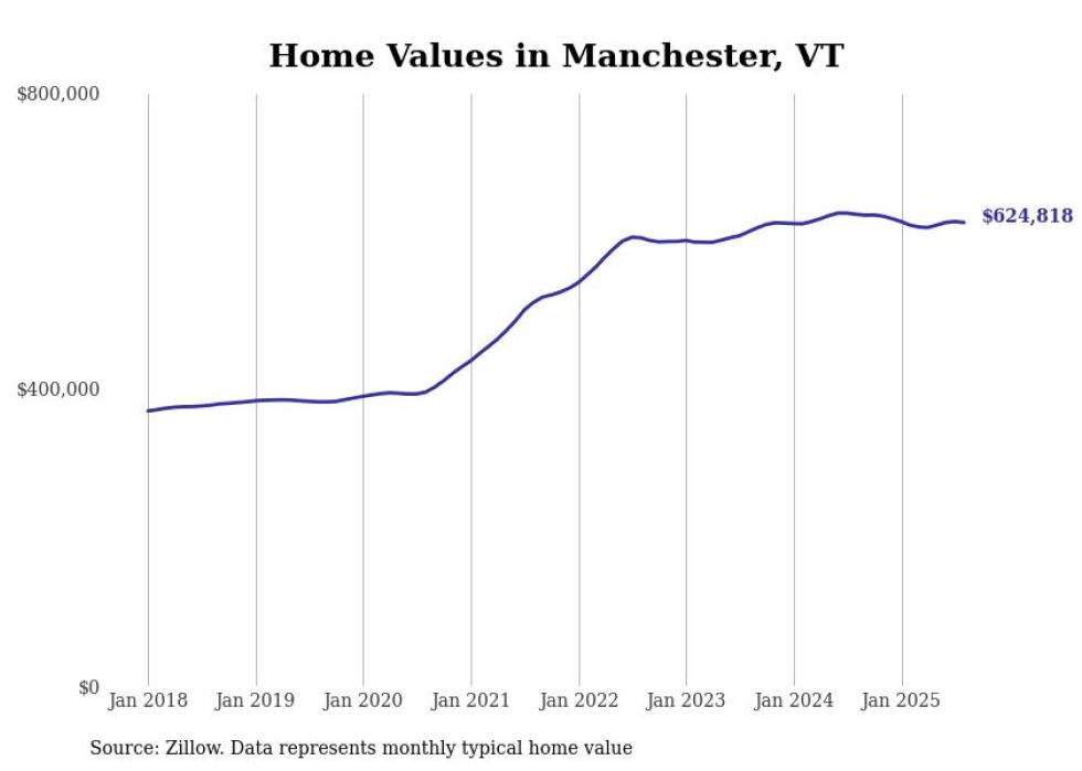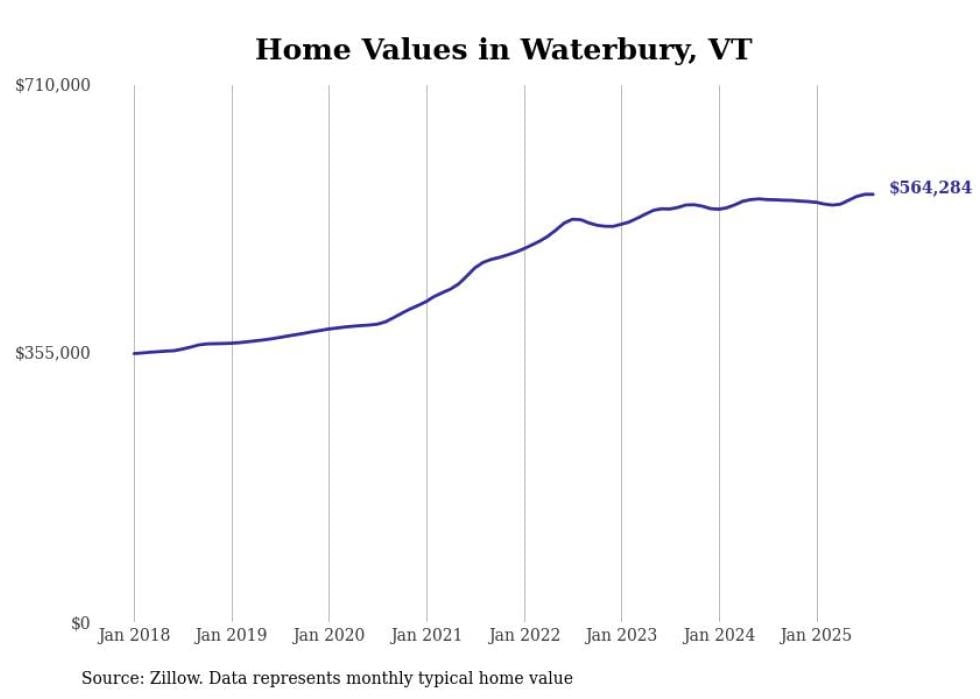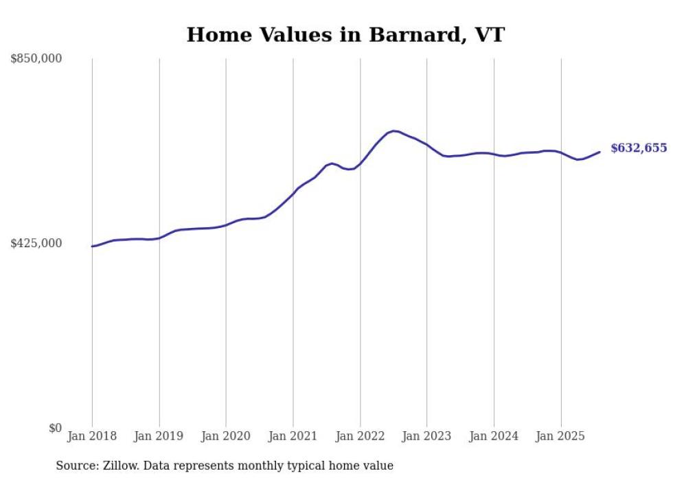 Stacker compiled a list of cities with the most expensive homes in Vermont using data from Zillow. Cities are ranked by the Zillow Home Values Index for all homes as of August 2025. The charts in this story were created automatically using Matplotlib.