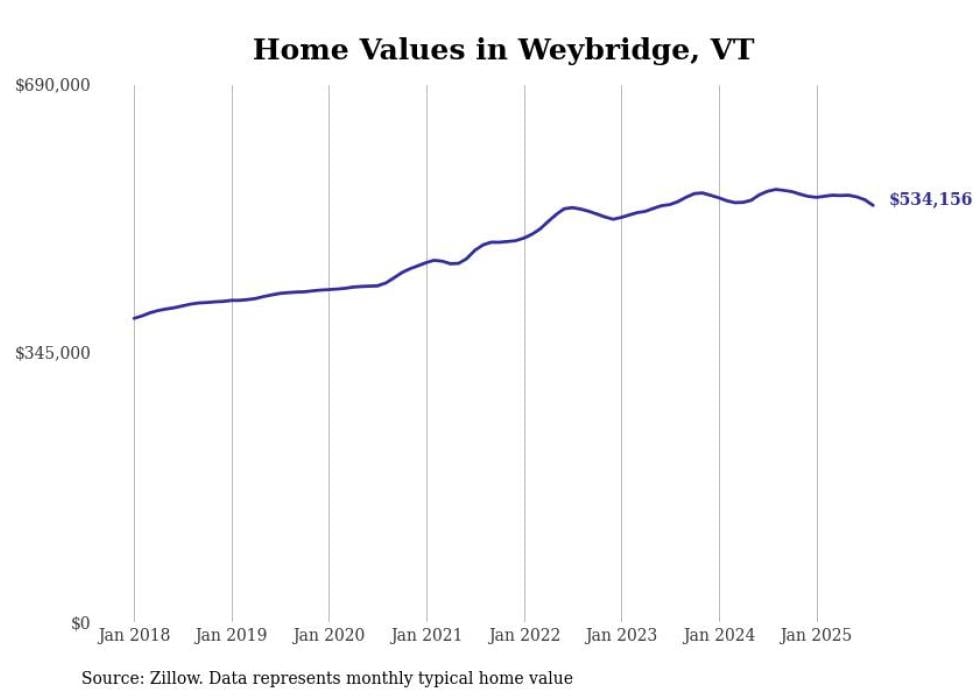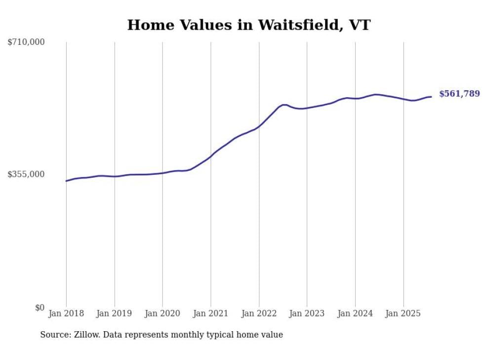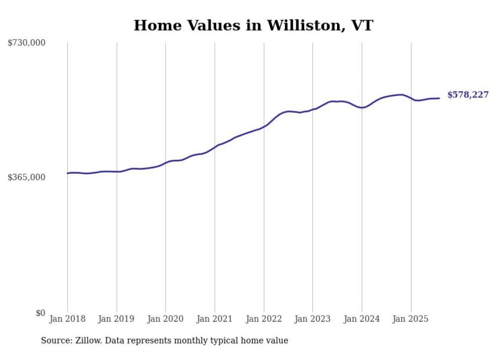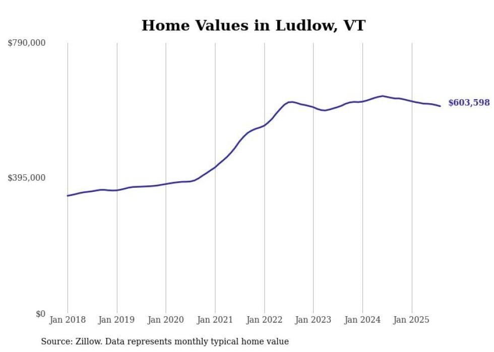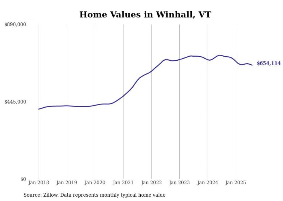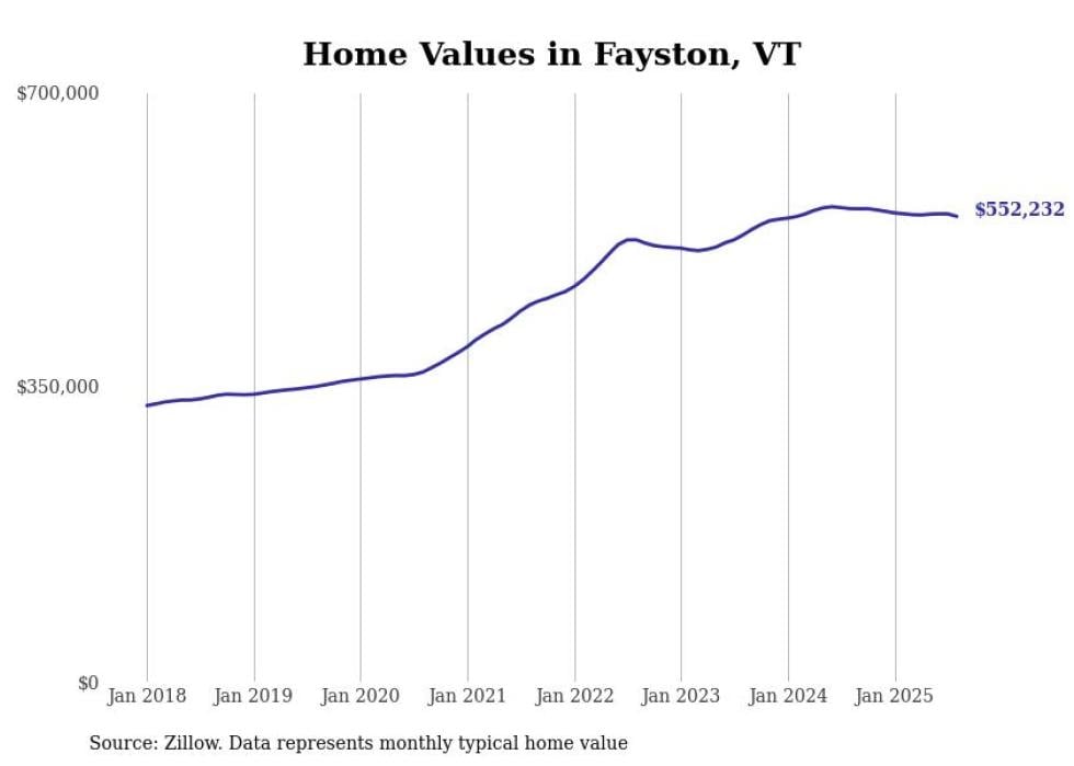 Stacker compiled a list of cities with the most expensive homes in Vermont using data from Zillow. Cities are ranked by the Zillow Home Values Index for all homes as of August 2025. The charts in this story were created automatically using Matplotlib.
