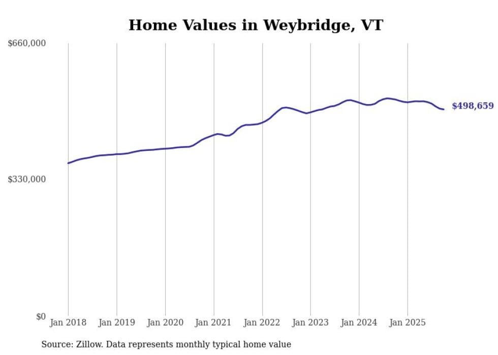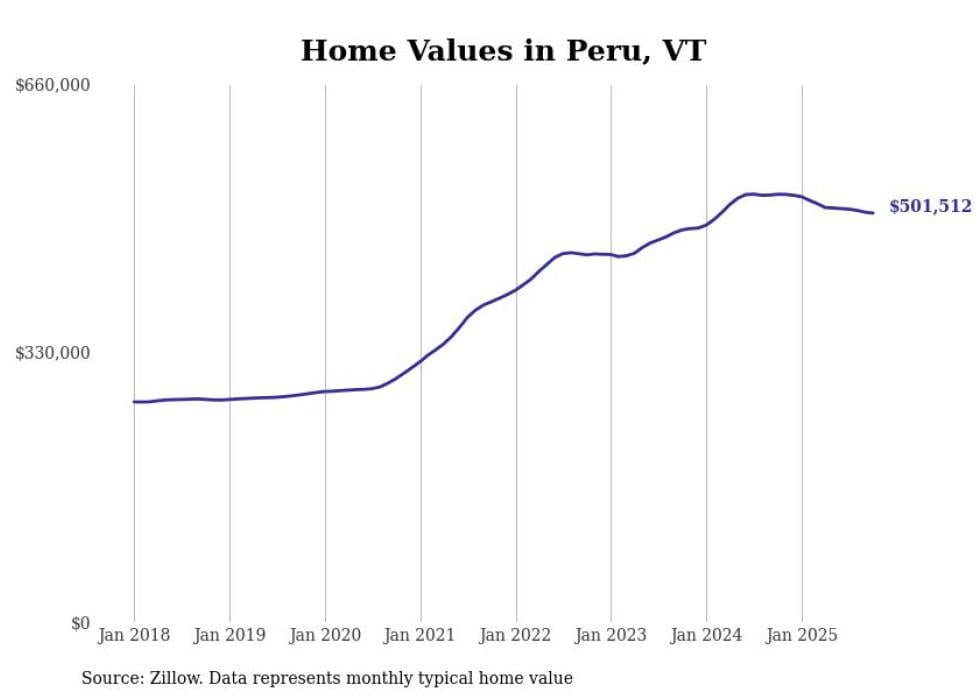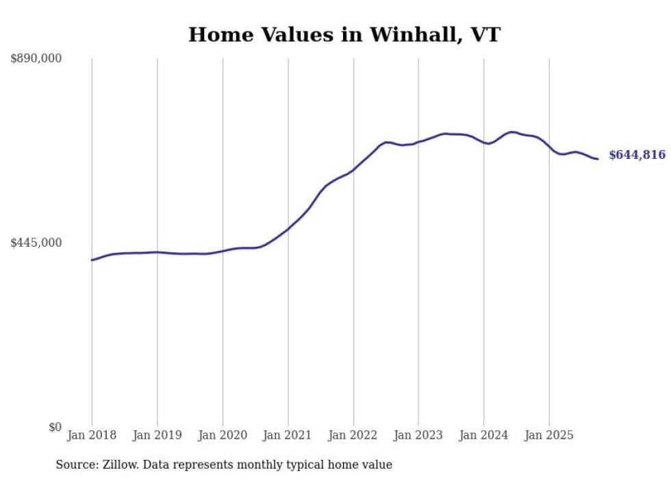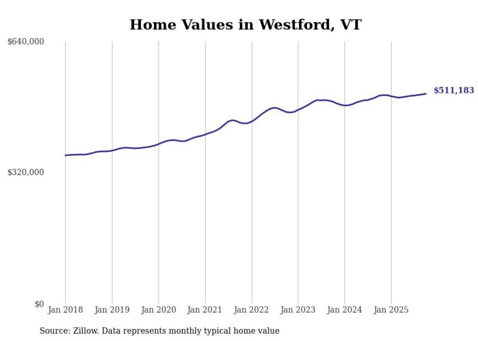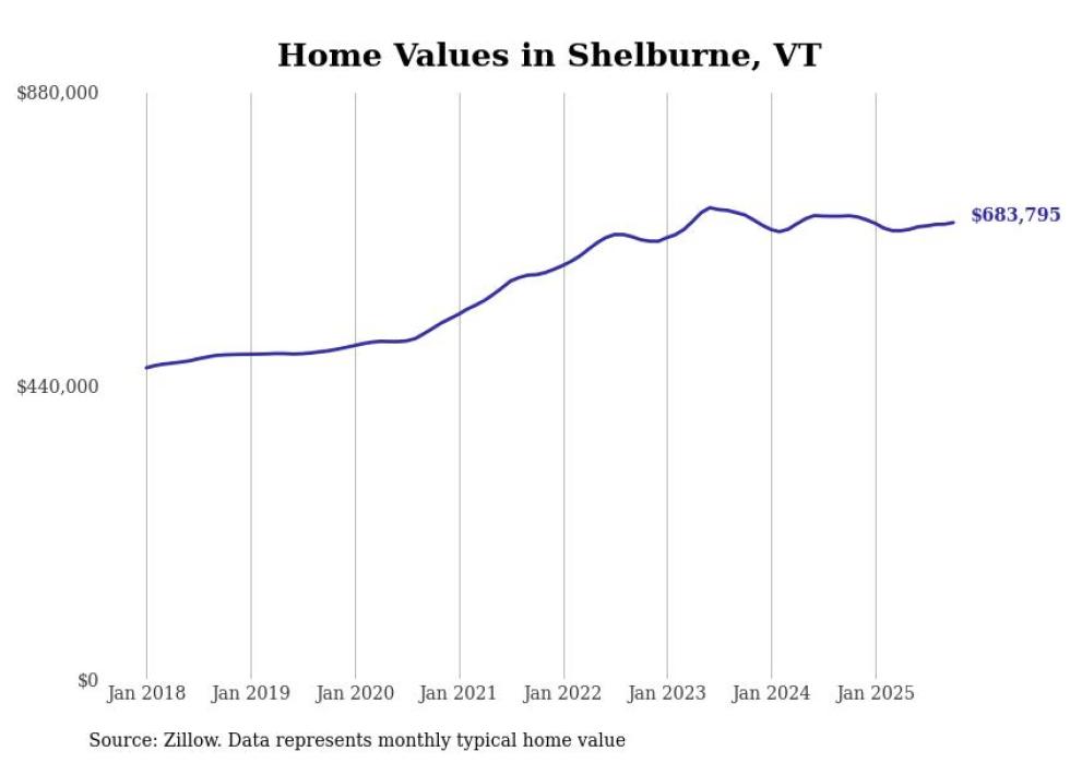 Stacker compiled a list of cities with the most expensive homes in Vermont using data from Zillow. Cities are ranked by the Zillow Home Values Index for all homes as of October 2025. The charts in this story were created automatically using Matplotlib.