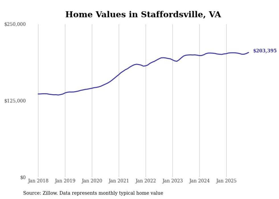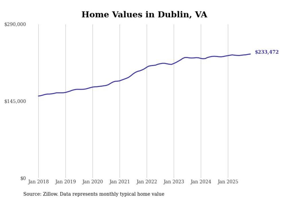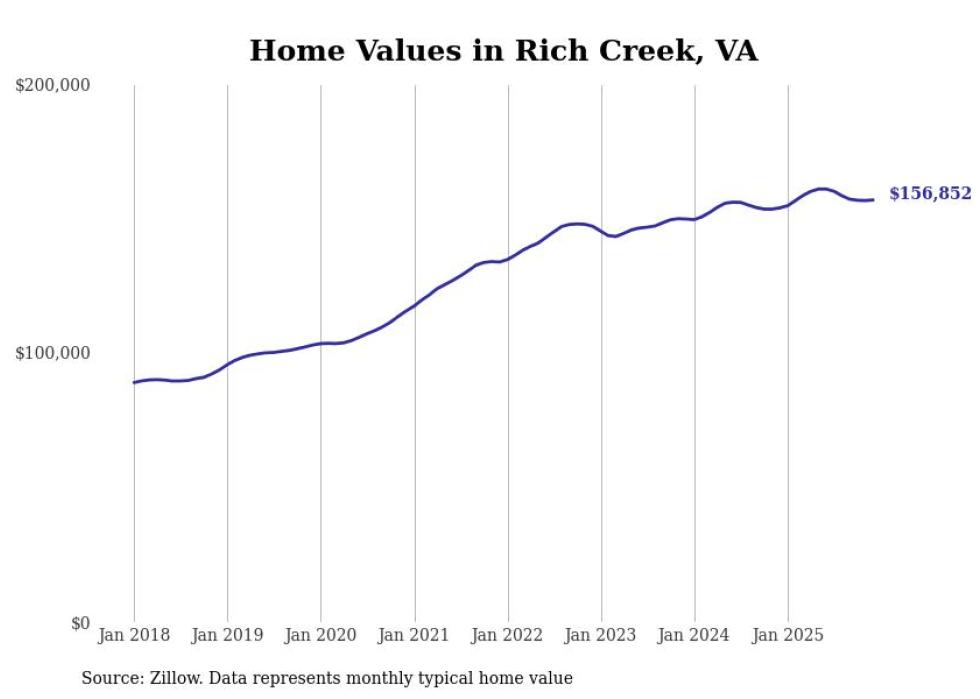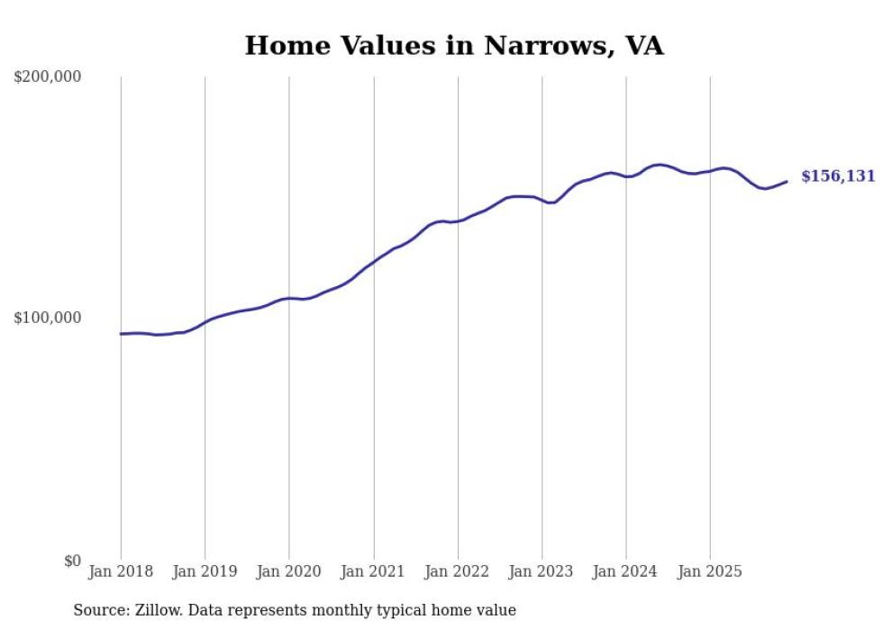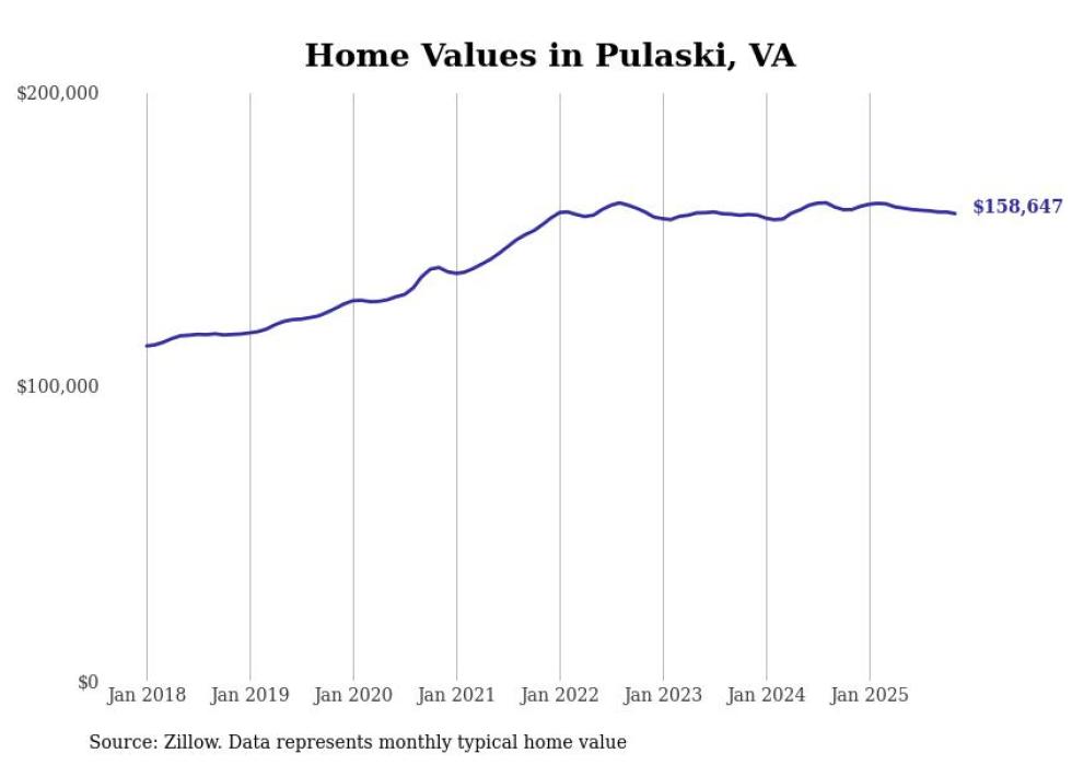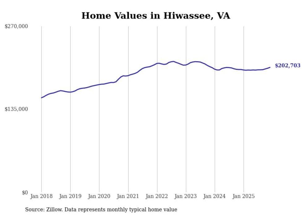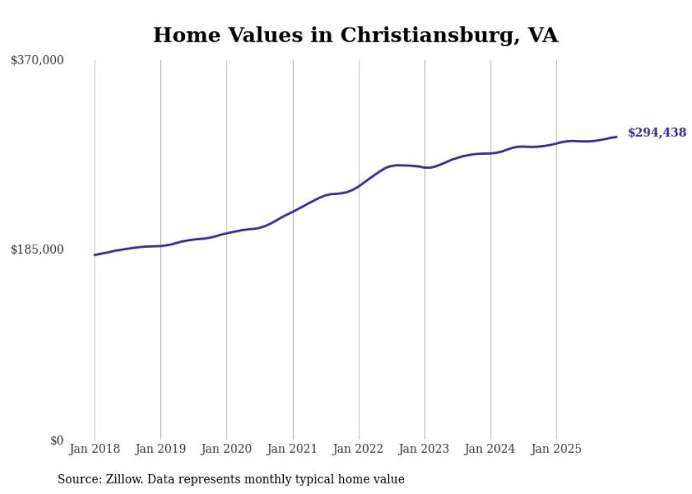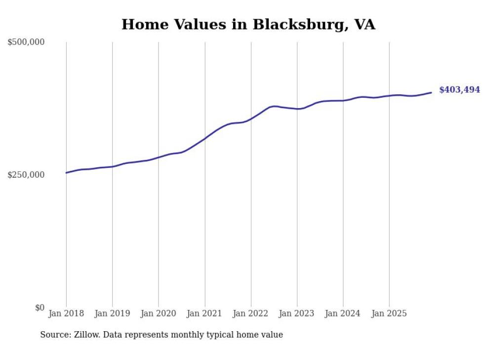 Stacker compiled a list of cities with the most expensive homes in the Blacksburg metro area using data from Zillow. Charts show the monthly typical home value since January 2018. All 18 cities and towns with data available were included in the list.