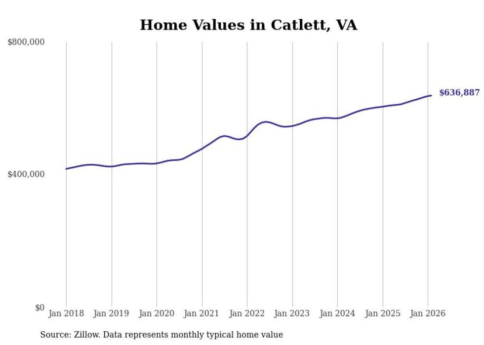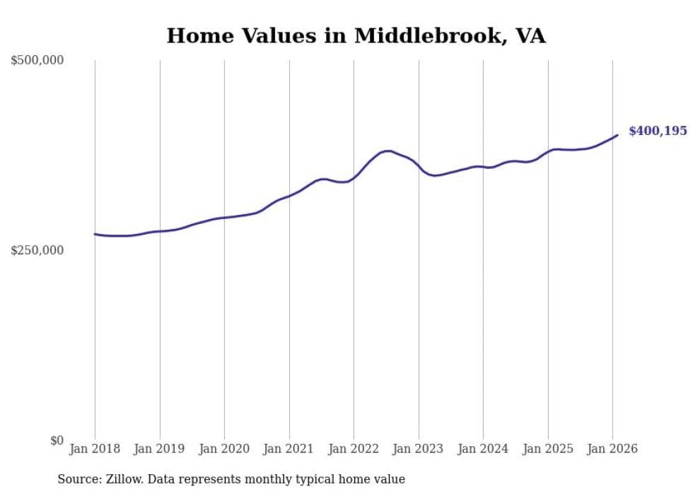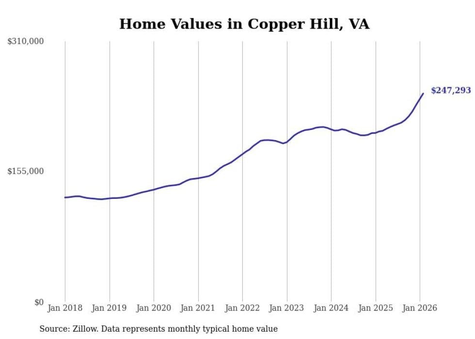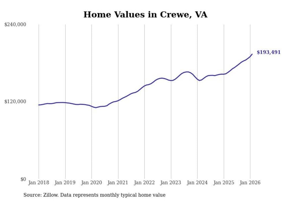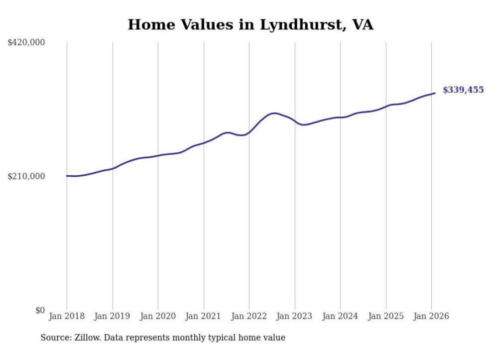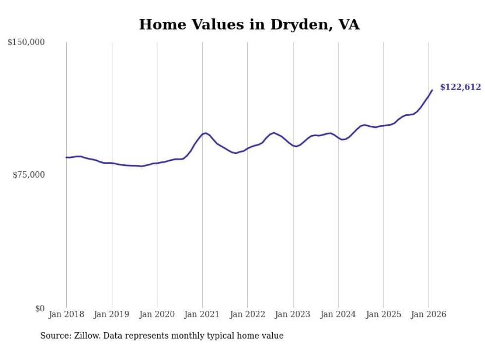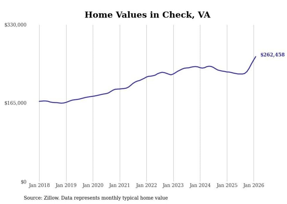 Stacker compiled a list of cities with the fastest-growing home prices in Virginia using data from Zillow. Cities are ranked by the dollar change in the Zillow Home Values Index for all homes from the 12 months ending February 2026. The charts in this story were created automatically using Matplotlib. Data was available for 50 cities and towns in Virginia.