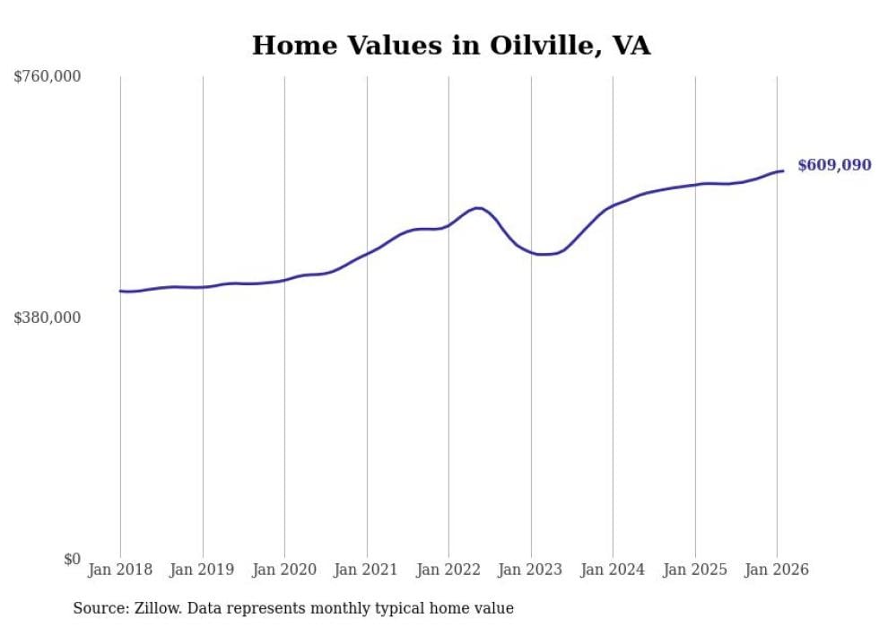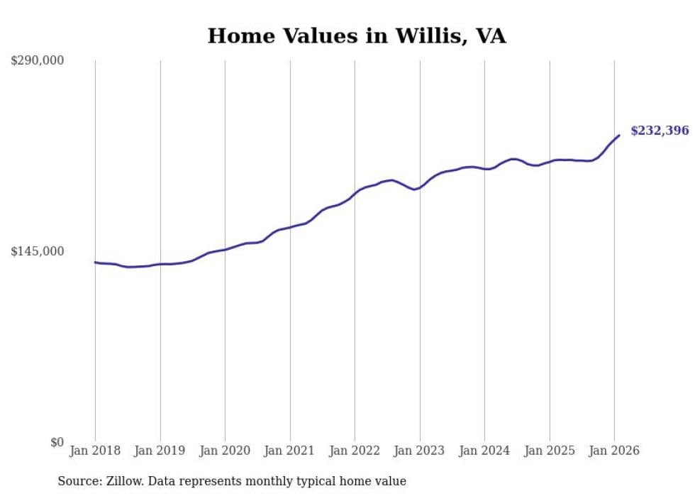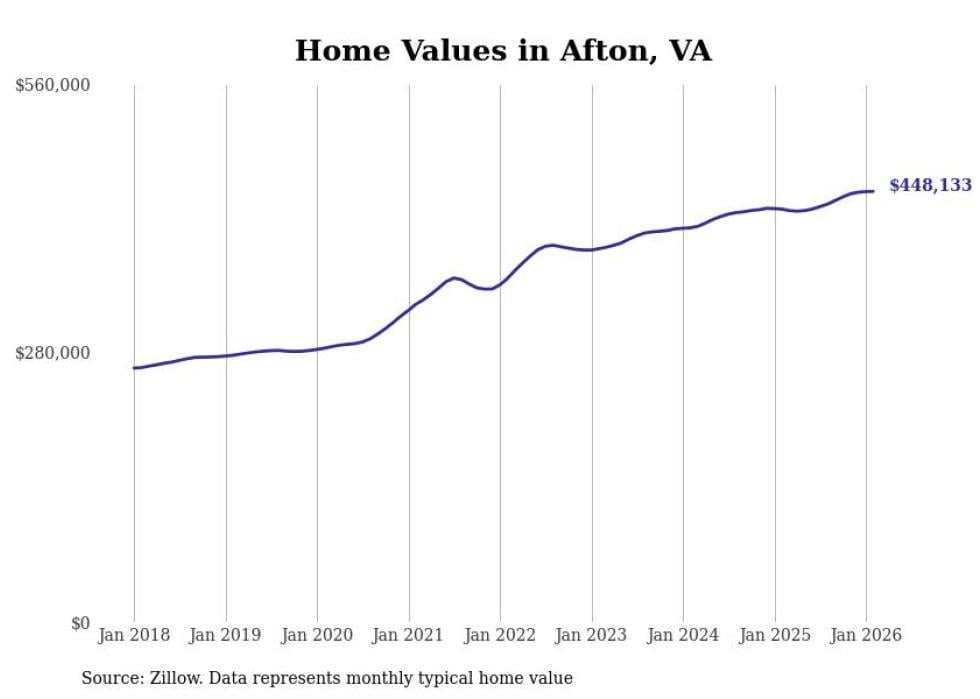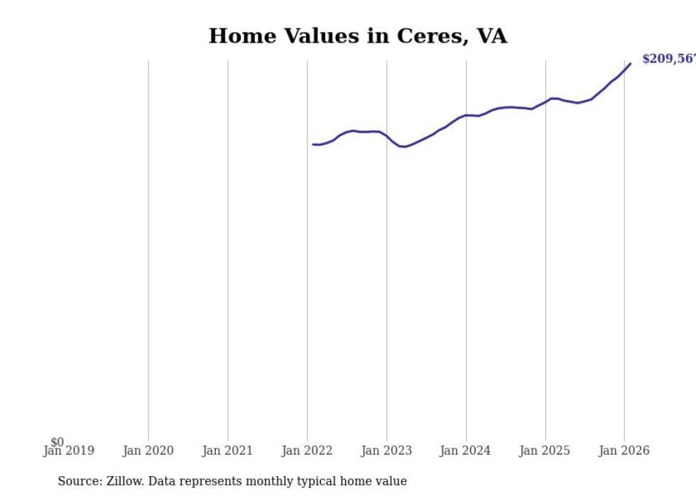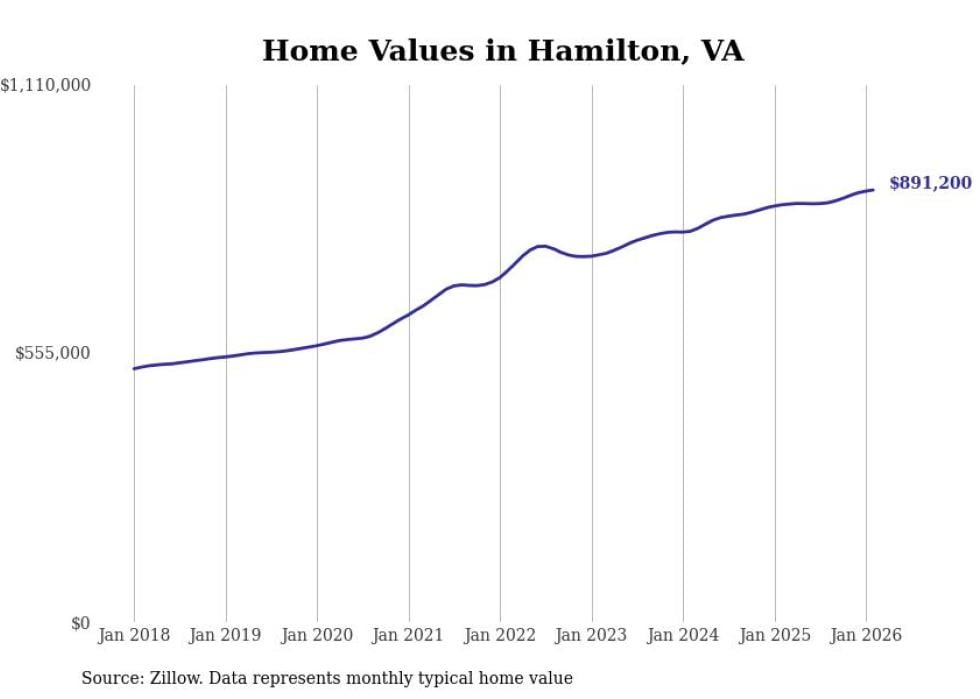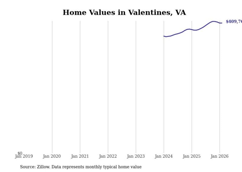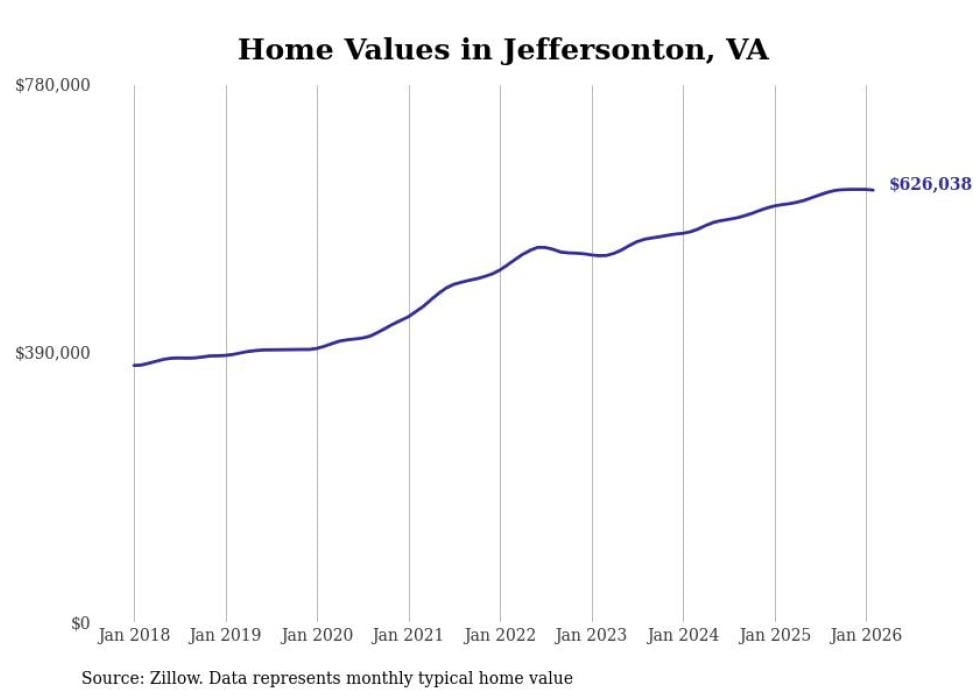 Stacker compiled a list of cities with the fastest-growing home prices in Virginia using data from Zillow. Cities are ranked by the dollar change in the Zillow Home Values Index for all homes from the 12 months ending February 2026. The charts in this story were created automatically using Matplotlib. Data was available for 50 cities and towns in Virginia.