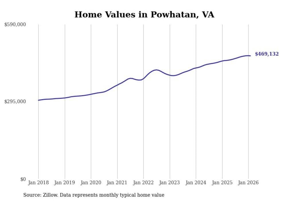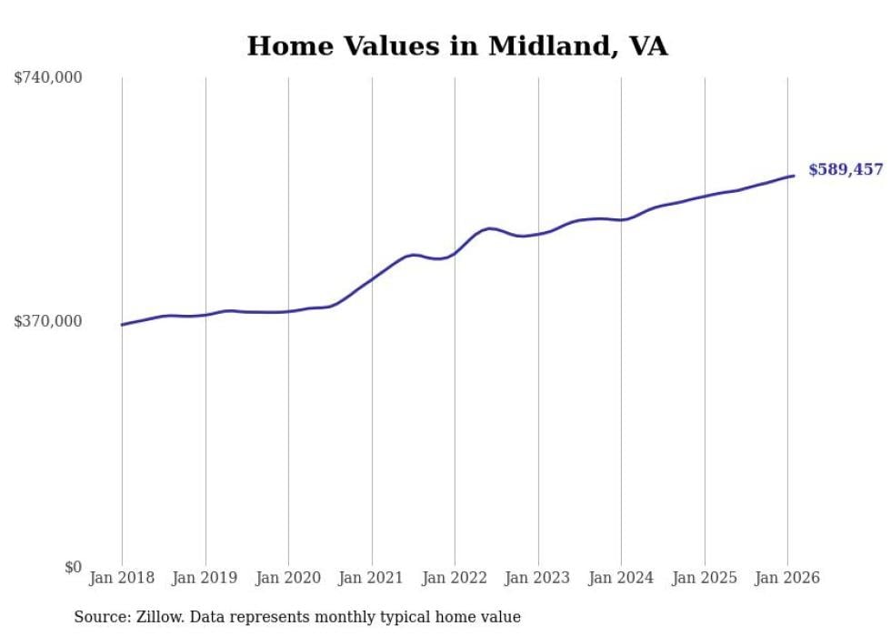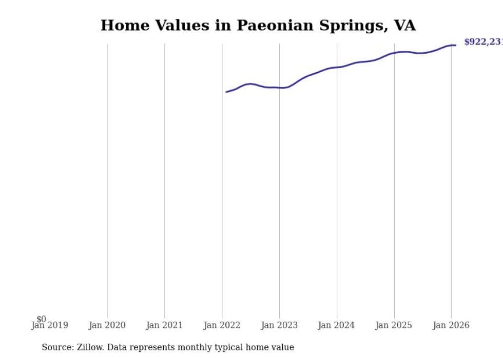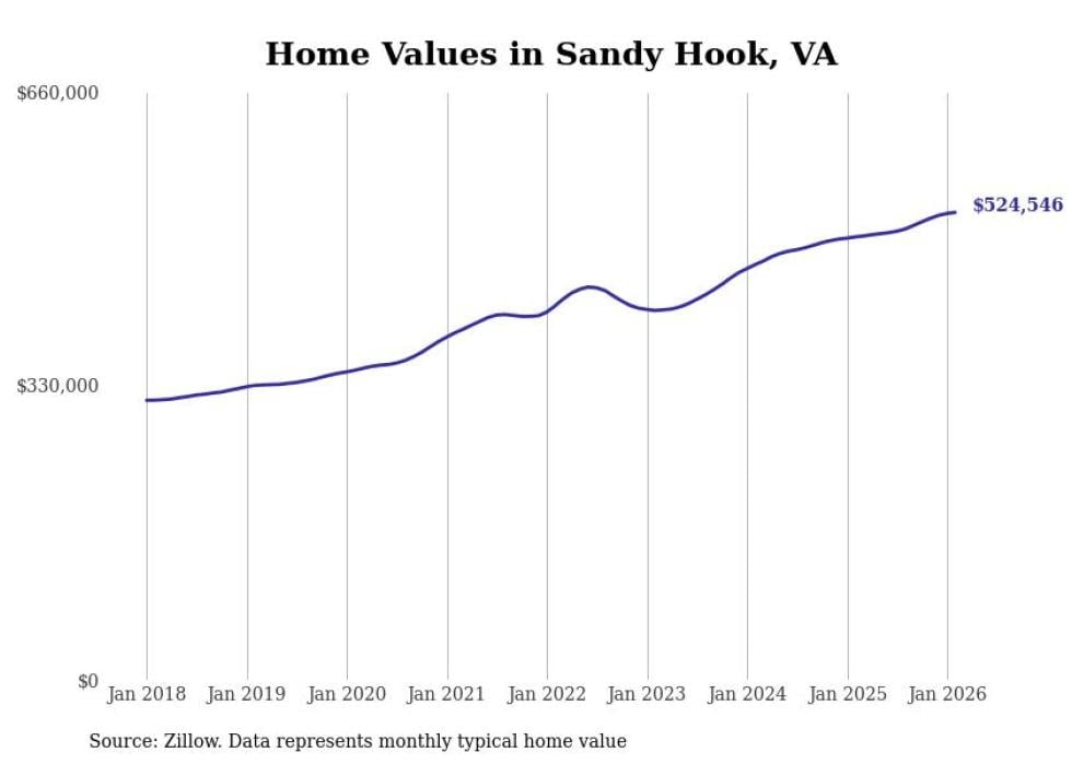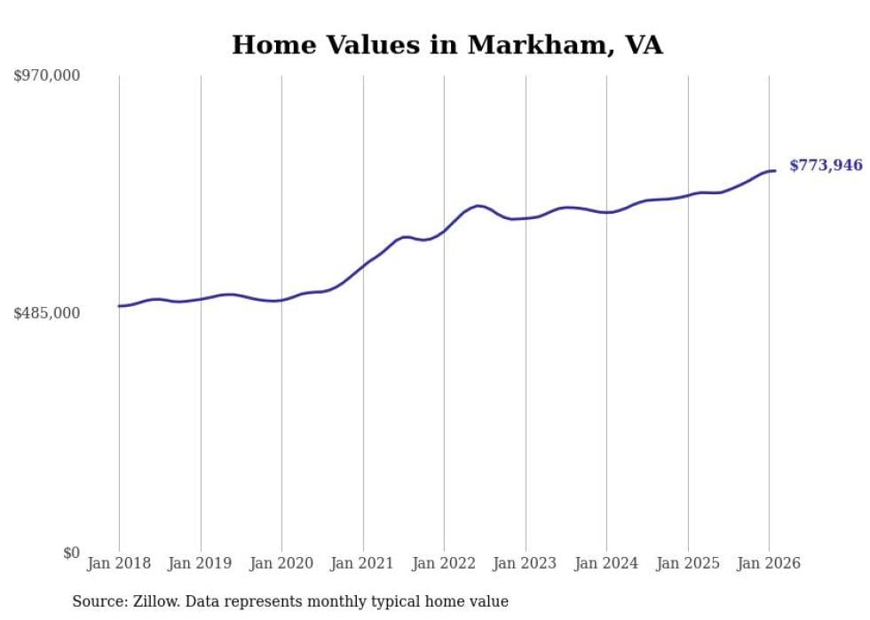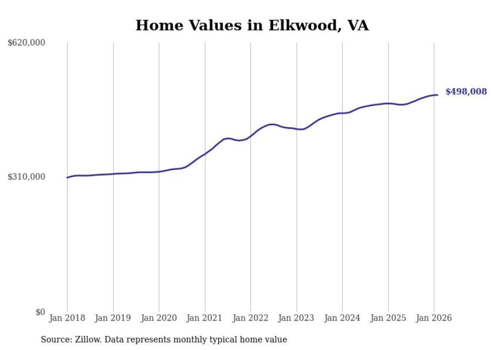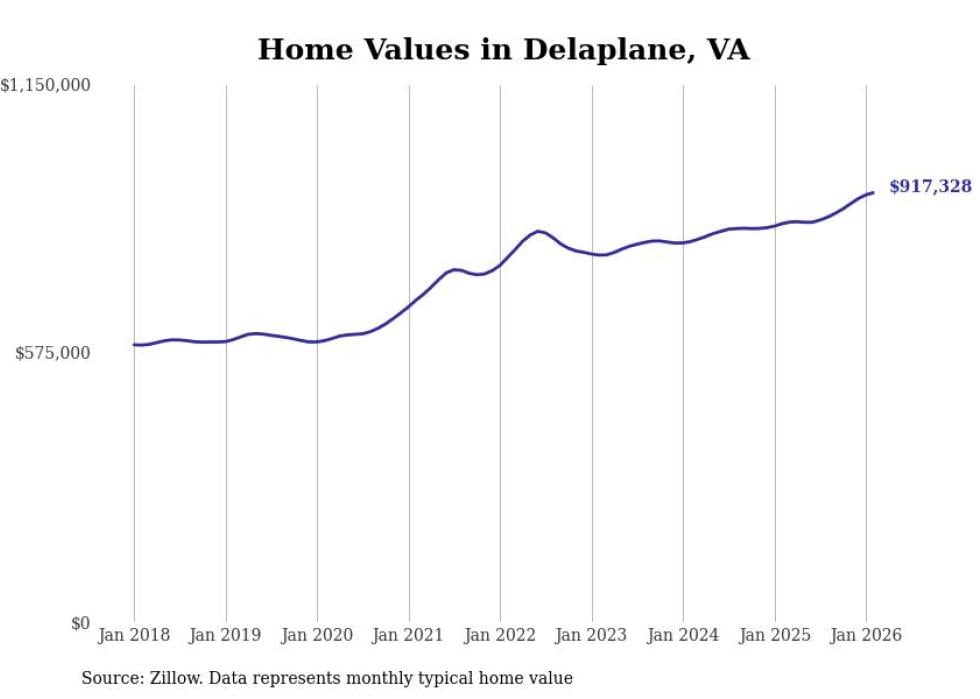 Stacker compiled a list of cities with the fastest-growing home prices in Virginia using data from Zillow. Cities are ranked by the dollar change in the Zillow Home Values Index for all homes from the 12 months ending February 2026. The charts in this story were created automatically using Matplotlib. Data was available for 50 cities and towns in Virginia.