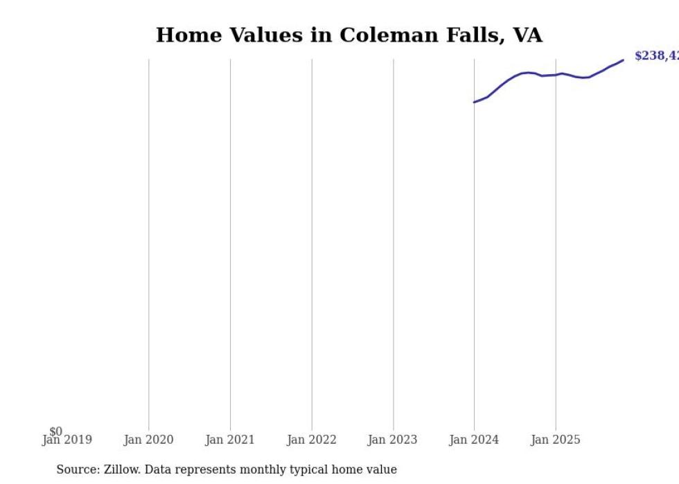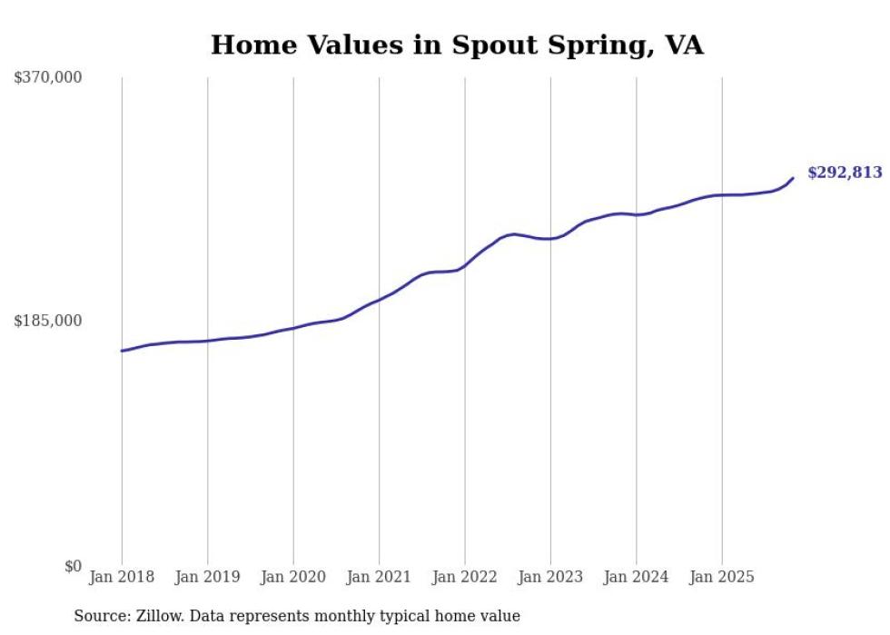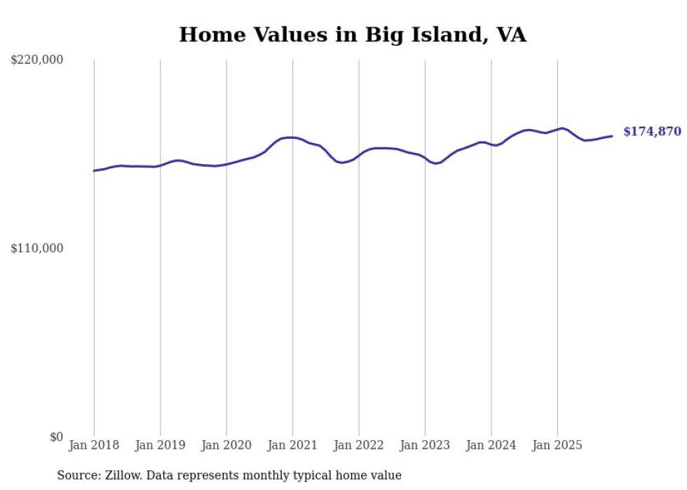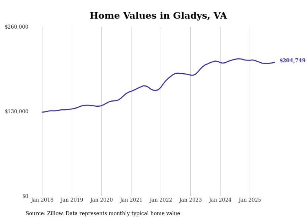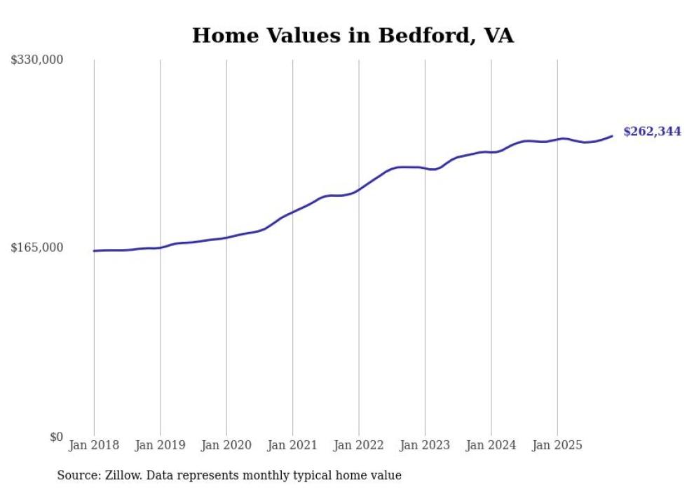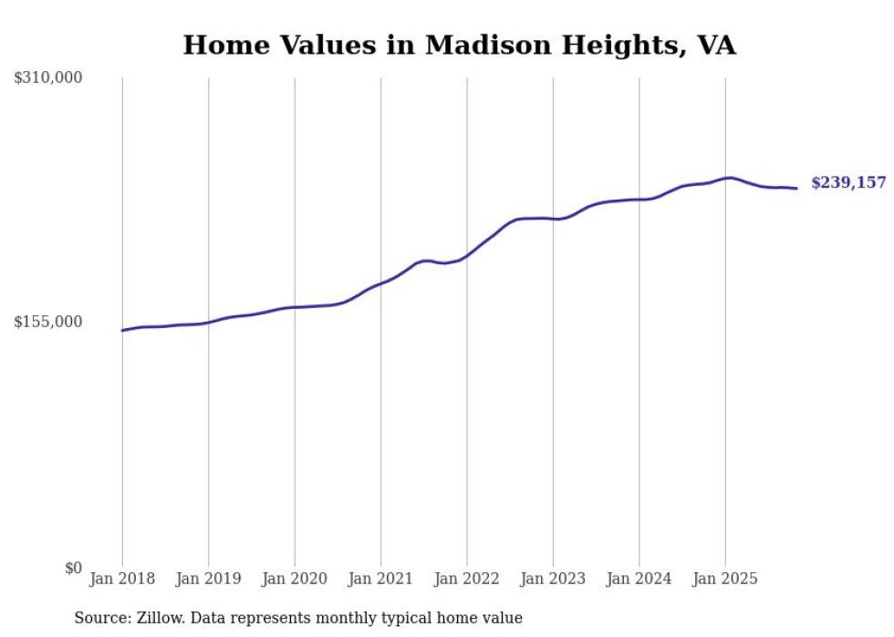 Stacker compiled a list of cities with the most expensive homes in the Lynchburg, VA metro area using data from Zillow. Charts show the monthly typical home value since January 2018.