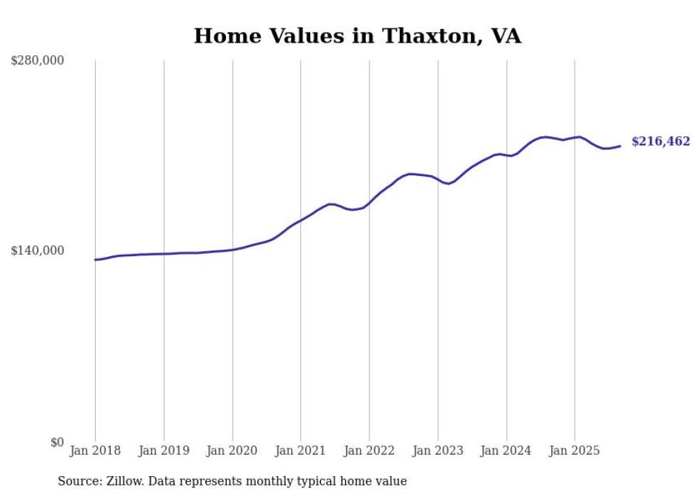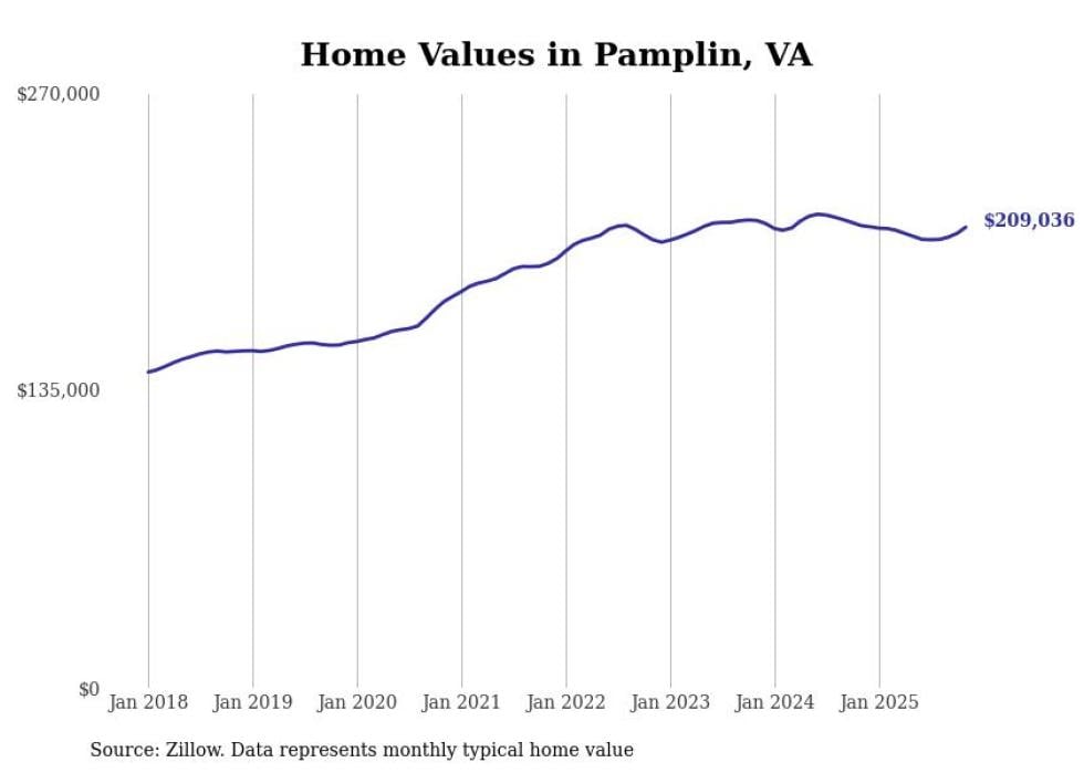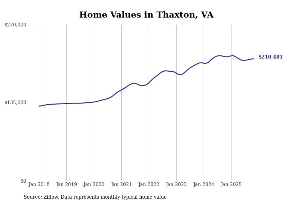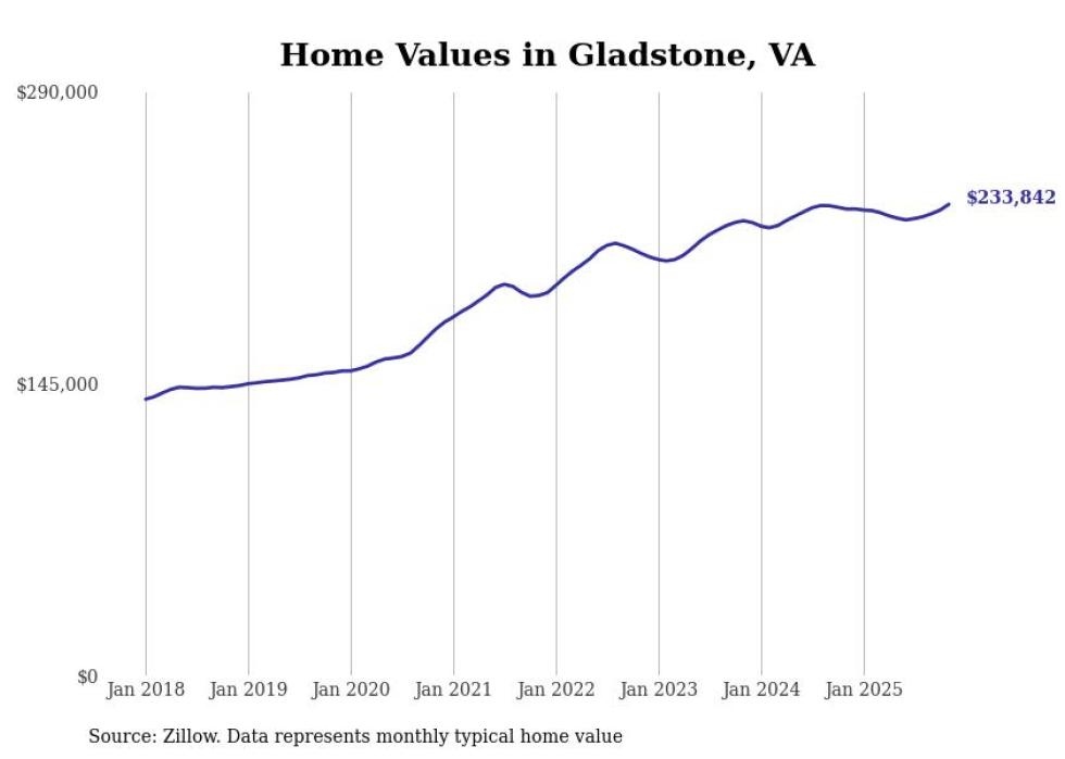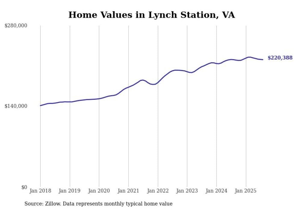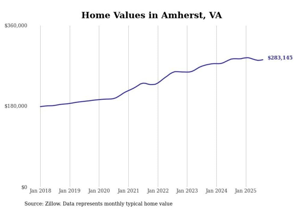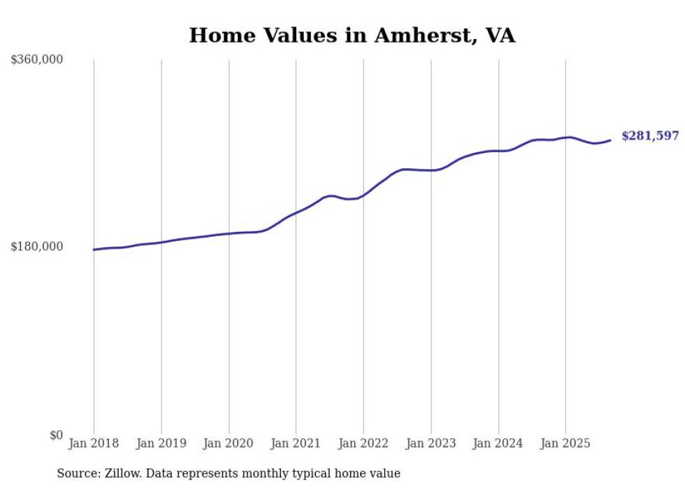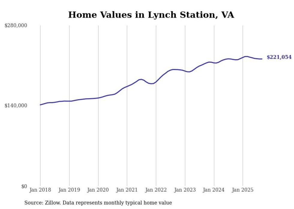 Stacker compiled a list of cities with the most expensive homes in the Lynchburg metro area using data from Zillow. Charts show the monthly typical home value since January 2018. All 28 cities and towns with data available were included in the list.