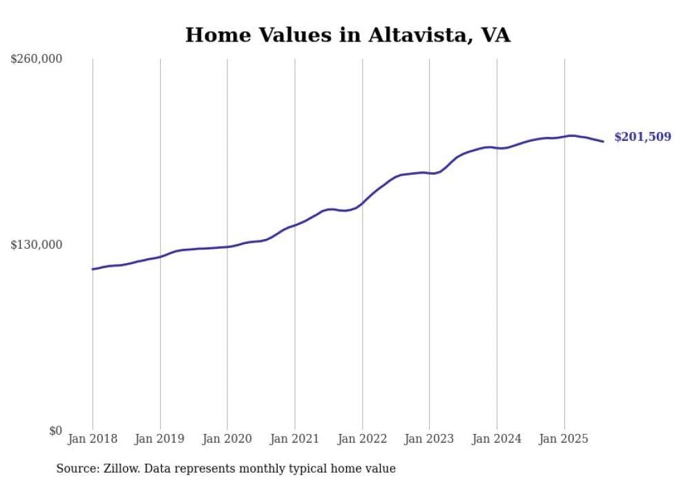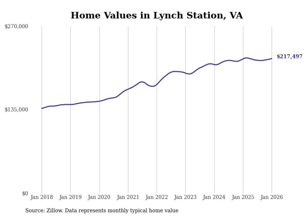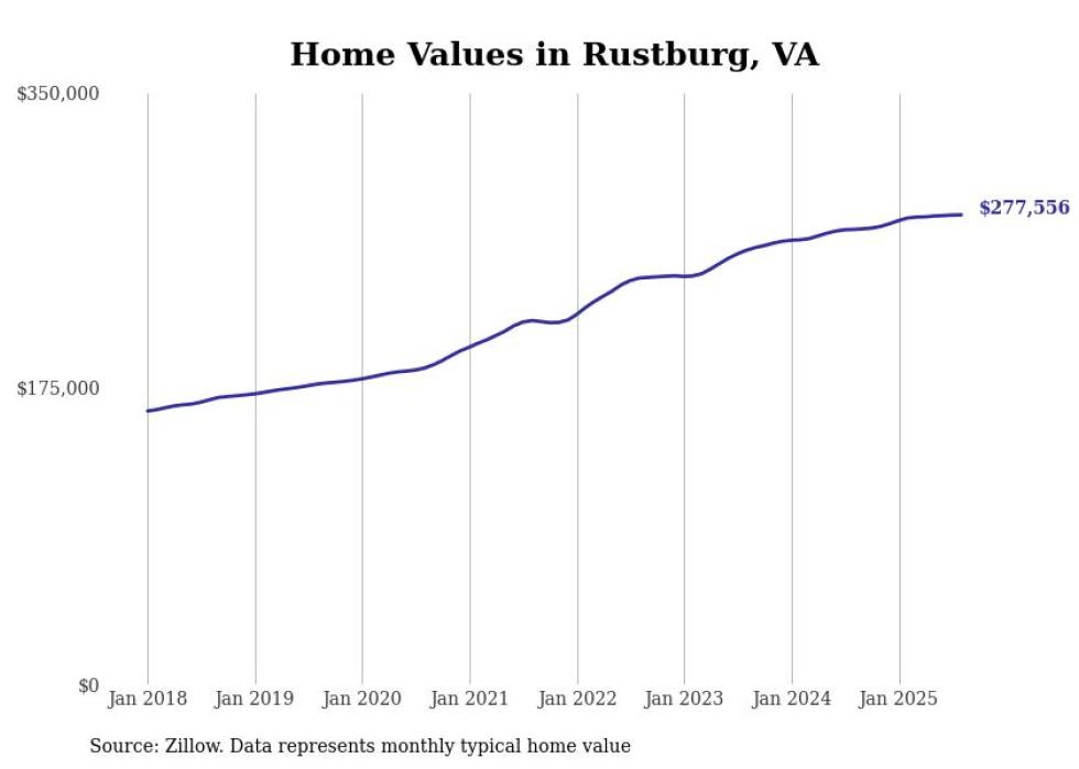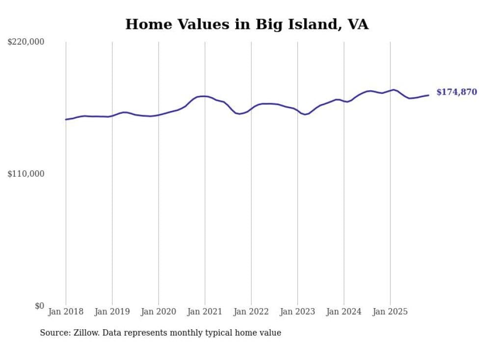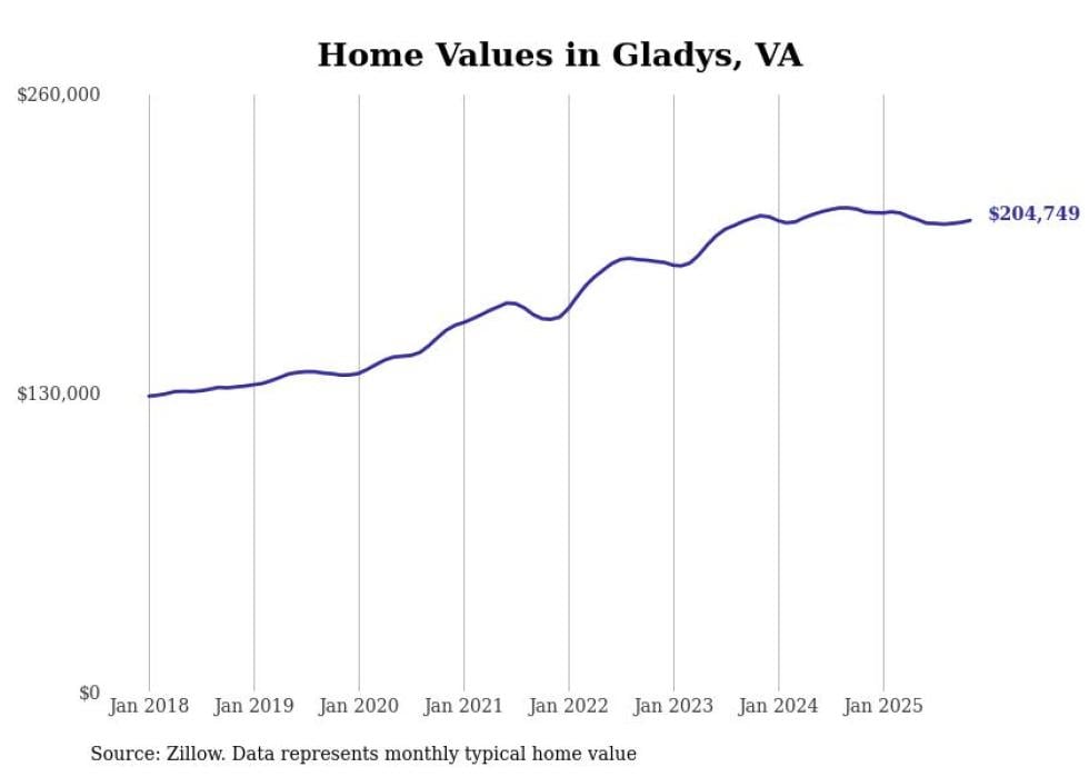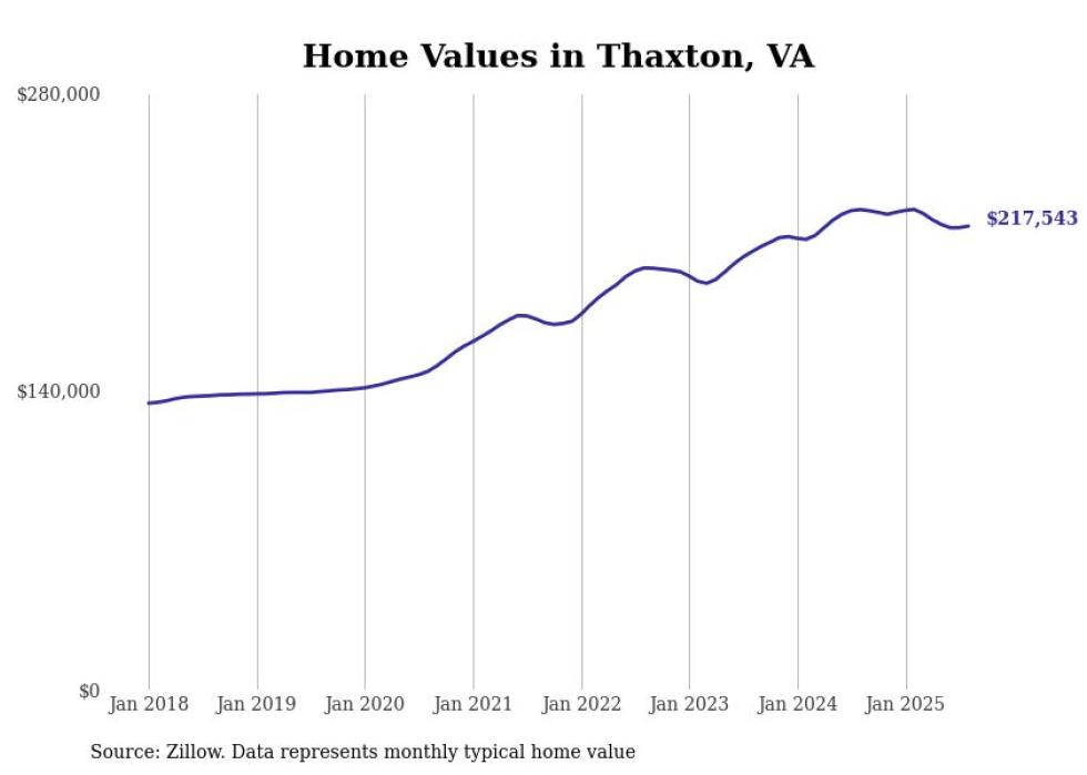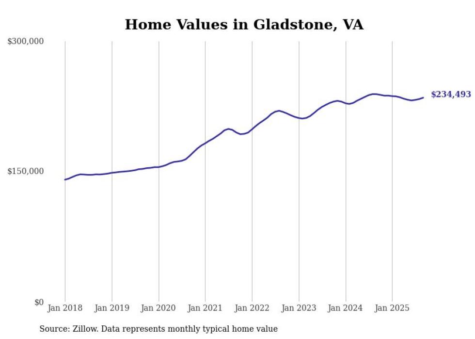Stacker compiled a list of cities with the most expensive homes in the Lynchburg metro area using data from Zillow. Charts show the monthly typical home value since January 2018. All 28 cities and towns with data available were included in the list.