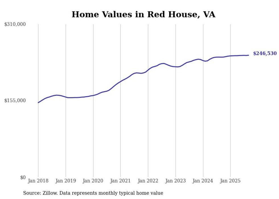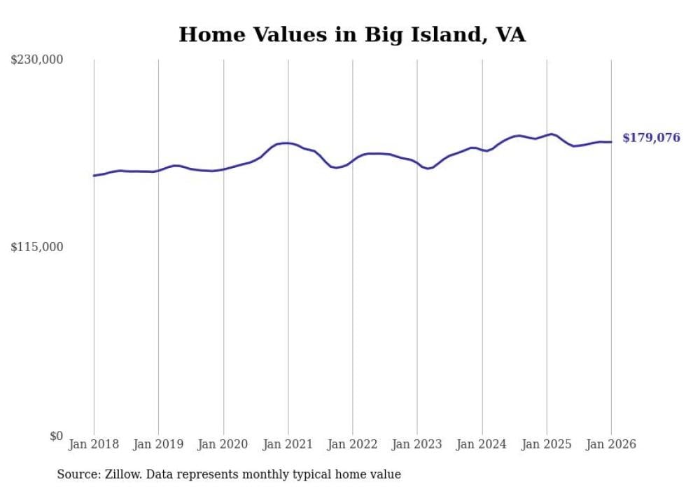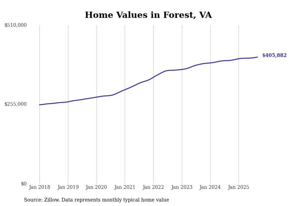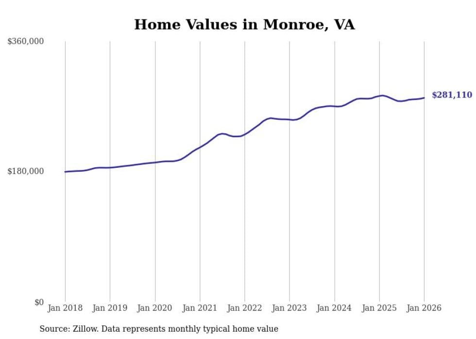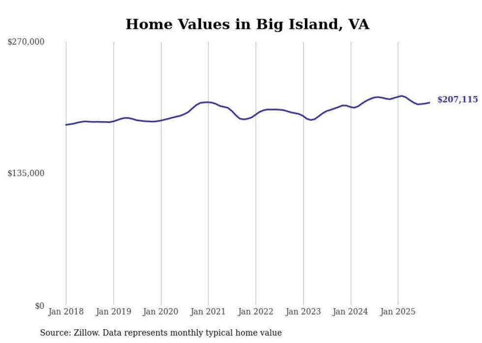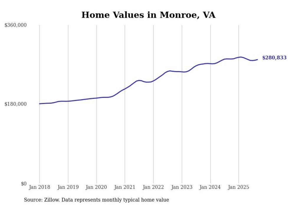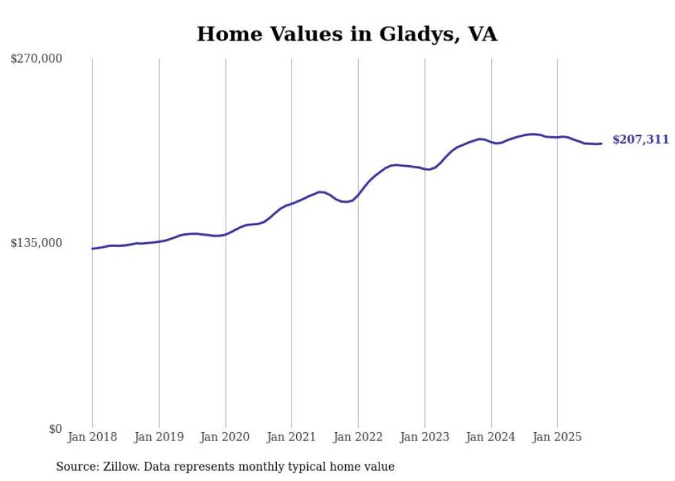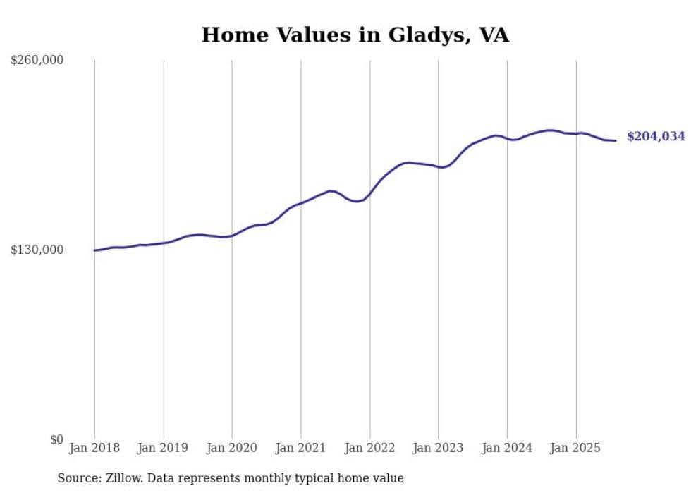 Stacker compiled a list of cities with the most expensive homes in the Lynchburg metro area using data from Zillow. Charts show the monthly typical home value since January 2018. All 28 cities and towns with data available were included in the list.