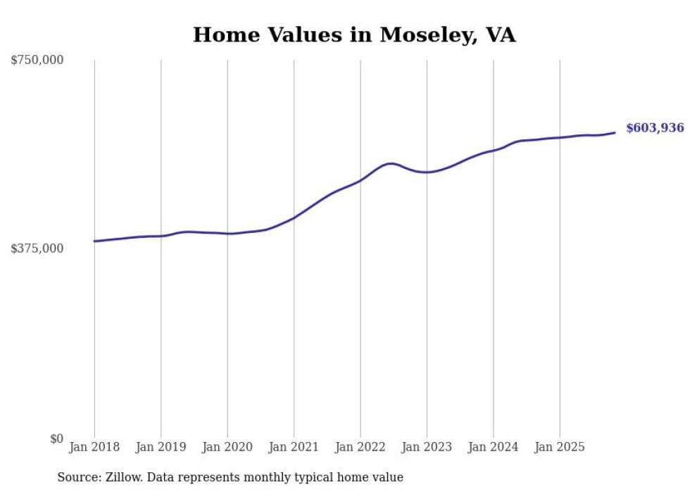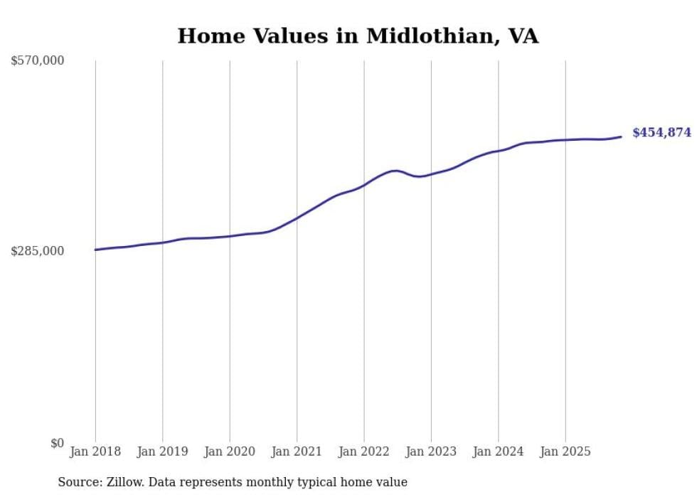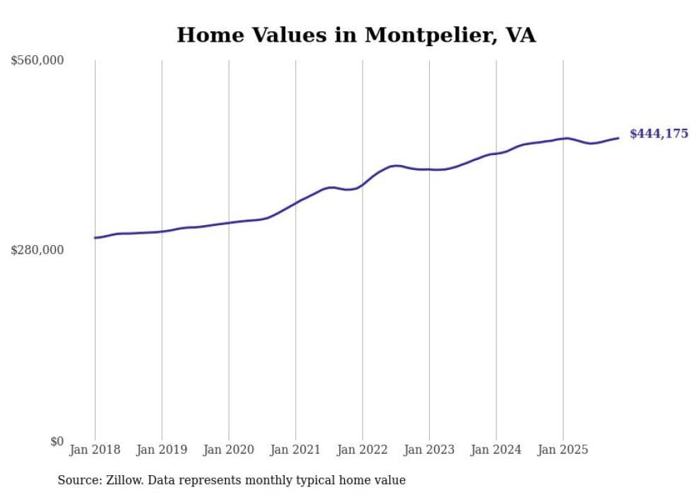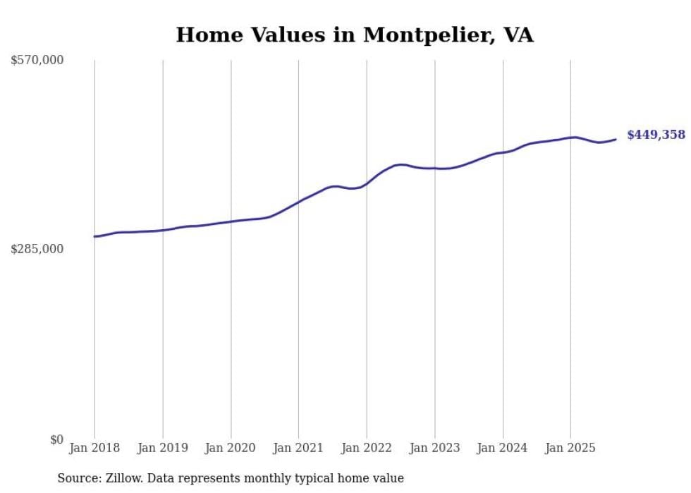 Stacker compiled a list of cities with the most expensive homes in the Richmond metro area using data from Zillow. Charts show the monthly typical home value since January 2018. Data was available for 66 cities and towns.