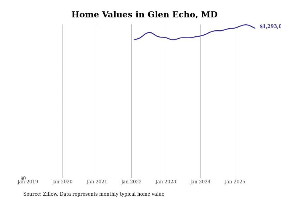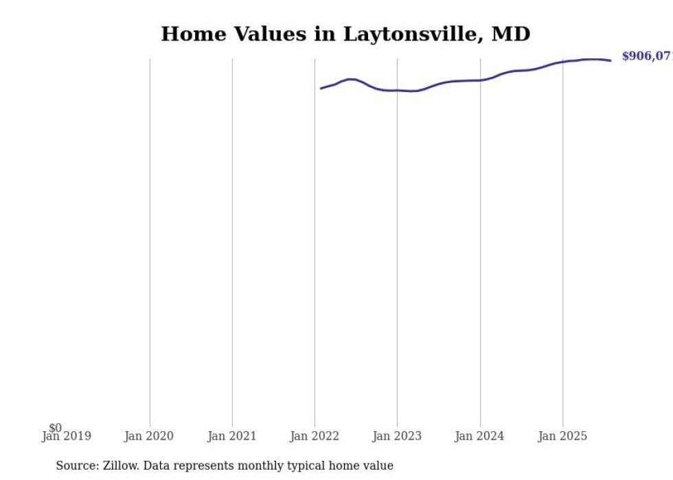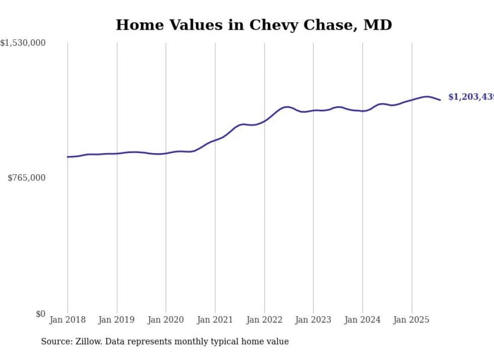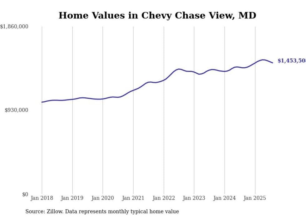 Stacker compiled a list of cities with the most expensive homes in the Washington, D.C. metro area using data from Zillow. Charts show the monthly typical home value since January 2018. Data was available for 233 cities and towns.