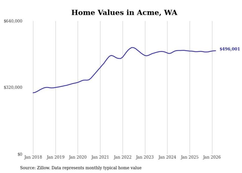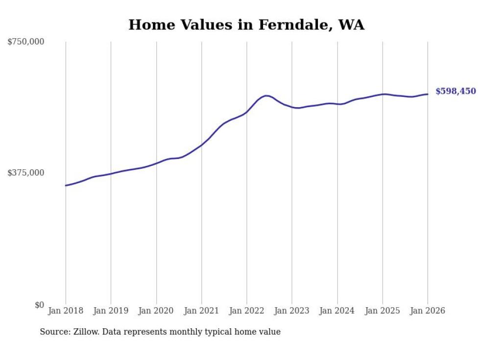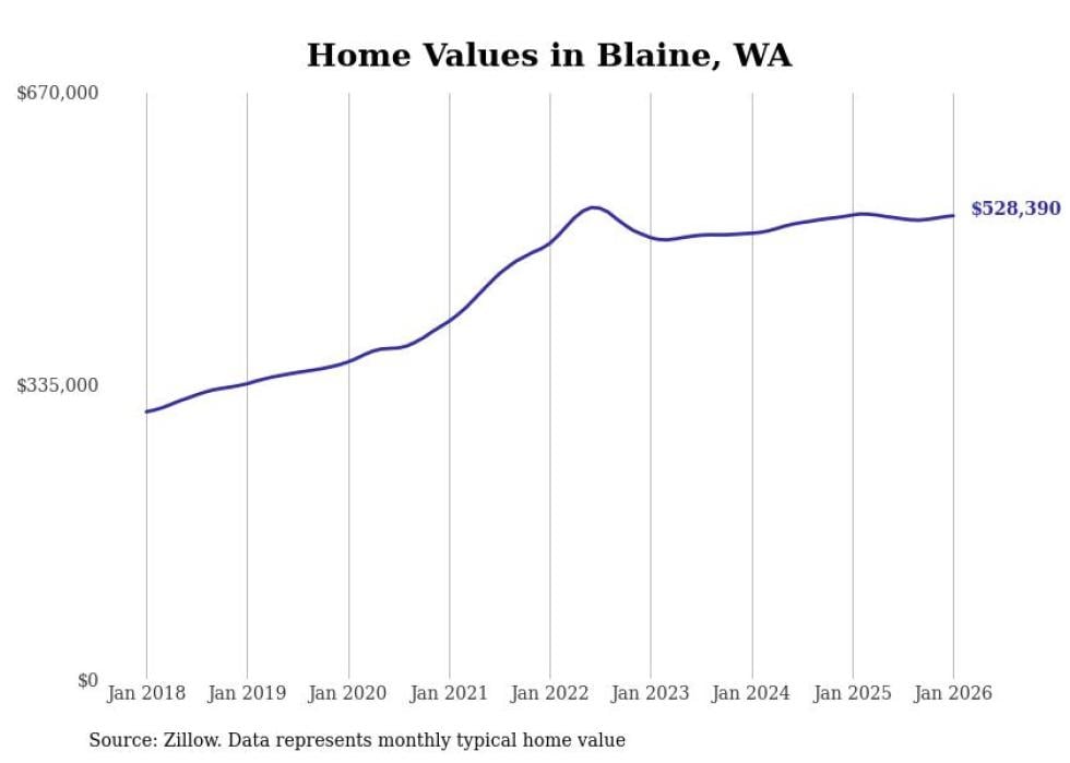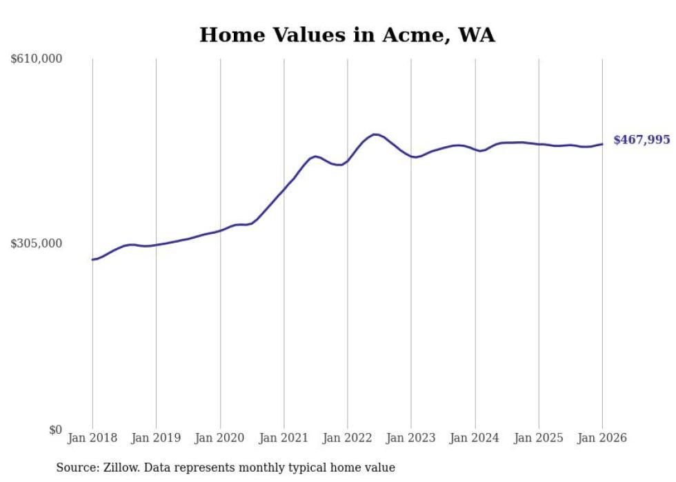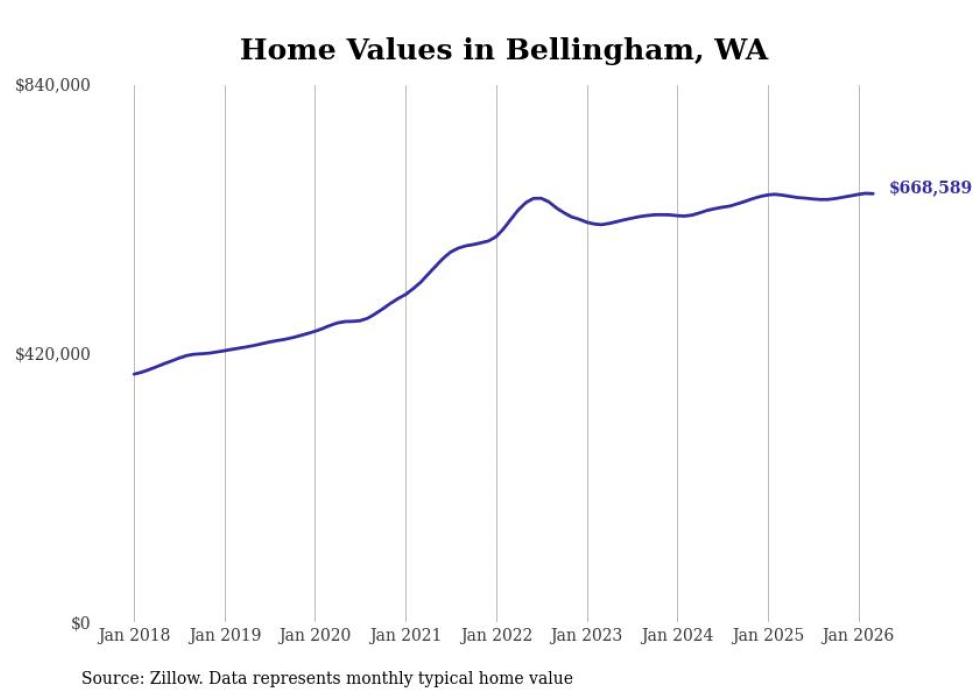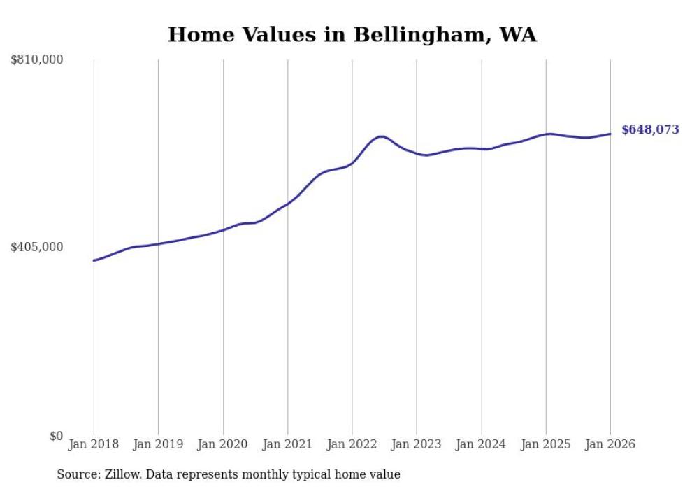 Stacker compiled a list of cities with the most expensive homes in the Bellingham metro area using data from Zillow. Charts show the monthly typical home value since January 2018. All 14 cities and towns with data available were included in the list.
