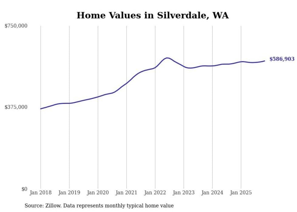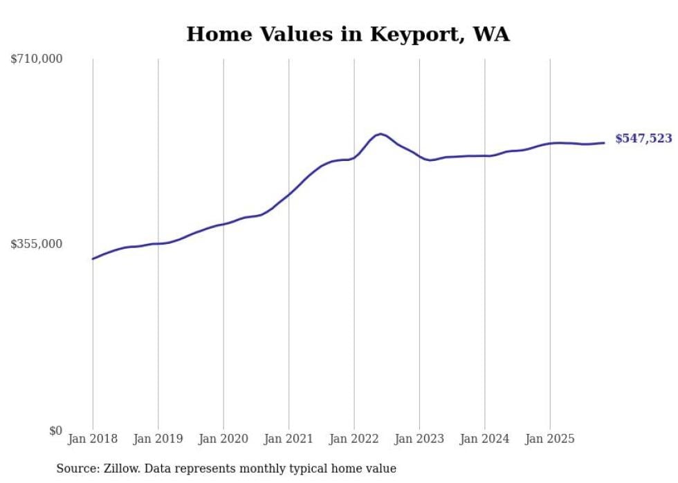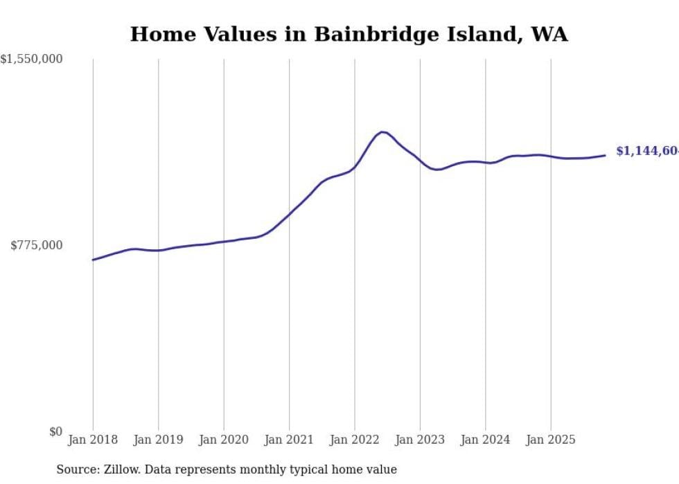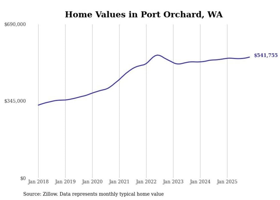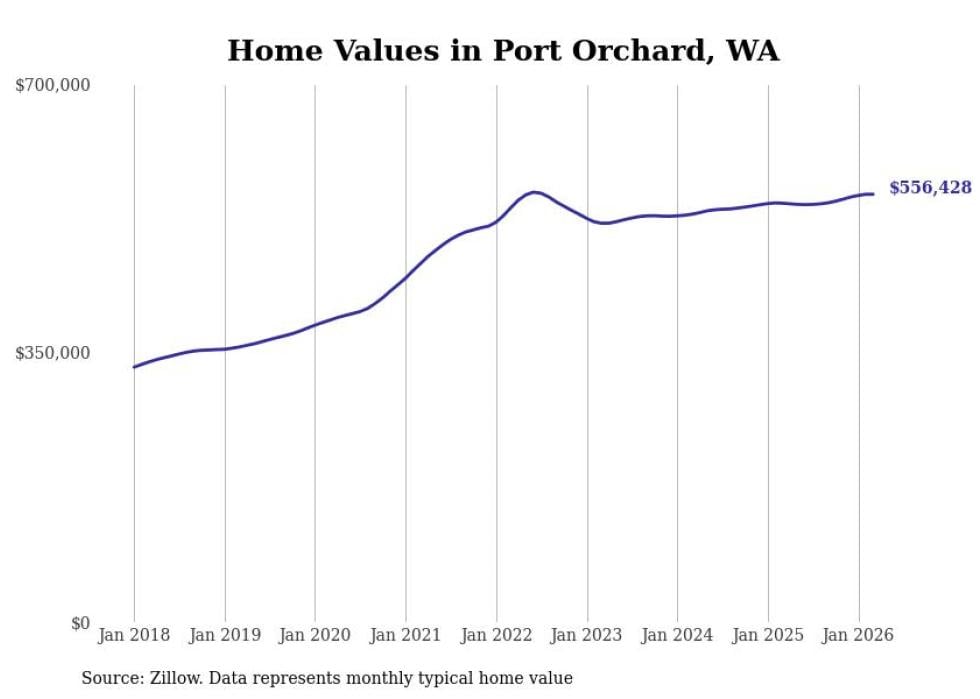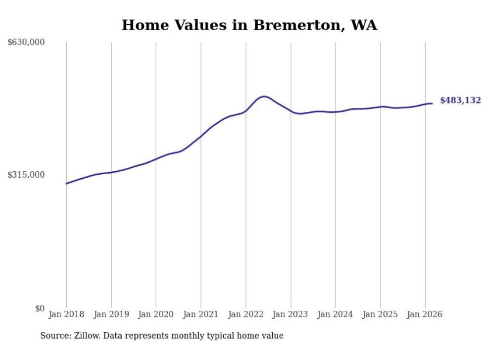 Stacker compiled a list of cities with the most expensive homes in the Bremerton metro area using data from Zillow. Charts show the monthly typical home value since January 2018. All 12 cities and towns with data available were included in the list.