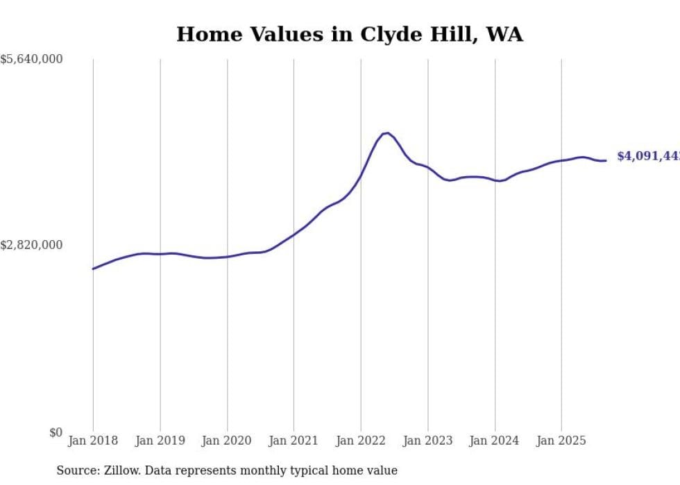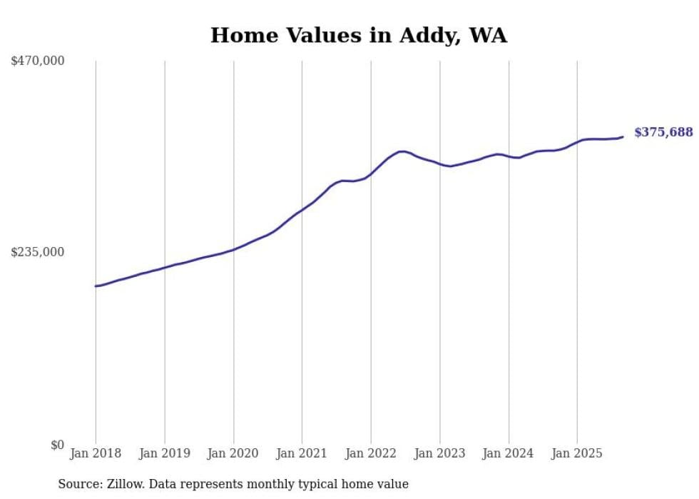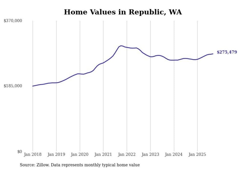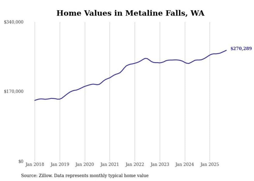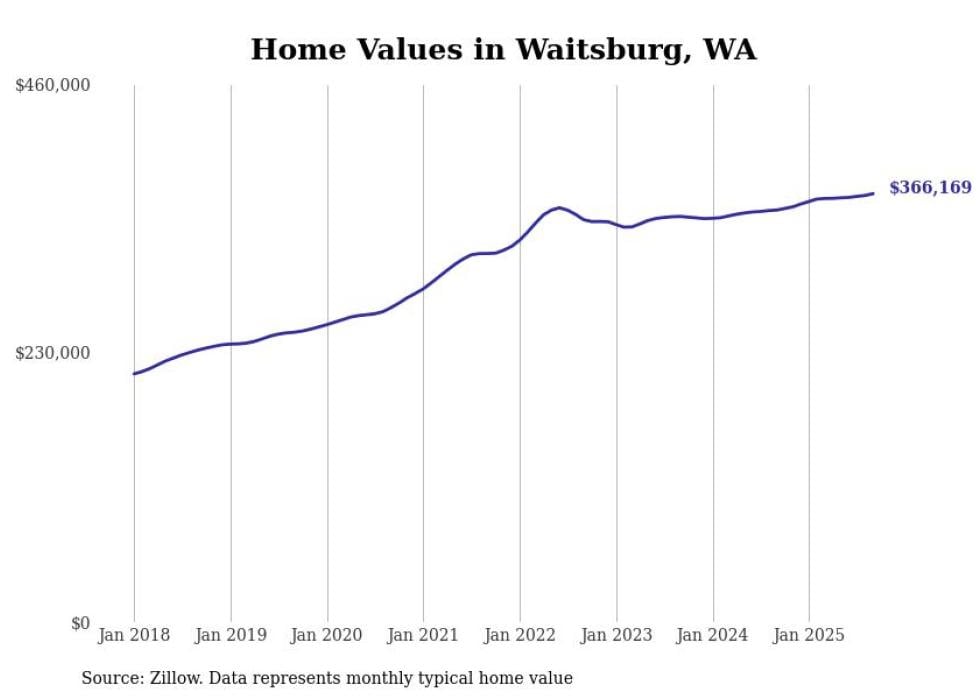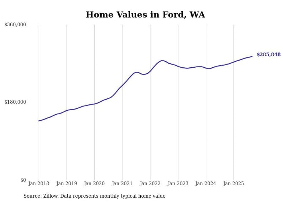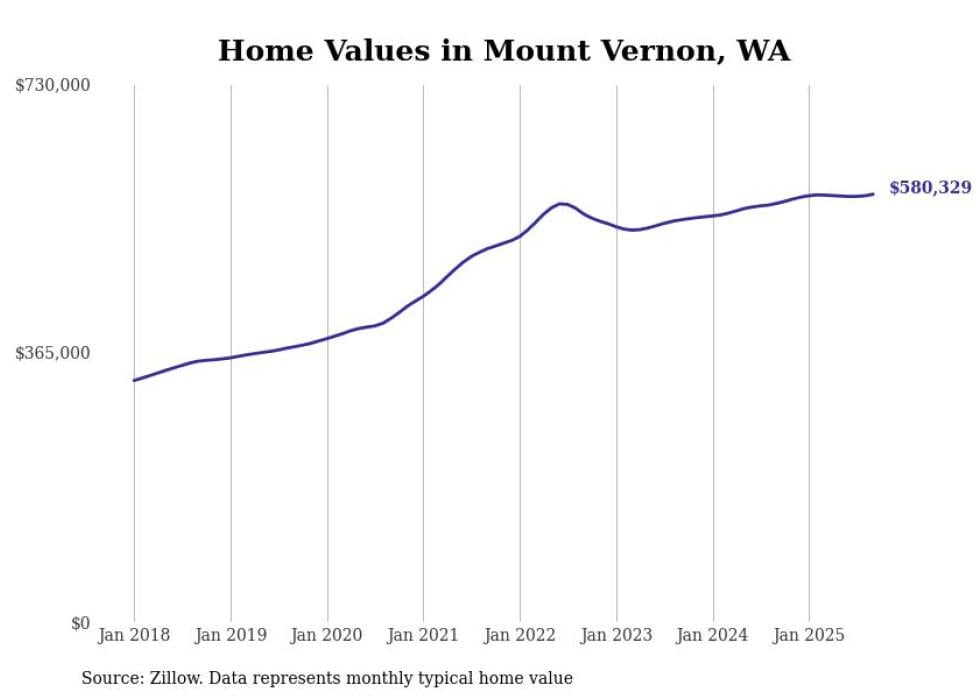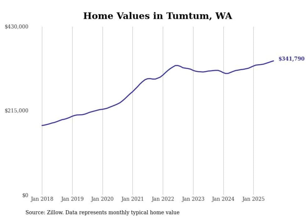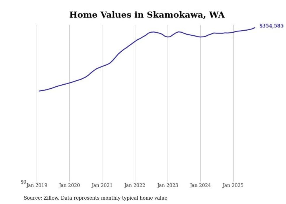 Stacker compiled a list of cities with the fastest-growing home prices in Washington using data from Zillow. Cities are ranked by the dollar change in the Zillow Home Values Index for all homes from the 12 months ending September 2025. The charts in this story were created automatically using Matplotlib. Data was available for 50 cities and towns in Washington.